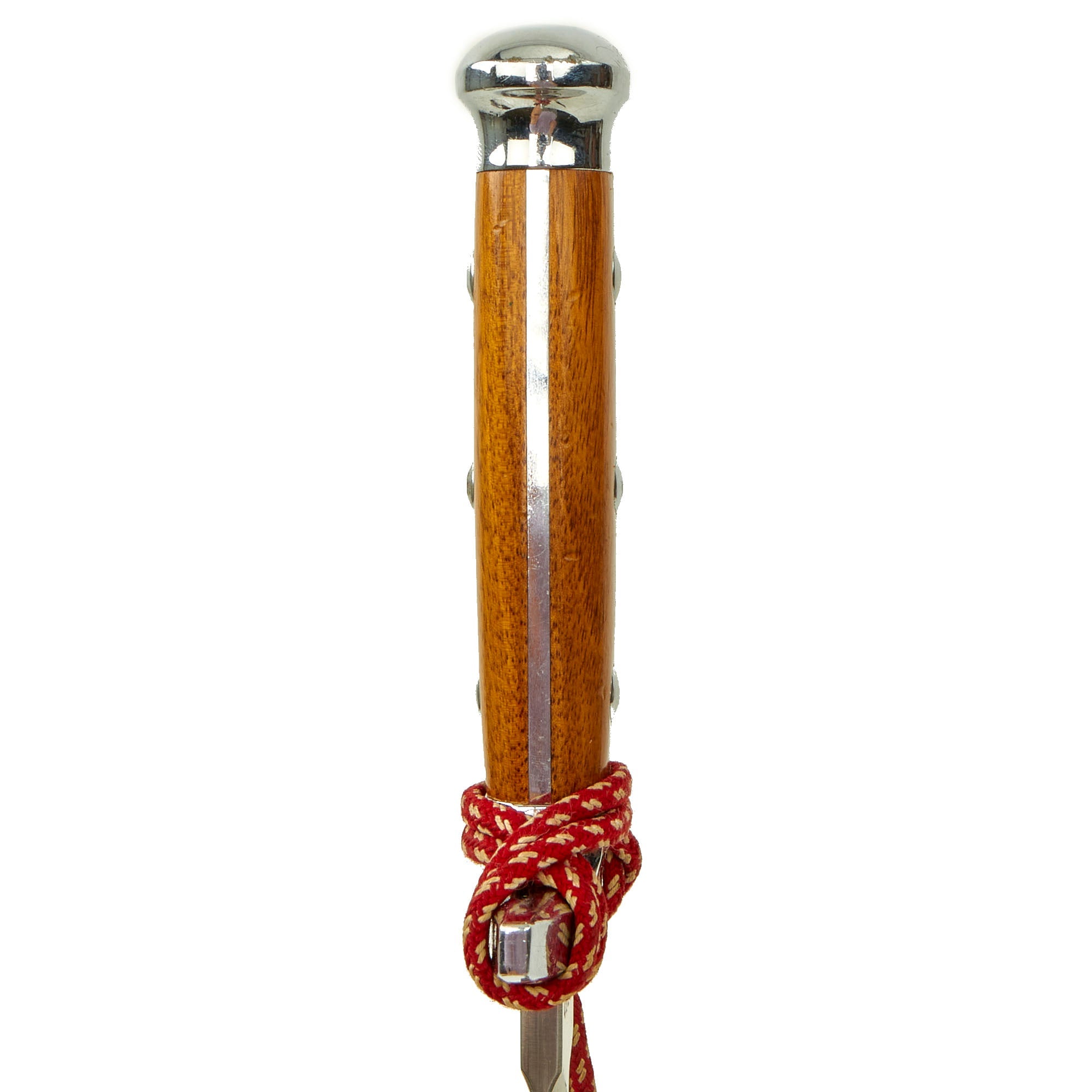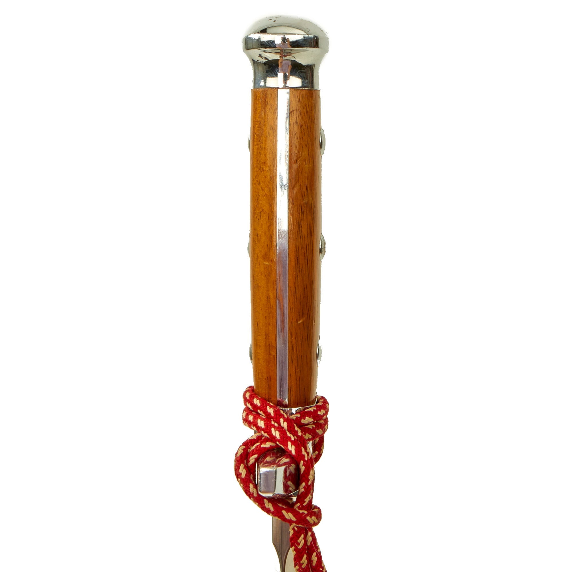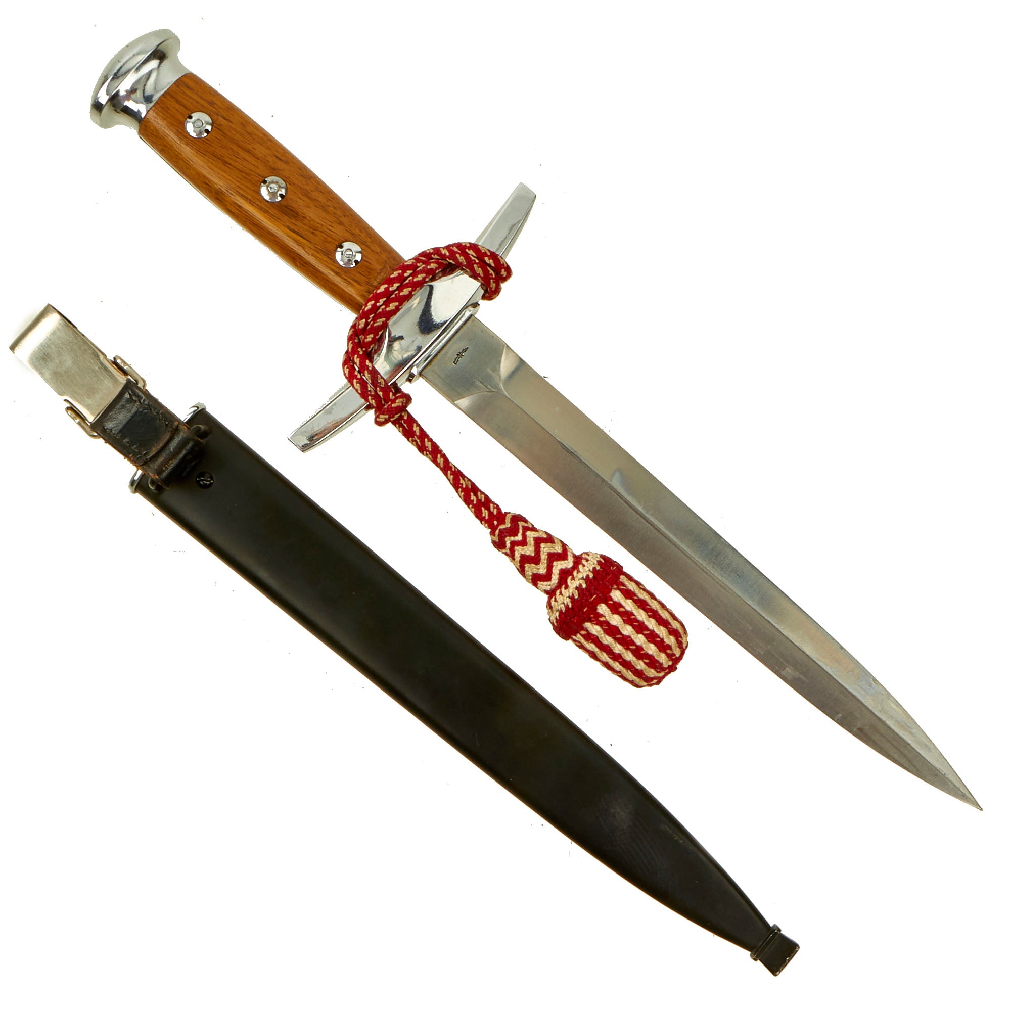 The dagger features a spear point double edged blade, with a "stiletto" dagger type profile showing a center ridge. This is attached to a nickel plated alloy handle with a wide crossguard, fitted with fruit wood grips secured by three bolts with split nuts. The pommel is secured by a keyed nut. The dagger is in excellent condition, showing only light wear from storage, and the blade still shows virtually all of the original factory final grind cross grain, very similar to those on German WWII daggers. The original edge is still present and sharp. With the total absence of rust, we believe the blade is most likely Stainless Steel, the material usually used to make these daggers.