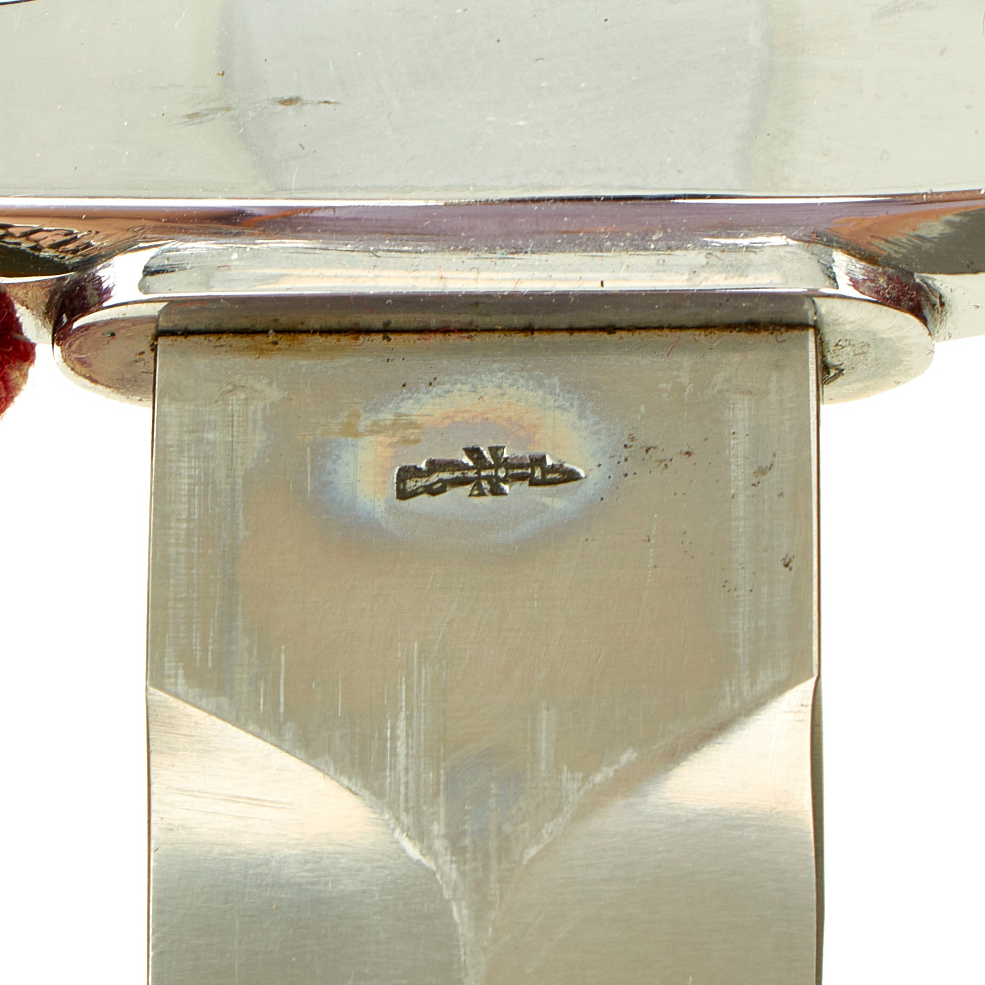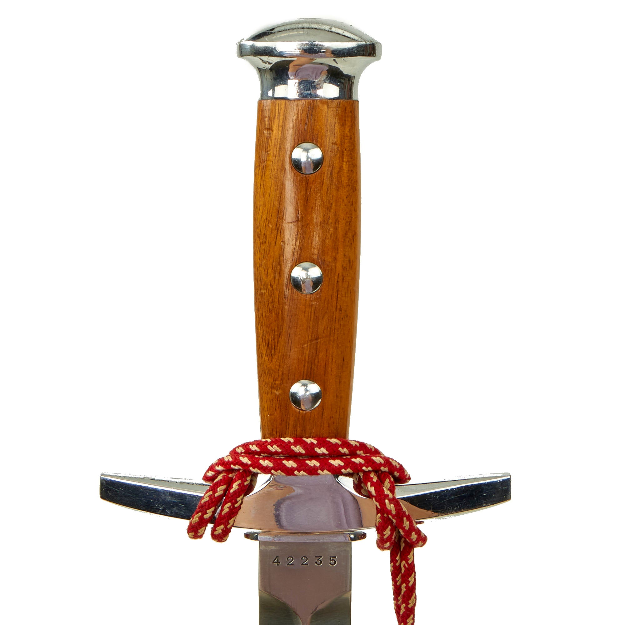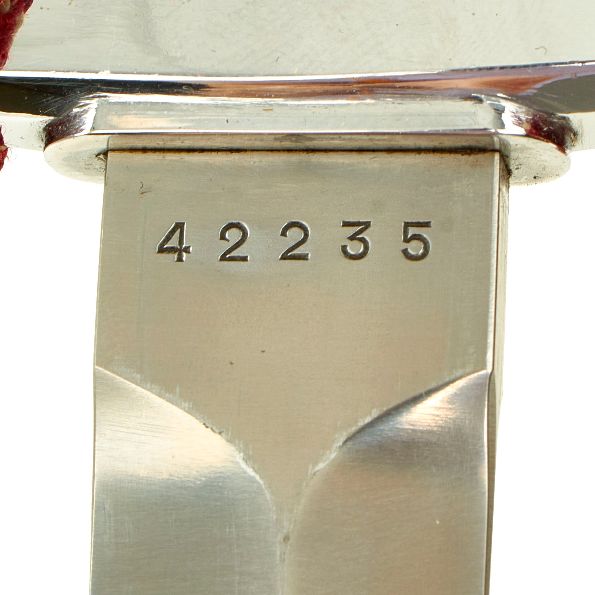 Original Item: Only One Available. This is an excellent example of the Swiss Model 1943 Officer's Dagger, complete with the original scabbard and red / white portepee. As with other examples we have seen, it is marked on the blade ricasso with serial number 42235, with maker “Rifle N” (SIG Neuhausen) marked on the other side which is also sometimes marked with just the letter N without the rifle.