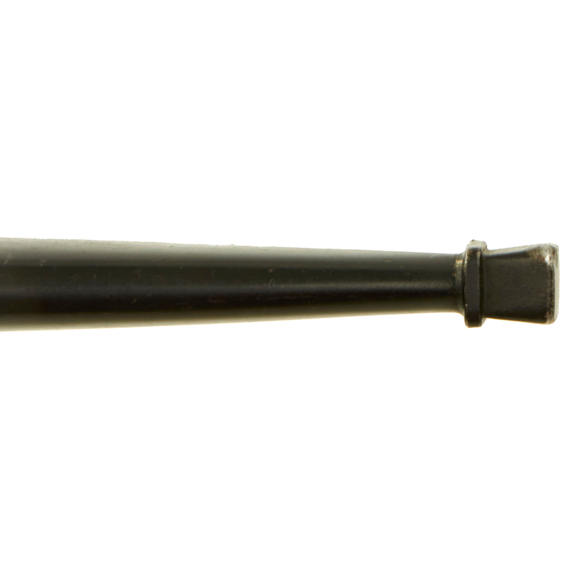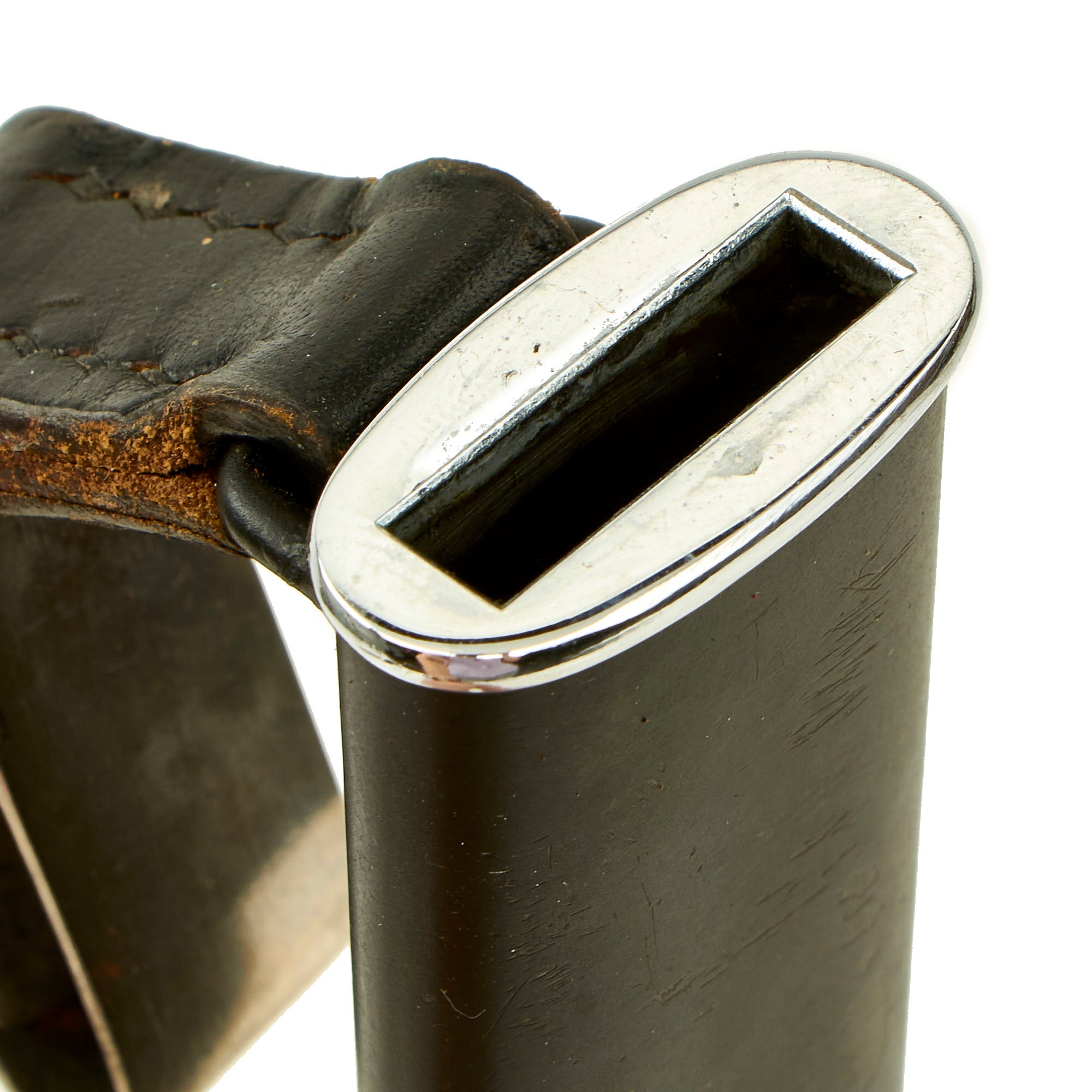 The steel scabbard is also in great shape, showing almost no wear with the black enamel finish retained at nearly 100%, with just a bit of chipping around the square bottom knob. The rear of the scabbard is stamped another "Rifle N" marking, as SIG Neuhausen made their own scabbards. Above this is the leather hanger strap with a nickel silver buckle, which shows a bit of verdigris from age and contact with the leather.