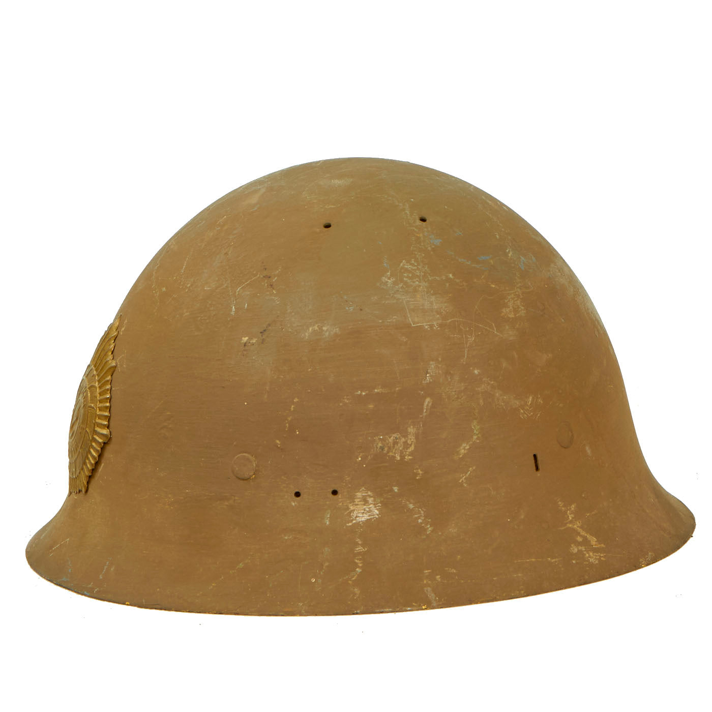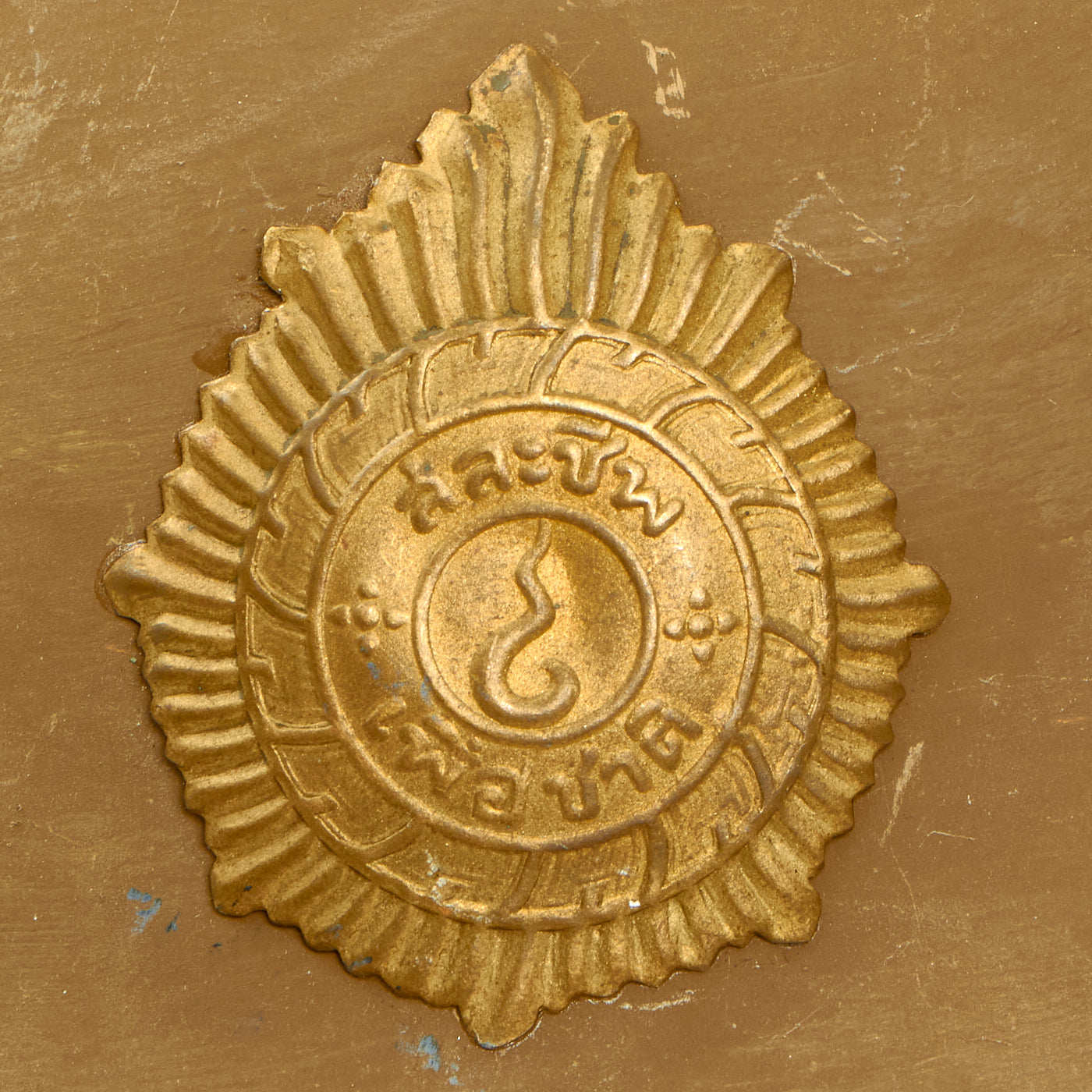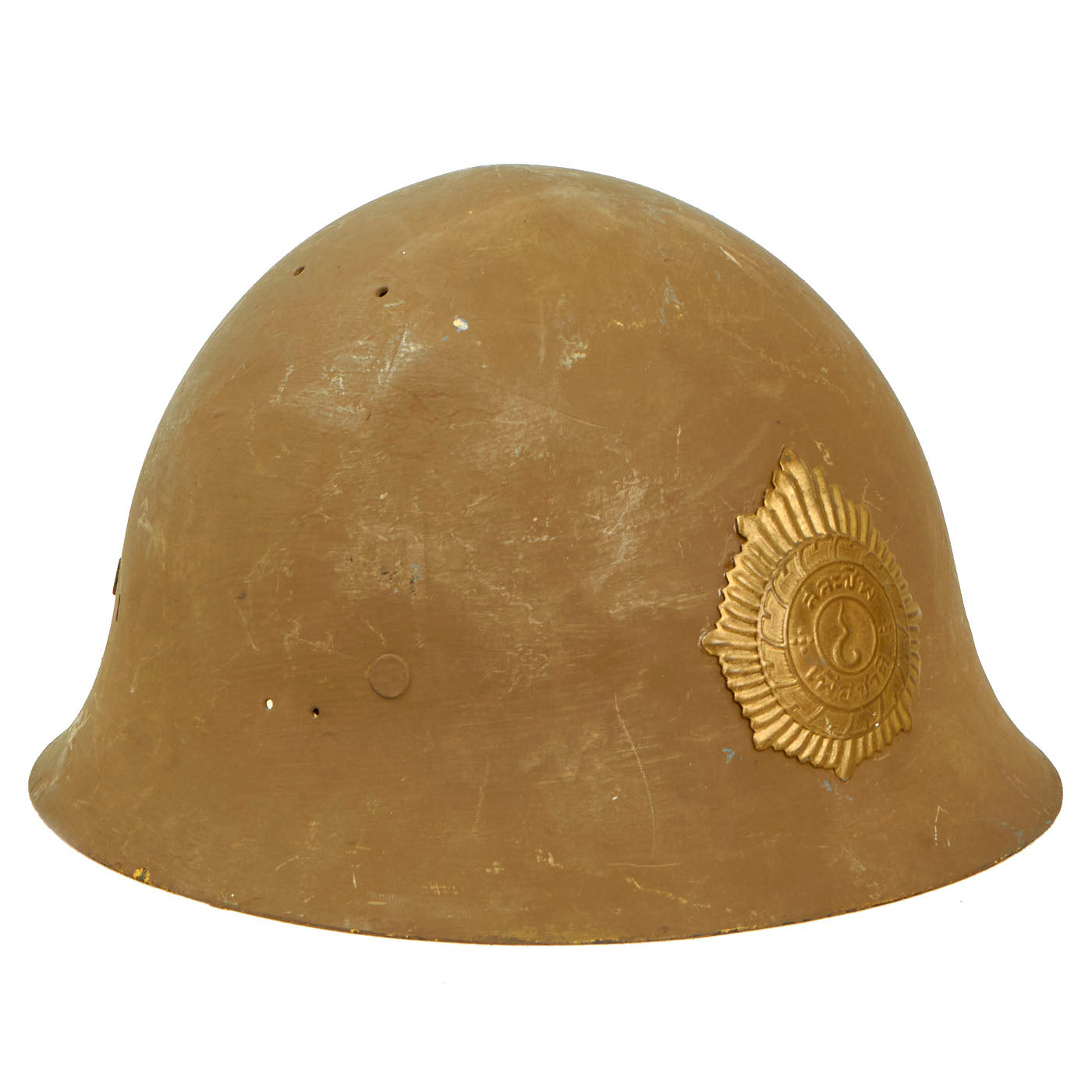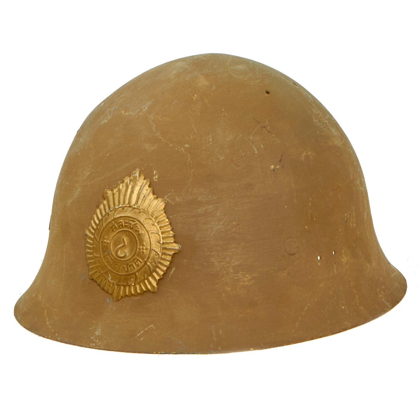 Original Item: Only One Available. During WWII Thailand held some of largest Japanese Military bases. If you were a nation occupied by the Japanese in WWII you find yourself awash in Japanese military materiel upon their surrender. Suddenly your army (such as it is) has lots of helmets. During WW2 these helmet were re-issued to the Thai army standard helmet with symbol "Chankra" (Inscription in Thai : "Sacrifice for fatherland") and interior was altered to accept an American style suspension system which is held in place by a series of triangular “A” washers.