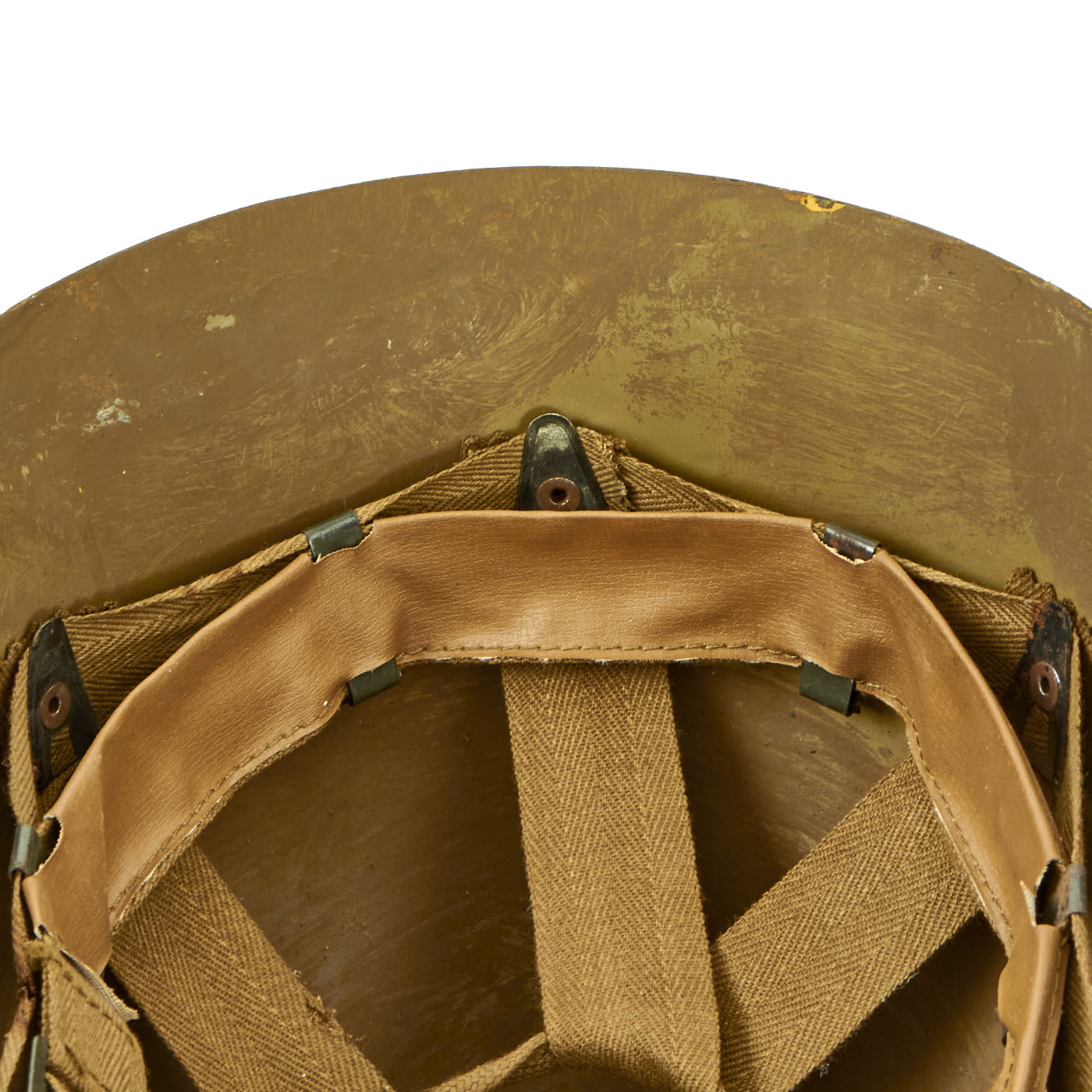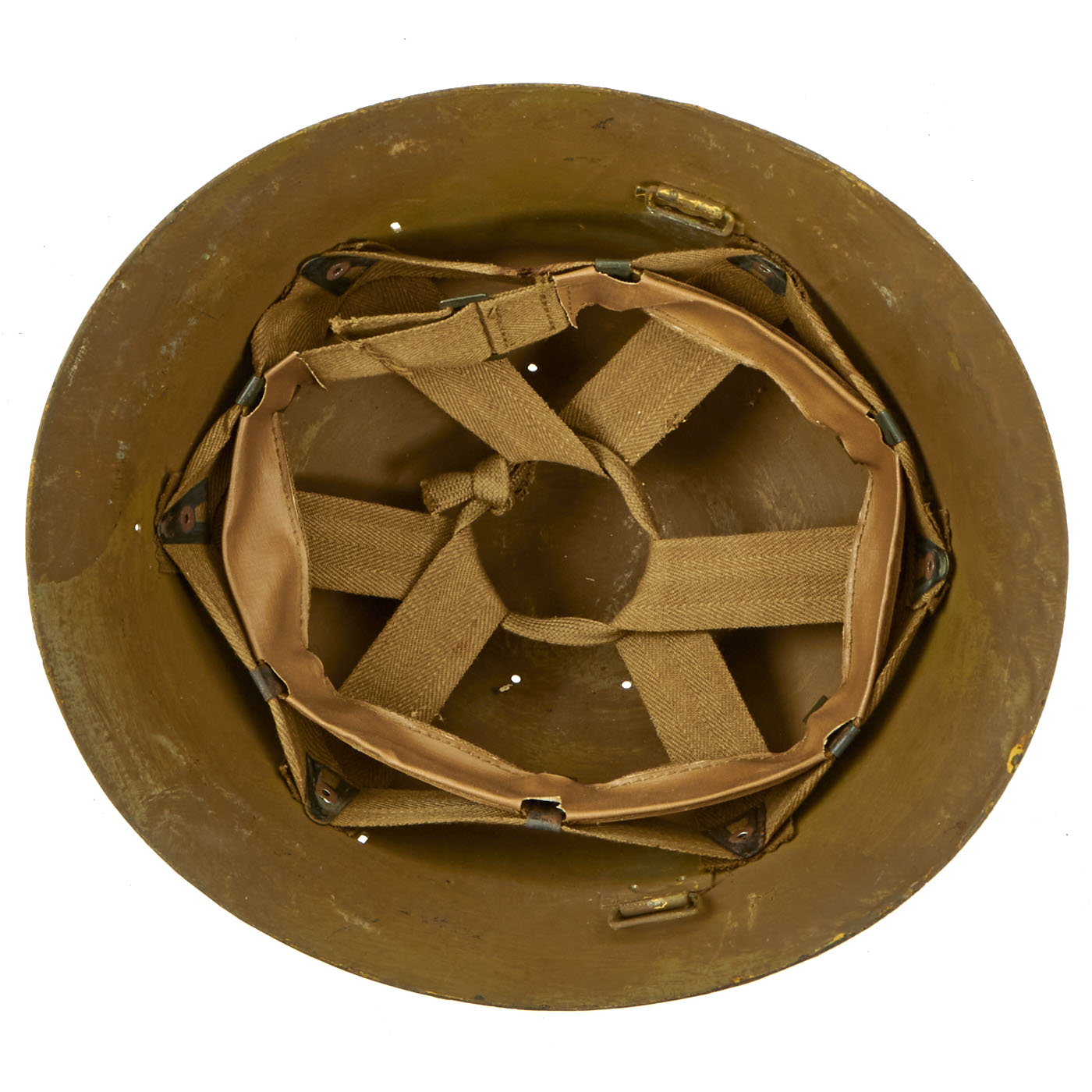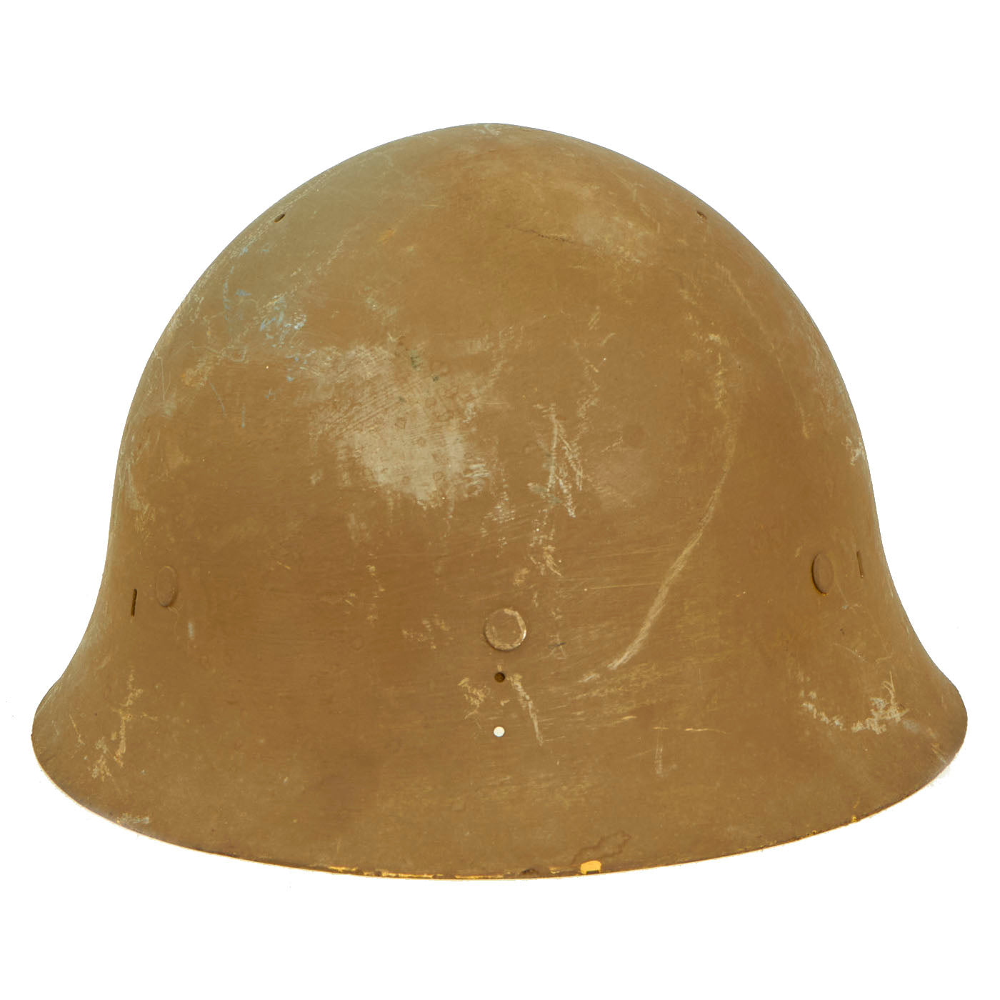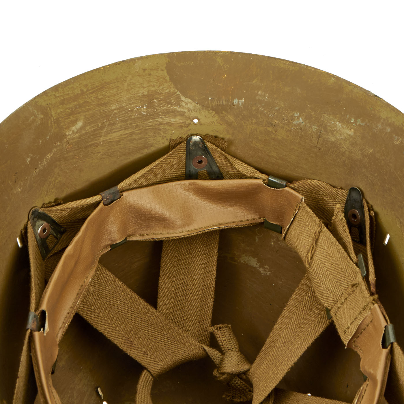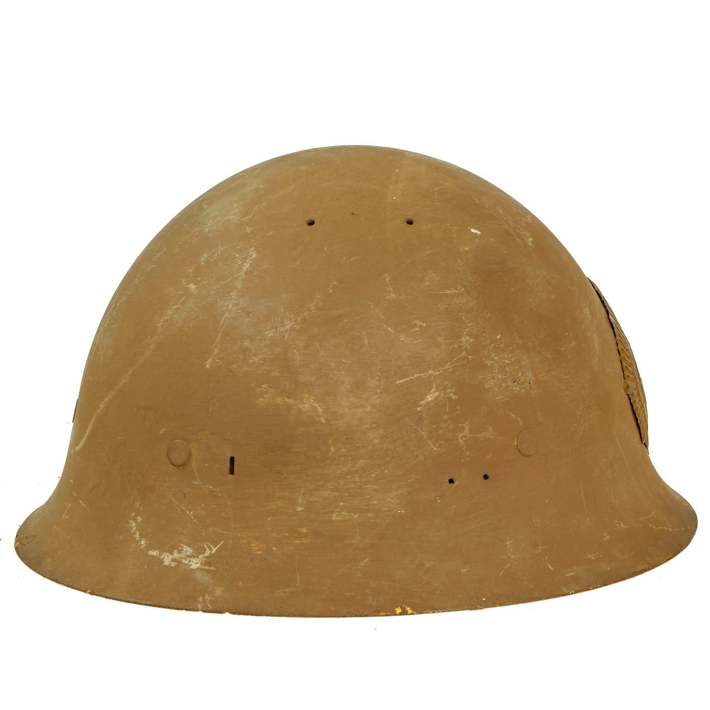 Original Item: Only One Available. During WWII Thailand held some of largest Japanese Military bases. If you were a nation occupied by the Japanese in WWII you find yourself awash in Japanese military materiel upon their surrender. Suddenly your army (such as it is) has lots of helmets. During WW2 these helmet were re-issued to the Thai army standard helmet with symbol "Chankra" (Inscription in Thai : "Sacrifice for fatherland") and interior was altered to accept an American style suspension system which is held in place by a series of triangular “A” washers.