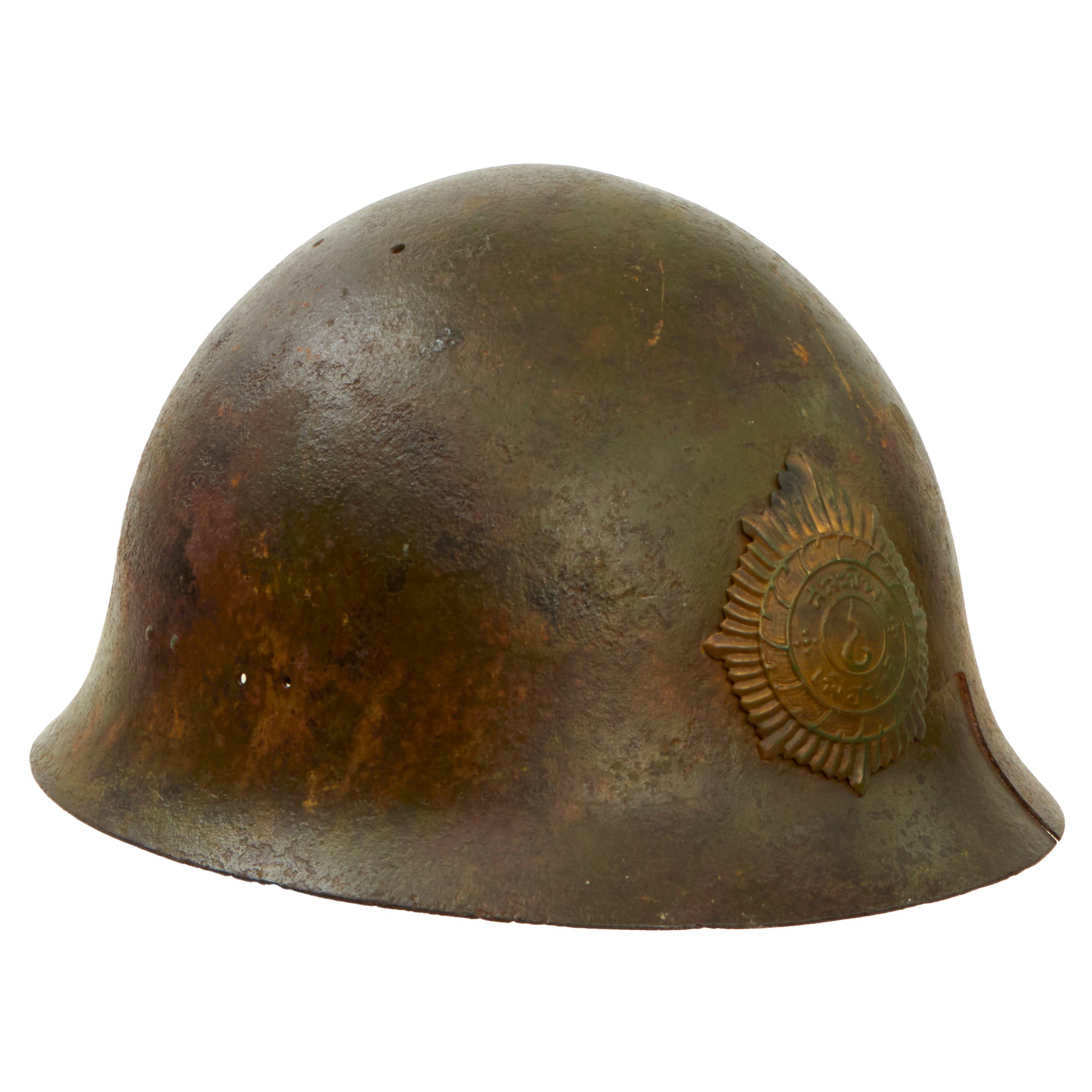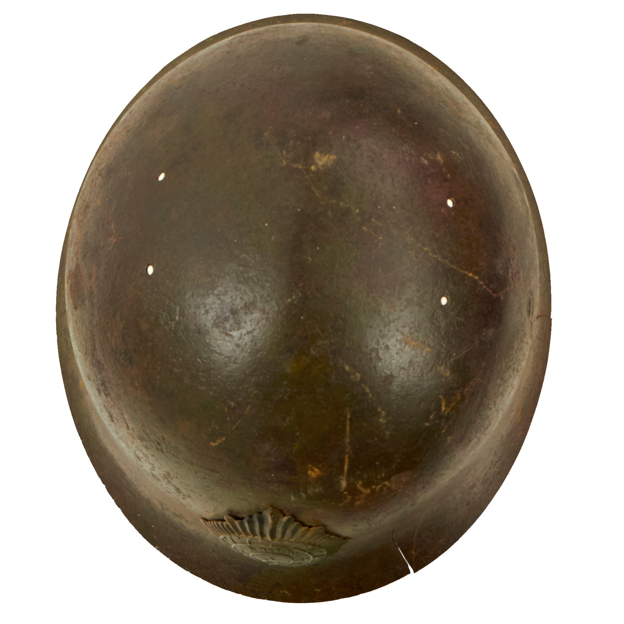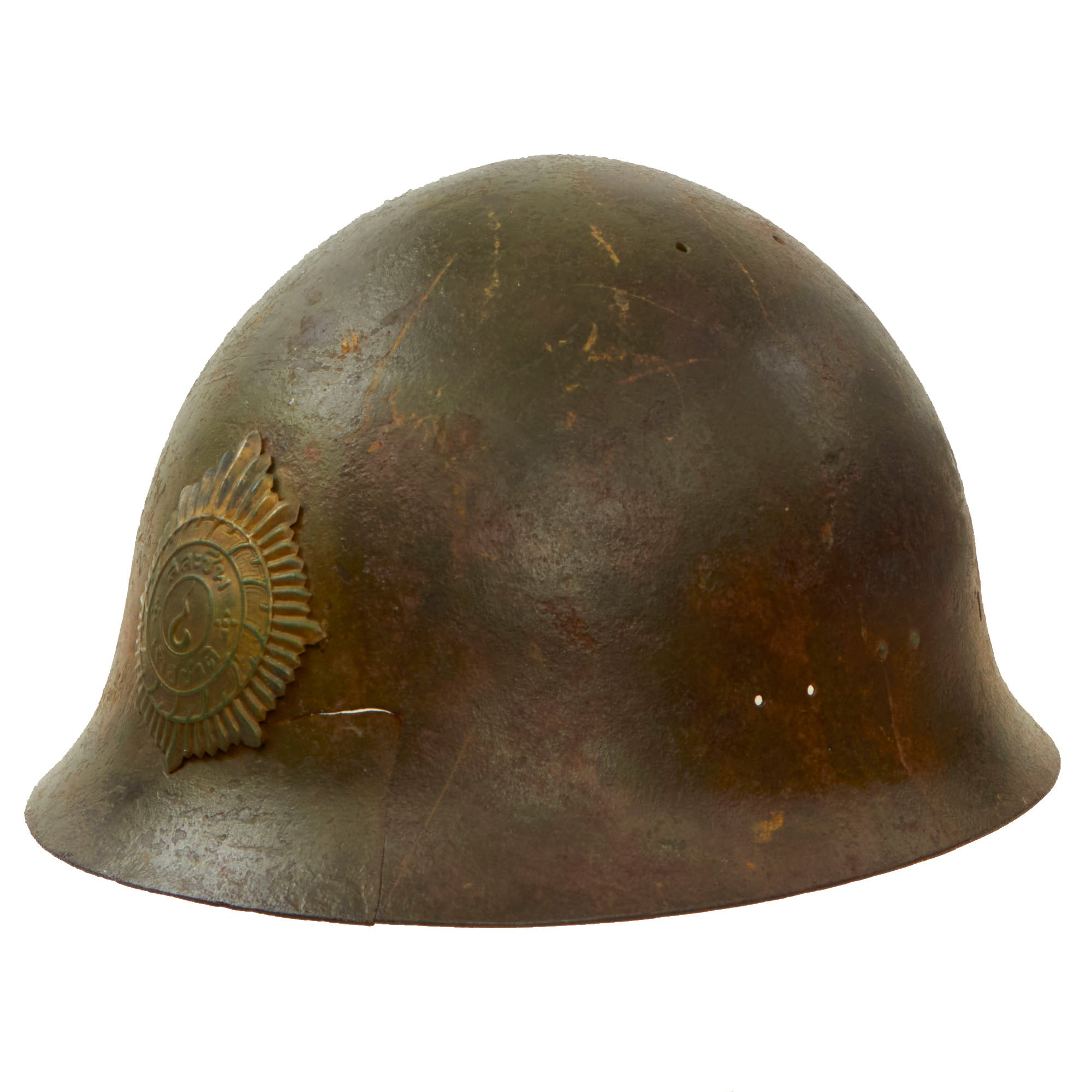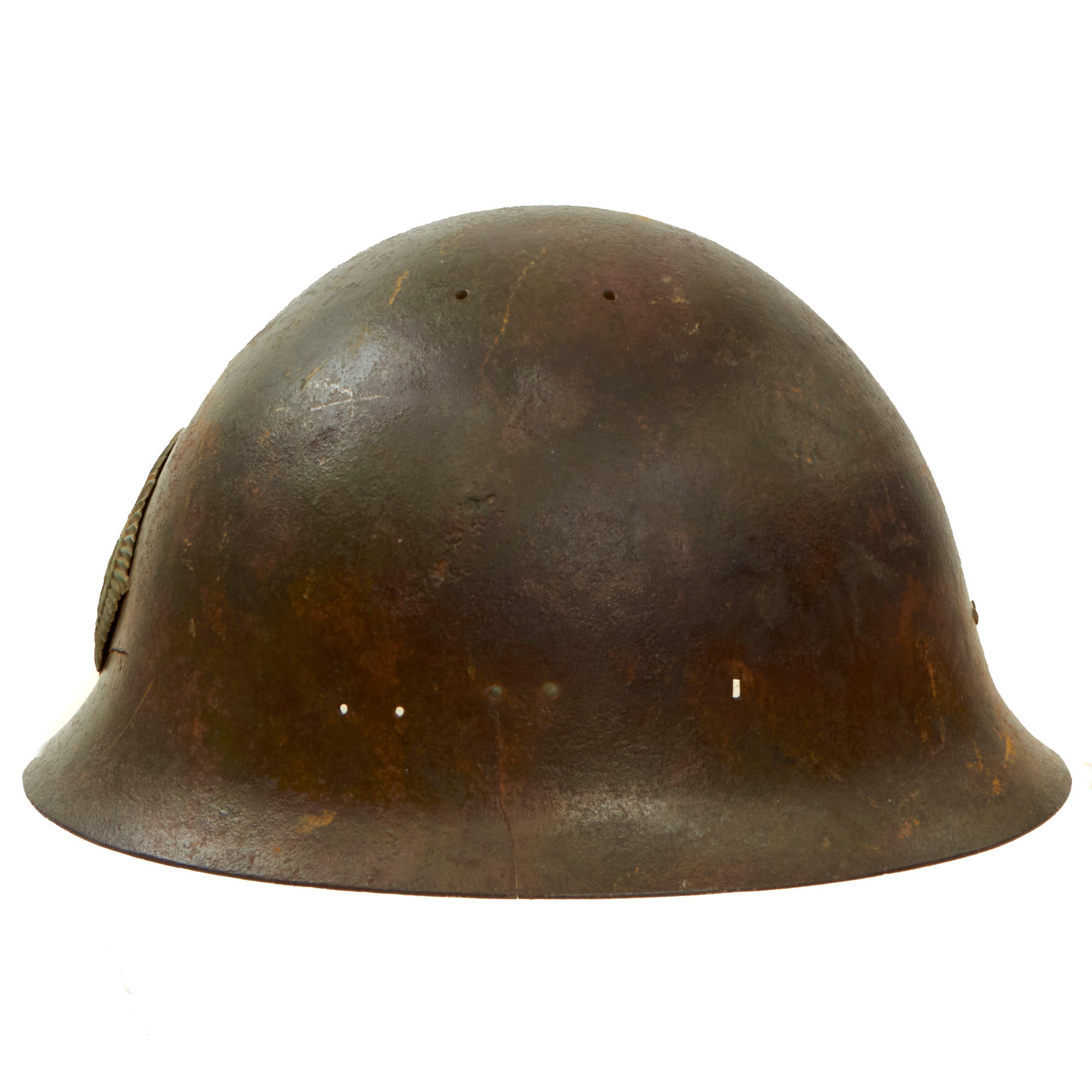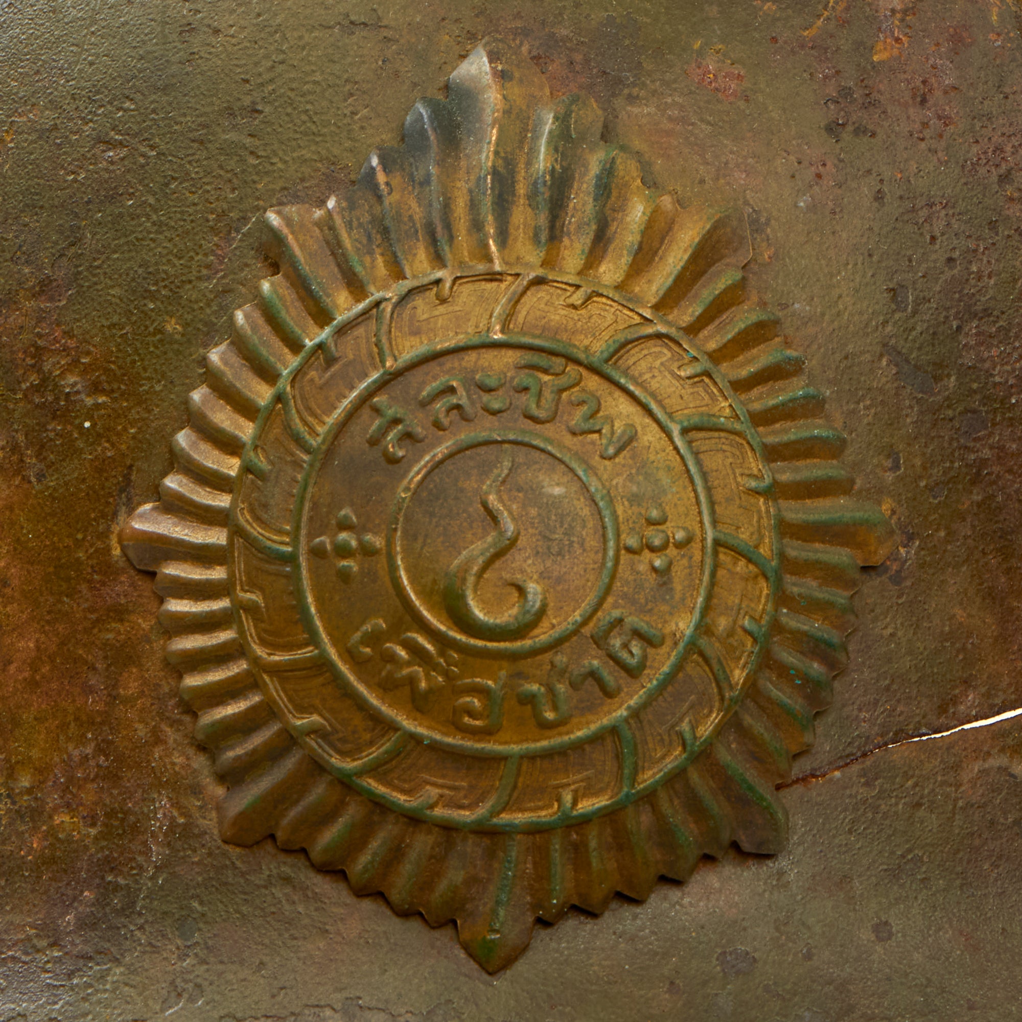 Original Item: Only One Available. During WWII Thailand held some of largest Japanese Military bases. If you were a nation occupied by the Japanese in WWII you find yourself awash in Japanese military materiel upon their surrender. Suddenly your army (such as it is) has lots of helmets. During WW2 these helmet were re-issued to the Thai army standard helmet with symbol "Chankra" (Inscription in Thai : "Sacrifice for fatherland") and interior was altered to accept a French M26 Adrian helmet suspension and liner.