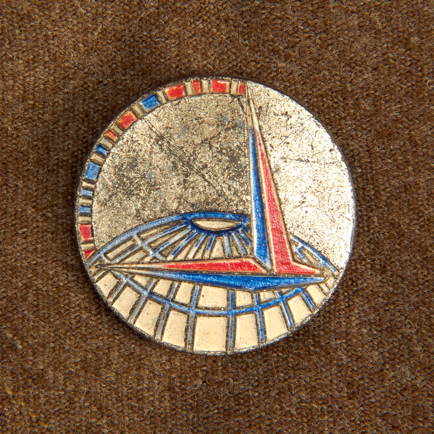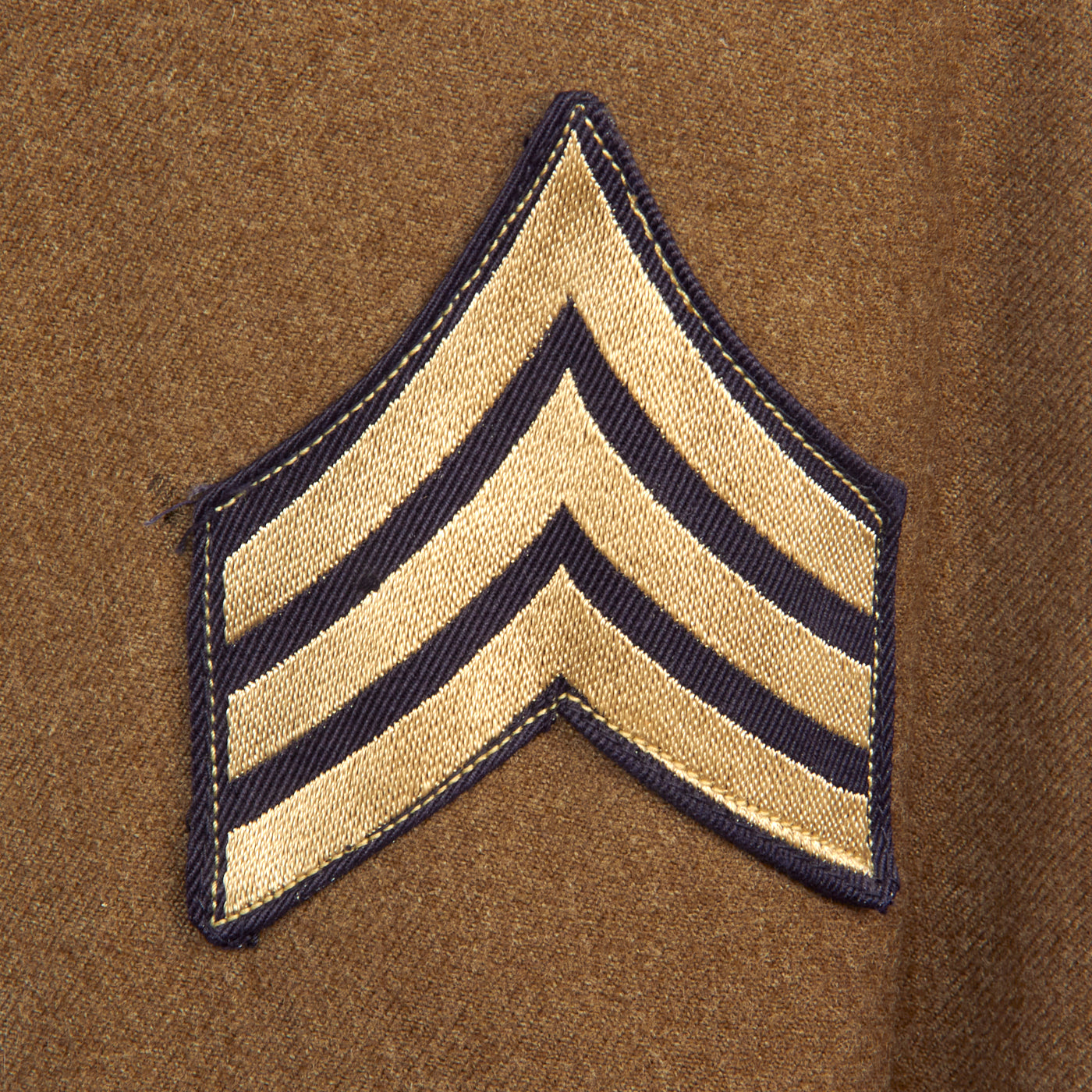 The uniform itself is a 1944 manufactured “Ike” Jacket in size 36L. The left sleeve features an Army Air Force Shoulder Sleeve Insignia (SSI) with an Air Transport Command Scroll above. The right sleeve features a Bermuda Base Command SSI. Embroidered Sergeant Chevrons adorn both sleeves. At the left cuff are two overseas bars, denoting one year spent overseas At the collar is a “U.S.” Disk (srewback), and an “Air Corps” Collar Disk (clutchback). Below are a matched pair of pinback Air Transport Command Distinctive Unit Insignias. Above the left pocket is an unmarked Sterling Silver Aircrewman’s Wing, fitted on the jacket with early style clutches. It should be noted that ALL the insignia shows evidence of having been on this uniform for a VERY long time!