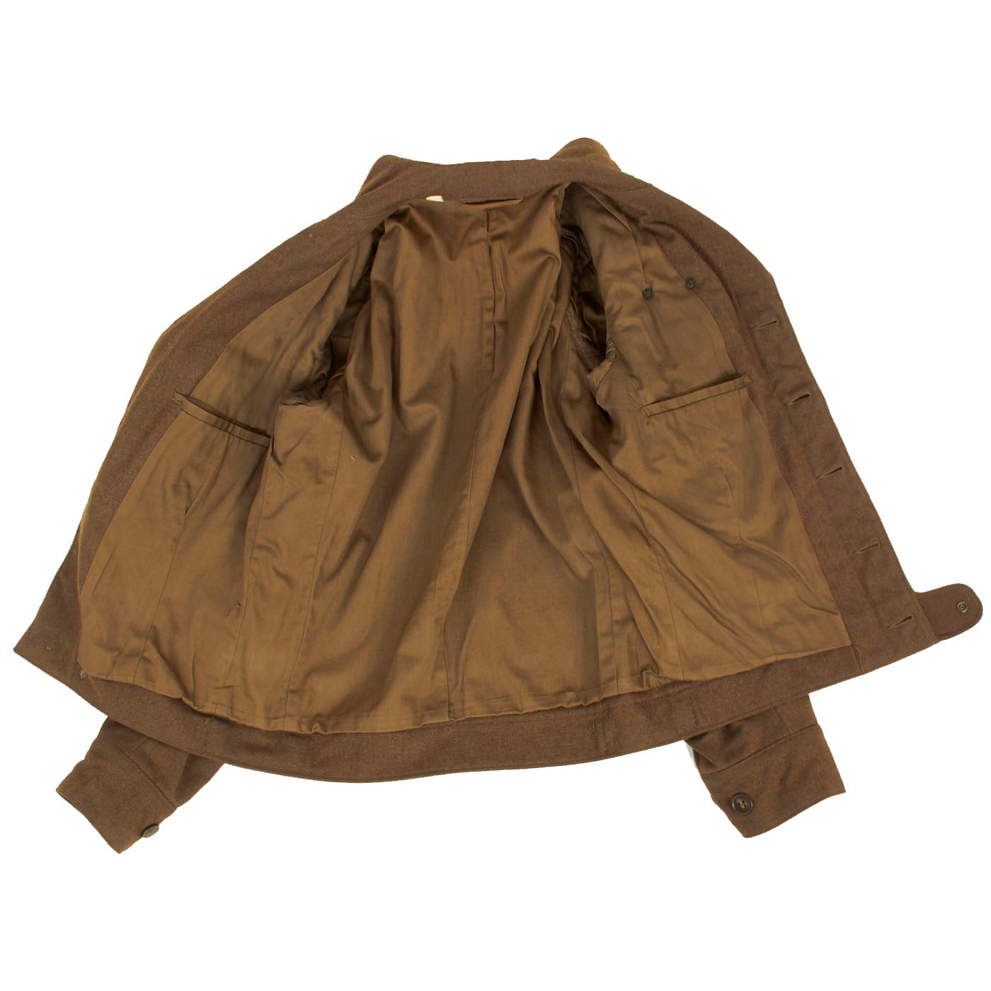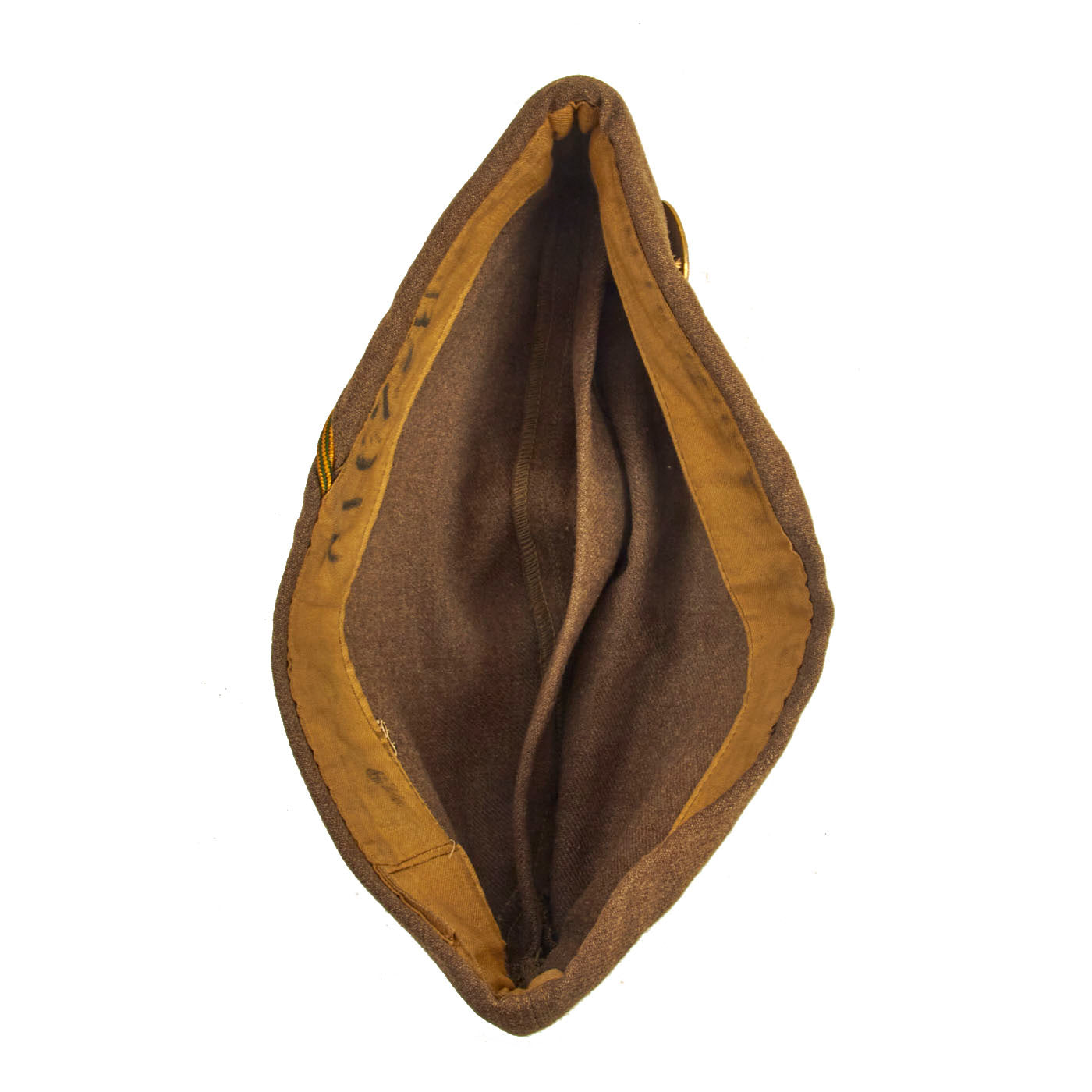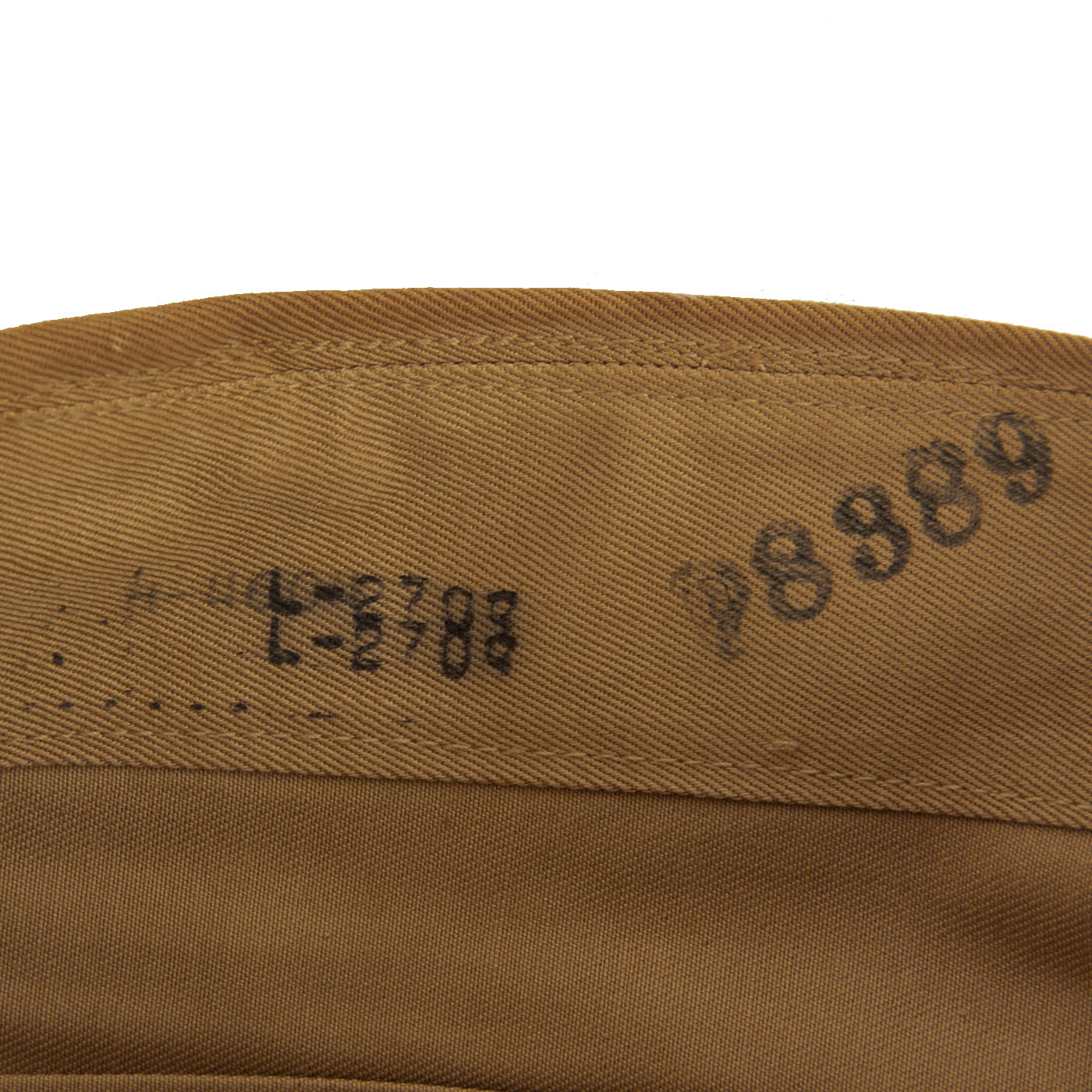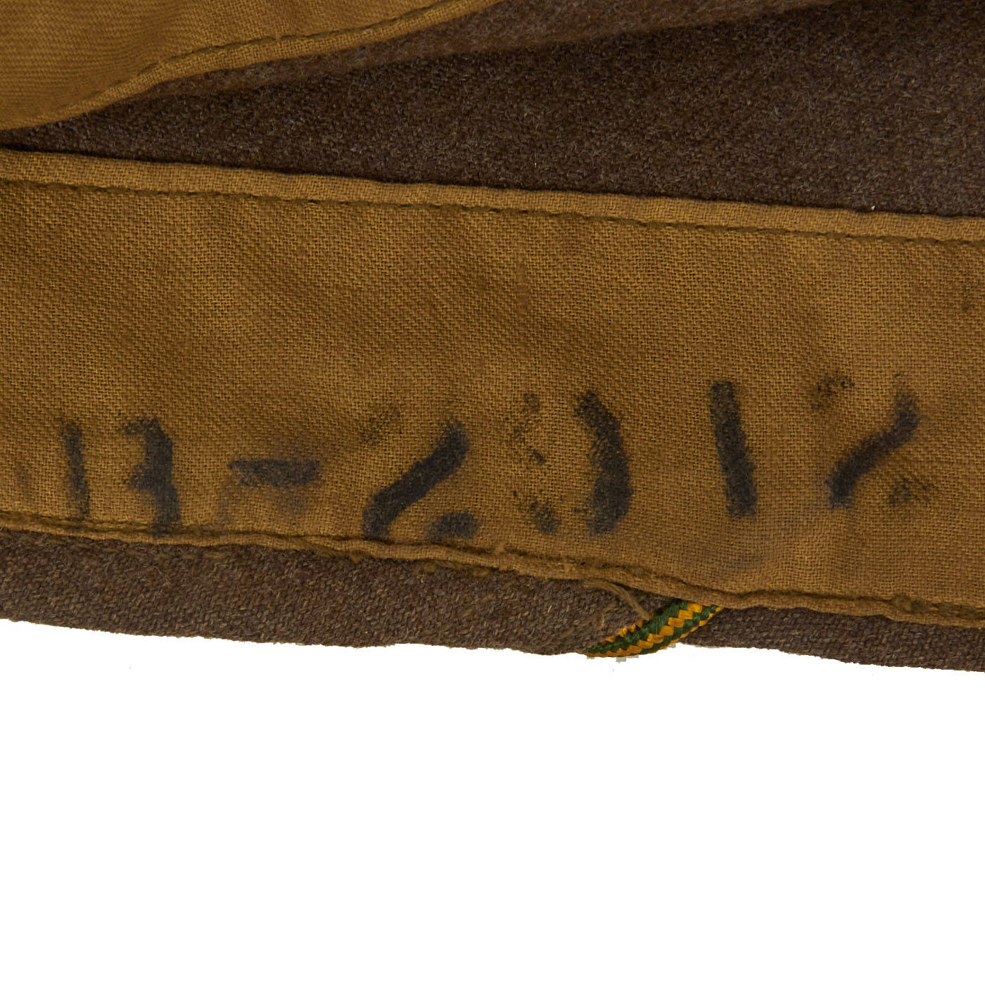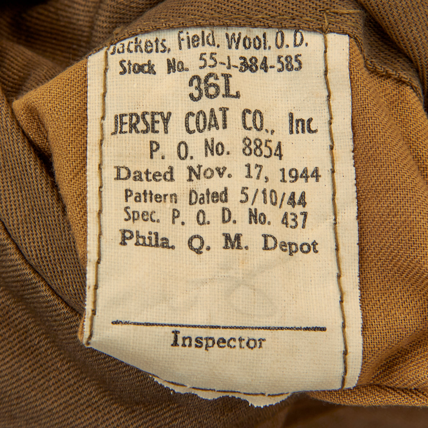 In the pocket of the Jacket was found a single dogtag identifying the owner as James W Lees Jr., Army Serial Number 31492709. Lees’s cooresponding GI Laundry number is also stamped inside the Khaki MP piped Overseas Cap. In addition to the dogtag, a WWII Victory Medal Ribbon and an American Campaign Medal Ribbon were found in the same pocket.
