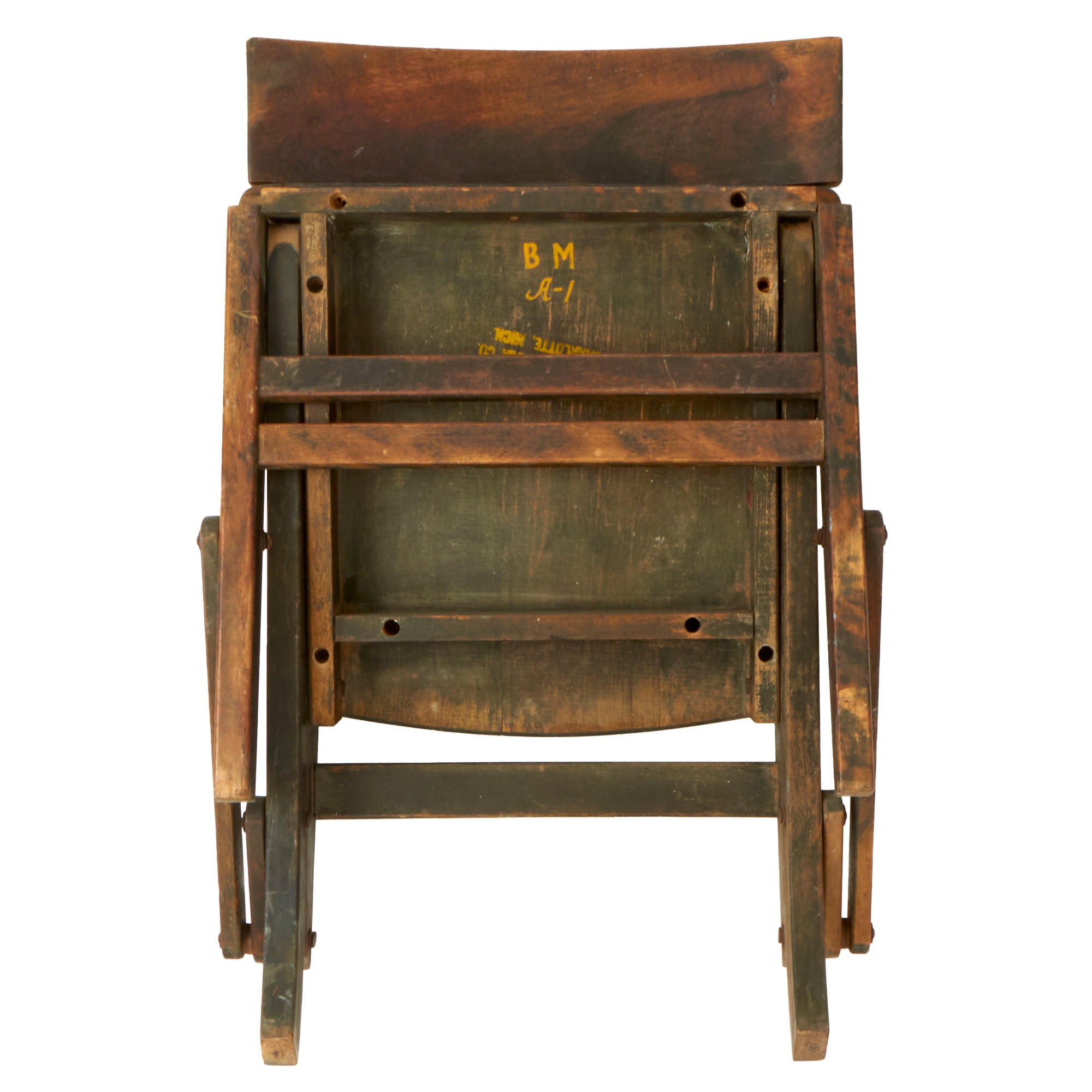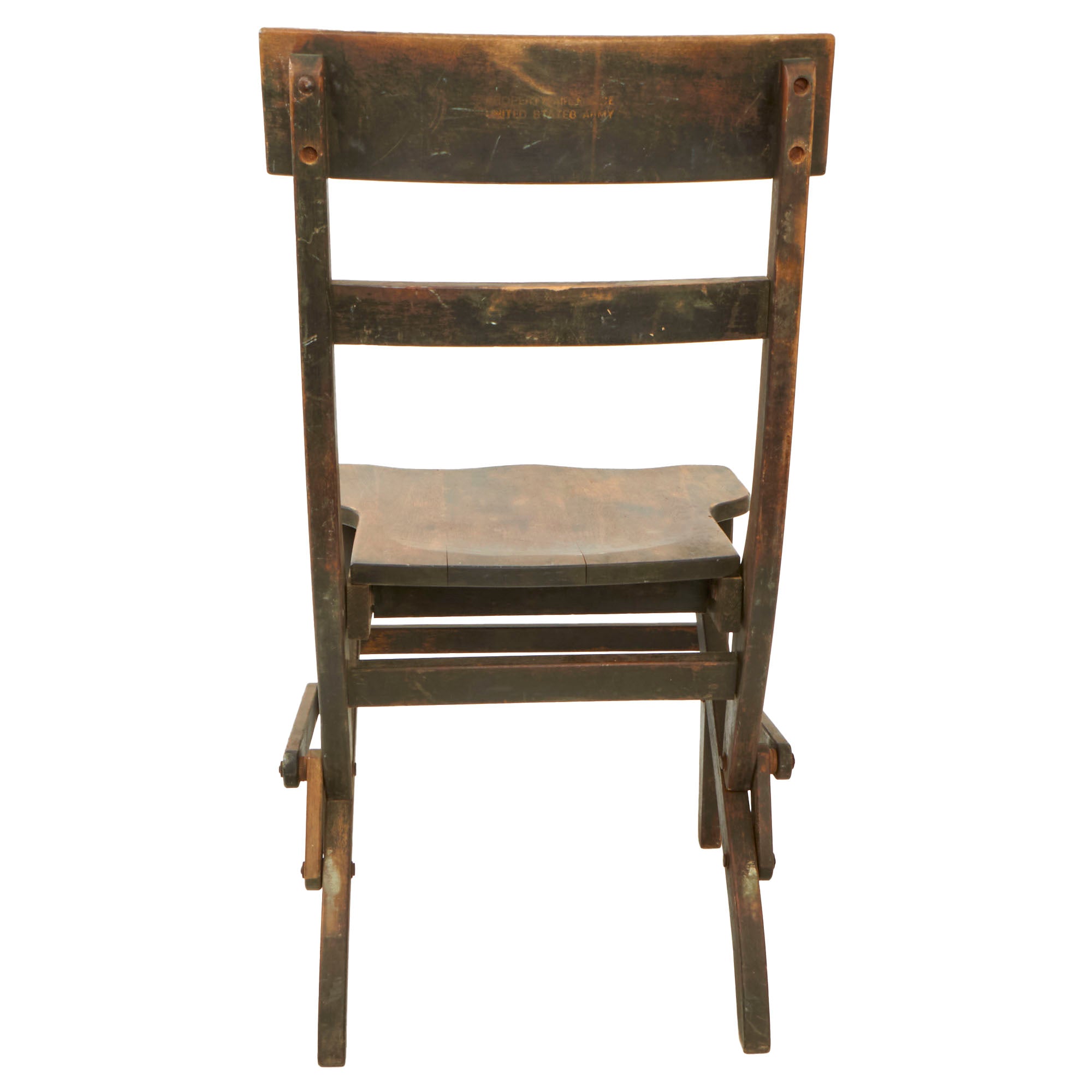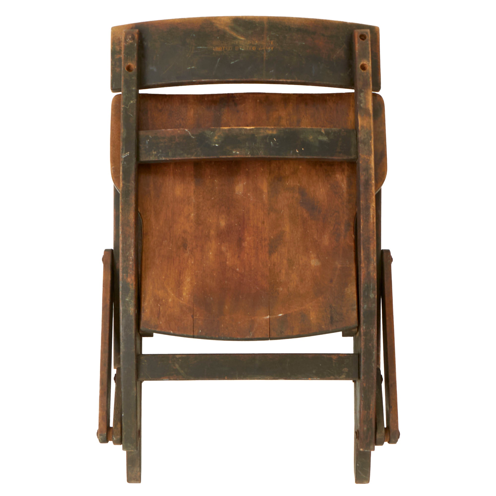 Original Item: Only One Available. This is a very nice U.S. WWII Folding Chair, made by Charlotte Chair Co. and issued to the U.S. Army Air Forces. These were used by all branches, as well as being used in the civilian world, and it was most likely originally painted black, but that finish has now mostly worn away. It still has a faint yellow paint stamp on the back of the back rest indicating that it is USAAF property: