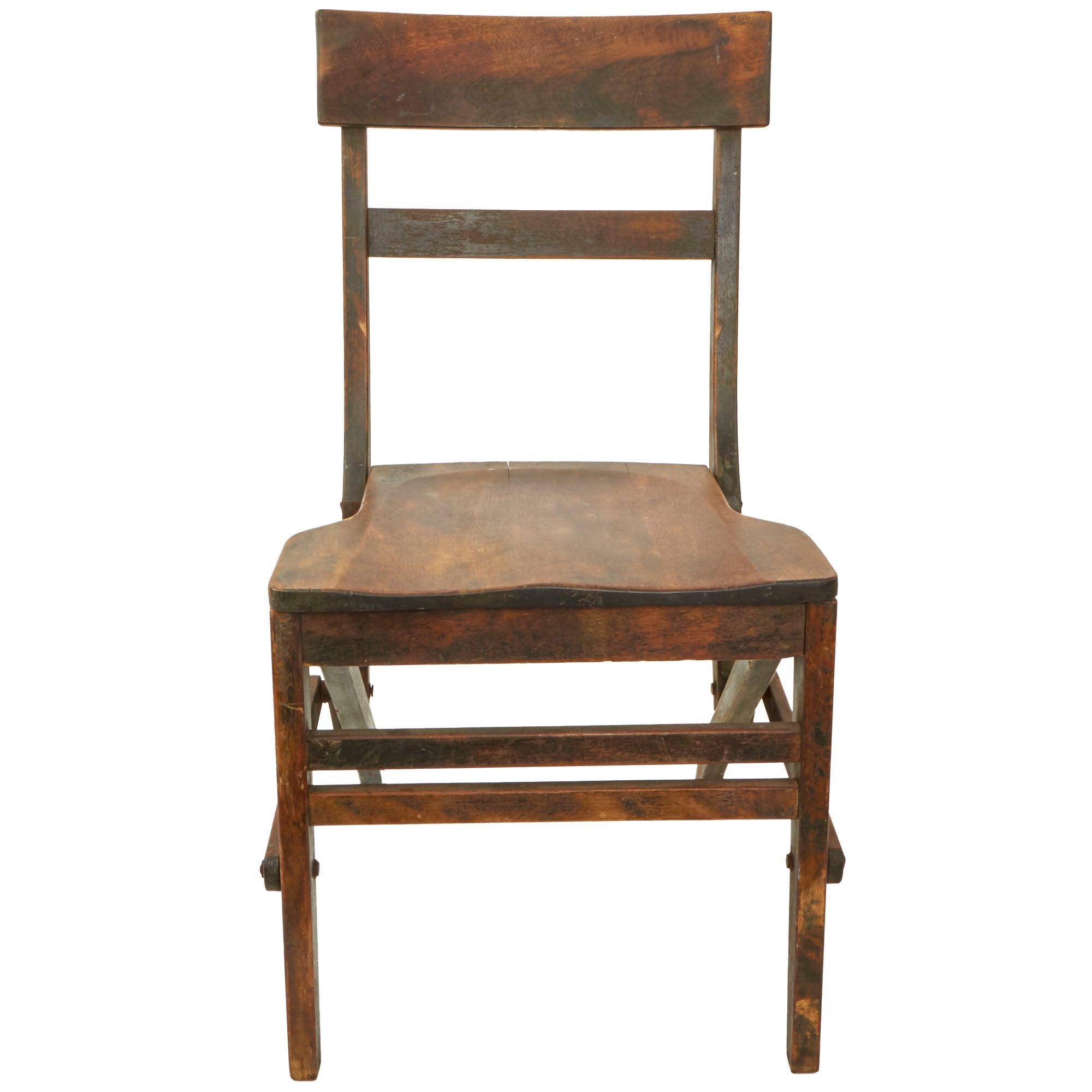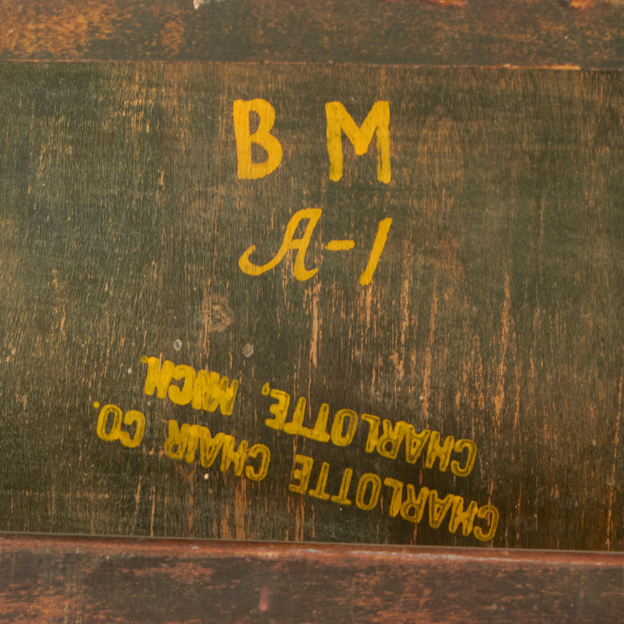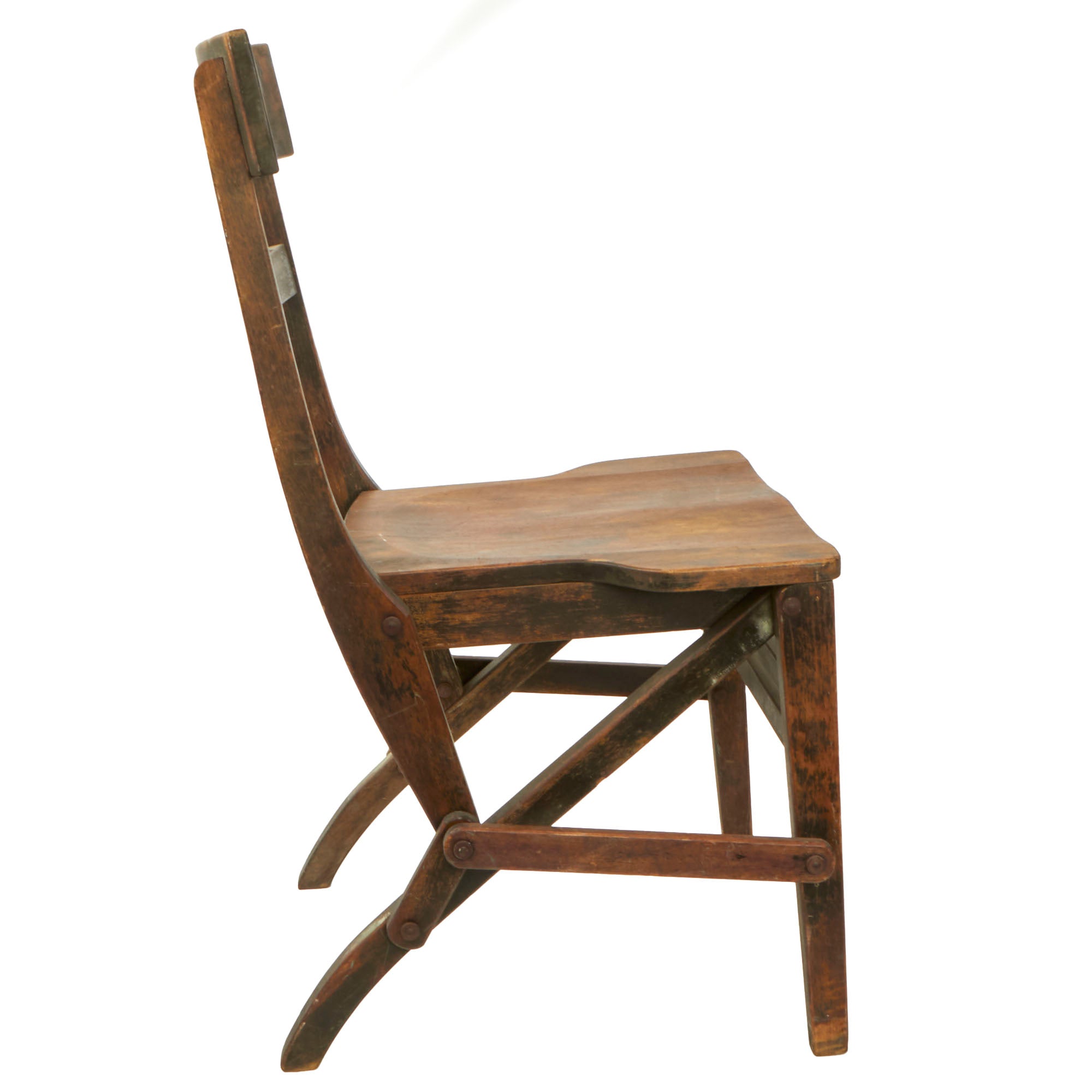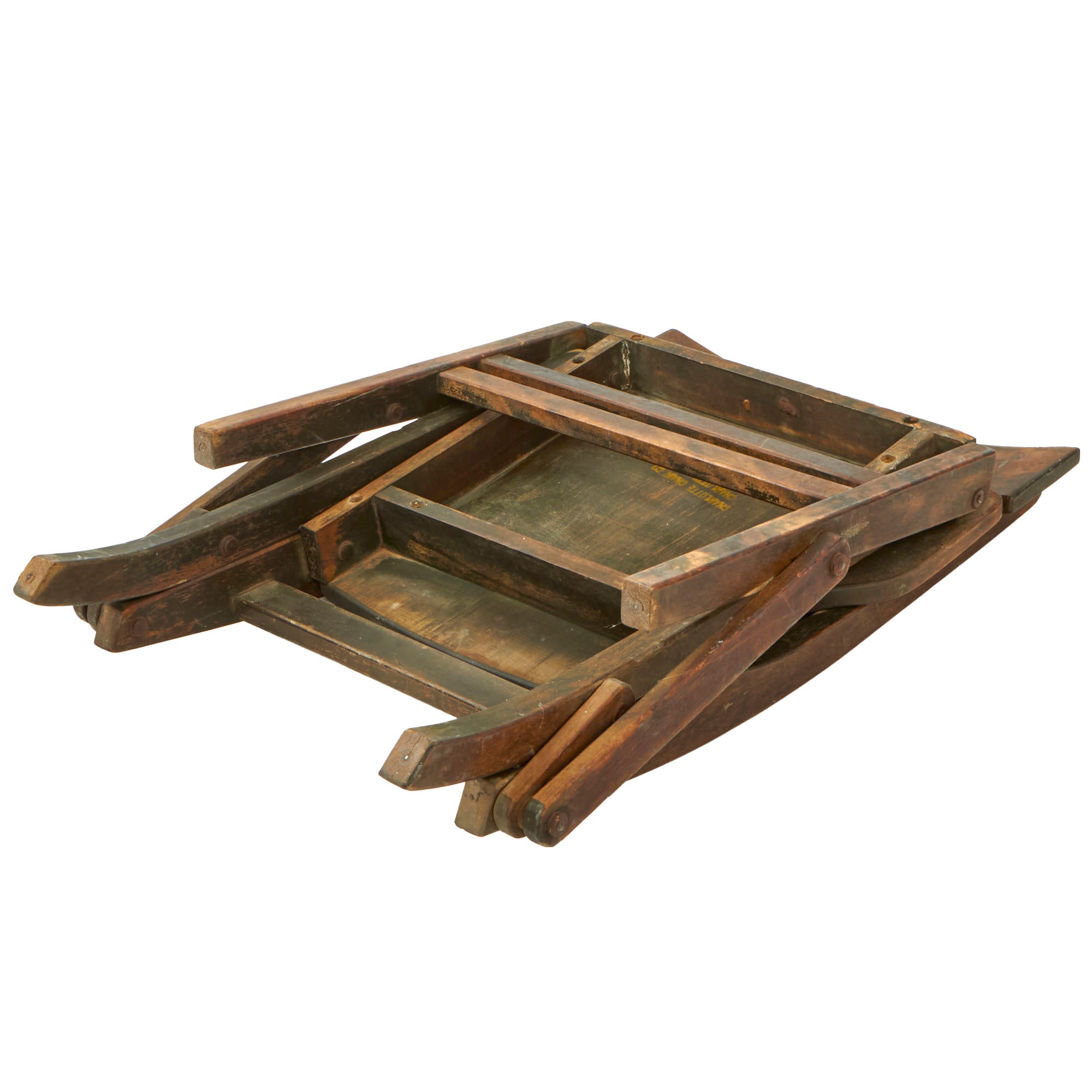Original Item: Only One Available. This is a very nice U.S. WWII Folding Chair, made by Charlotte Chair Co. and issued to the U.S. Army Air Forces. These were used by all branches, as well as being used in the civilian world, and it was most likely originally painted black, but that finish has now mostly worn away. It still has a faint yellow paint stamp on the back of the back rest indicating that it is USAAF property: