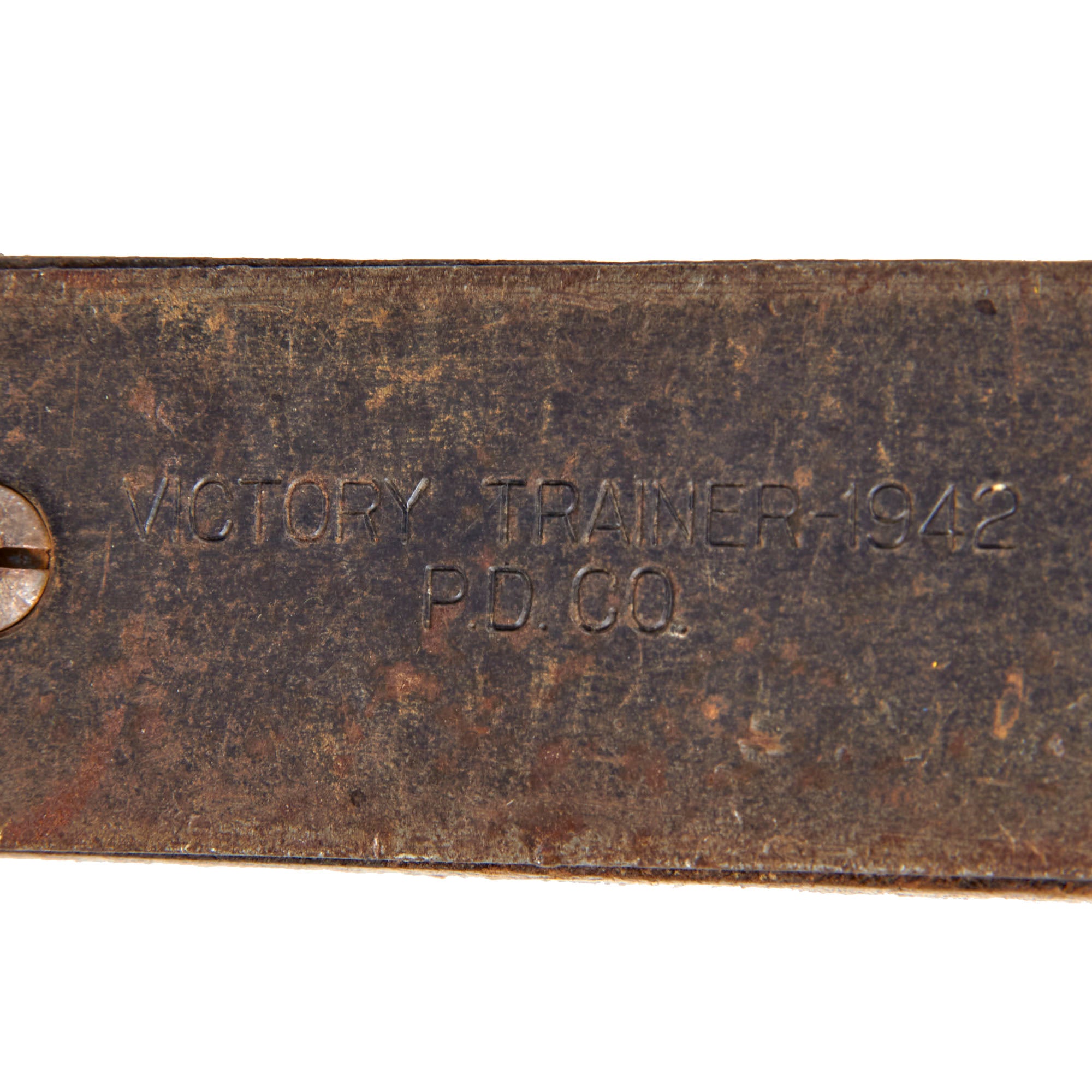 All of the Navy contract training rifles were supplied with a plastic bayonet and scabbard. One of the changes specified prior to the start of the first Navy contract was to attach a bayonet lug on the forward band. This probably indicates that no bayonet lug was planned on the Army model. However, there known specimens of the Army model that have a bayonet lug. This may have something to do with the Army and Navy production overlapping and that it was more economical to use one style of front band. Early in WWII there was a critical shortage of steel. As little steel as possible was used in the manufacture of the training rifles and plastic was substituted for the blade of the bayonet. The bayonet was designed to fit the training rifle and they would not fit on any of the standard U.S. military arms. Pro-phy-lac-tic Brush Co. and Beckwith Manufacturing Co. each had military contracts to supply the plastic bayonets. Victory Plastics had a contract to produce scabbards for the bayonet. All of the bayonets are marked U.S.N Mk. I. on one face near the hilt and on the other side either B.M. or P.B.C. The scabbards are also marked U.S.N. Mk.I. The contract price of the bayonet varied but it ranged from $1.50 and $1.70 and the price of the scabbard was $0.75.