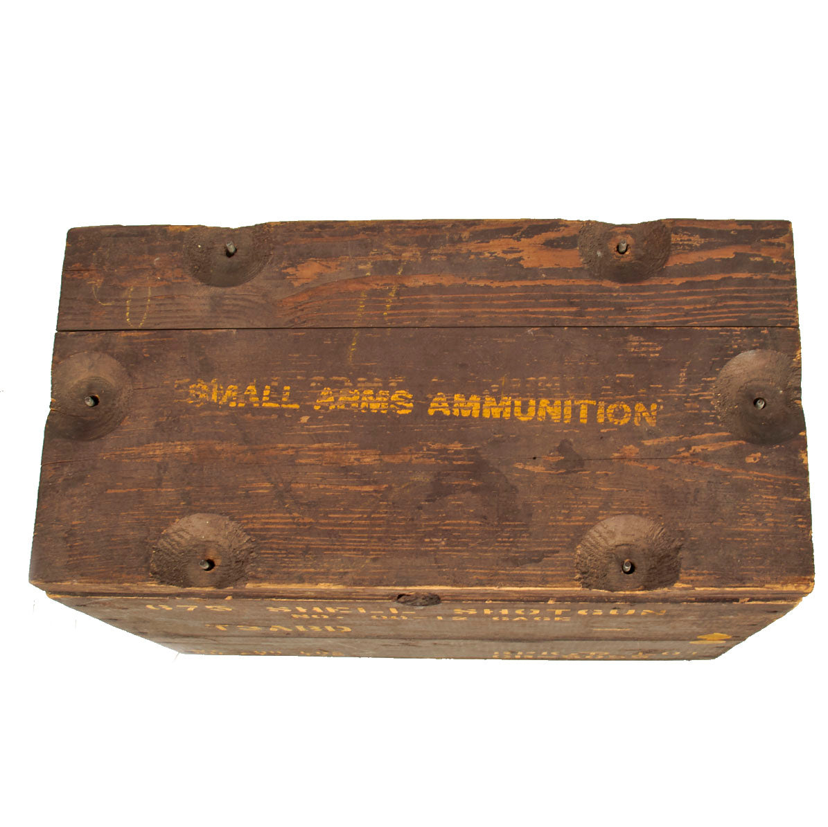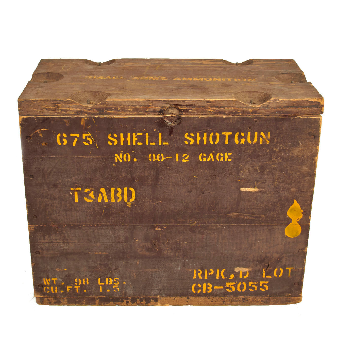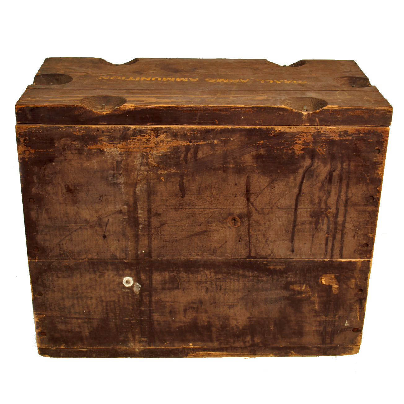 Most of that information can still be found in yellow writing on the chocolate brown paint used to cover the crate. The top has SMALL ARMS AMMUNITION painted on the top, which is correct for “T” group crates.