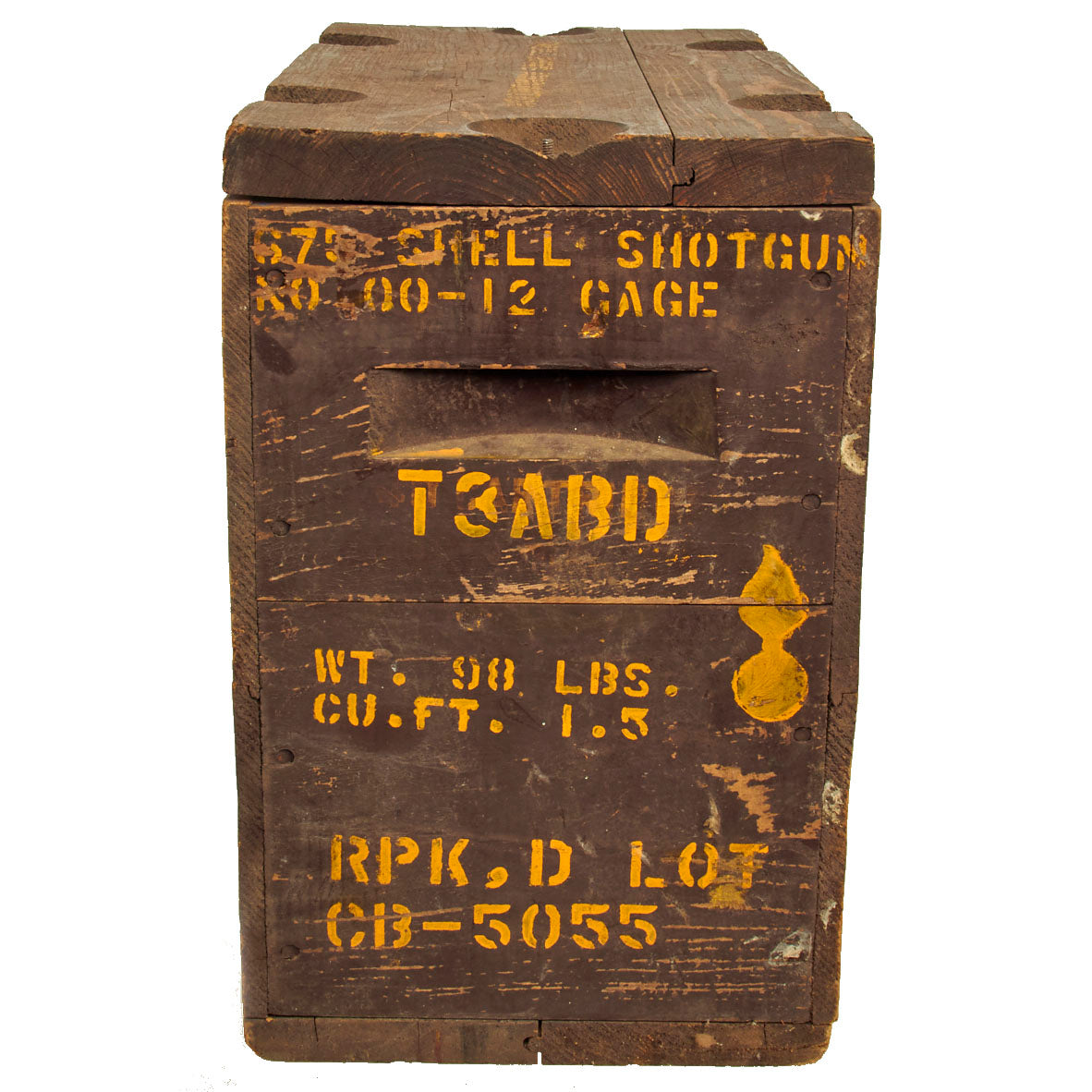 This M1917 Ammunition Packing Box is of the large size, measuring approximately at 18 1/8” x 9 3/8” x 14 1/2”. This box was designed to hold 675 12 Gauge, No.00 Buckshot shells. The box is properly labeled at the top as T3ABD. Group “T” related material was the indicator for small arms ammunition, Sub-Group “T3” was the indicator for Shells for Shotgun, and altogether T3ABD meant the following information and contents was for the crate: 675 Shells, Shotgun, 12 Gauge, No.00 Buckshot, in 25-shell cartons. 27 cartons per wooden M1917 ammunition packing box. Gross Weight: 98 lbs. Volume: 1.5 cubic feet.