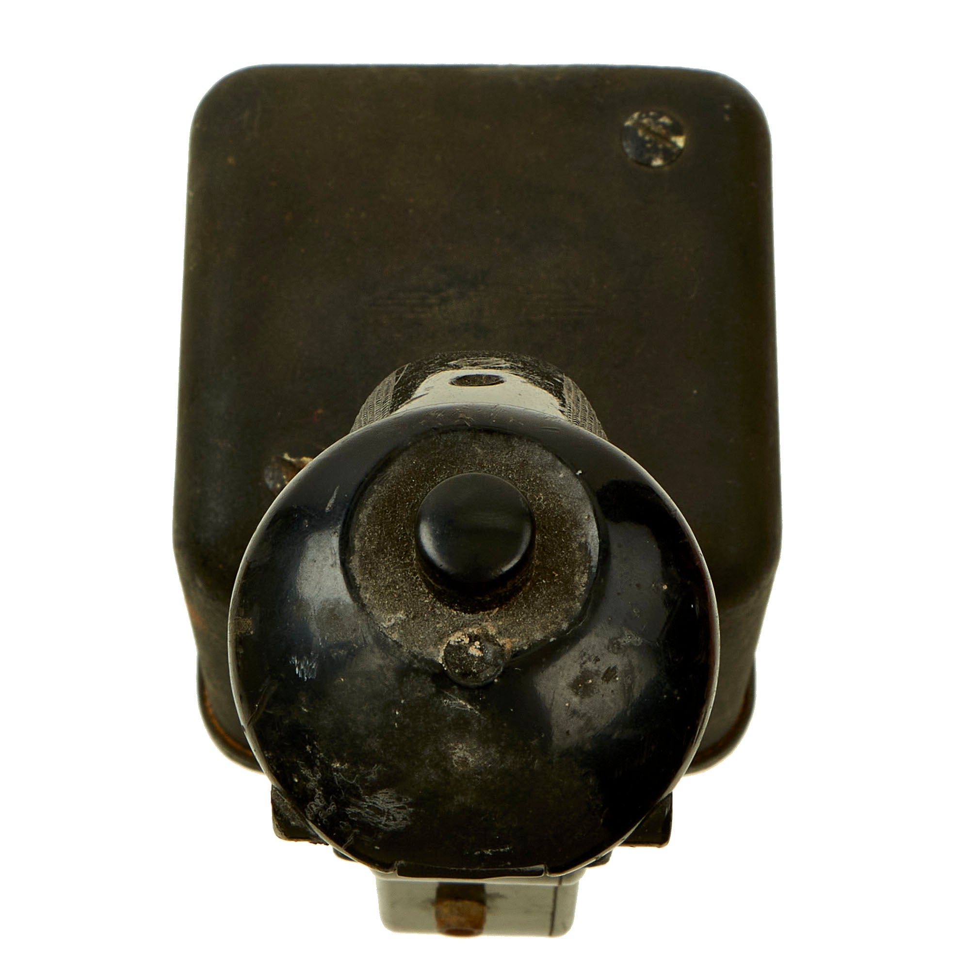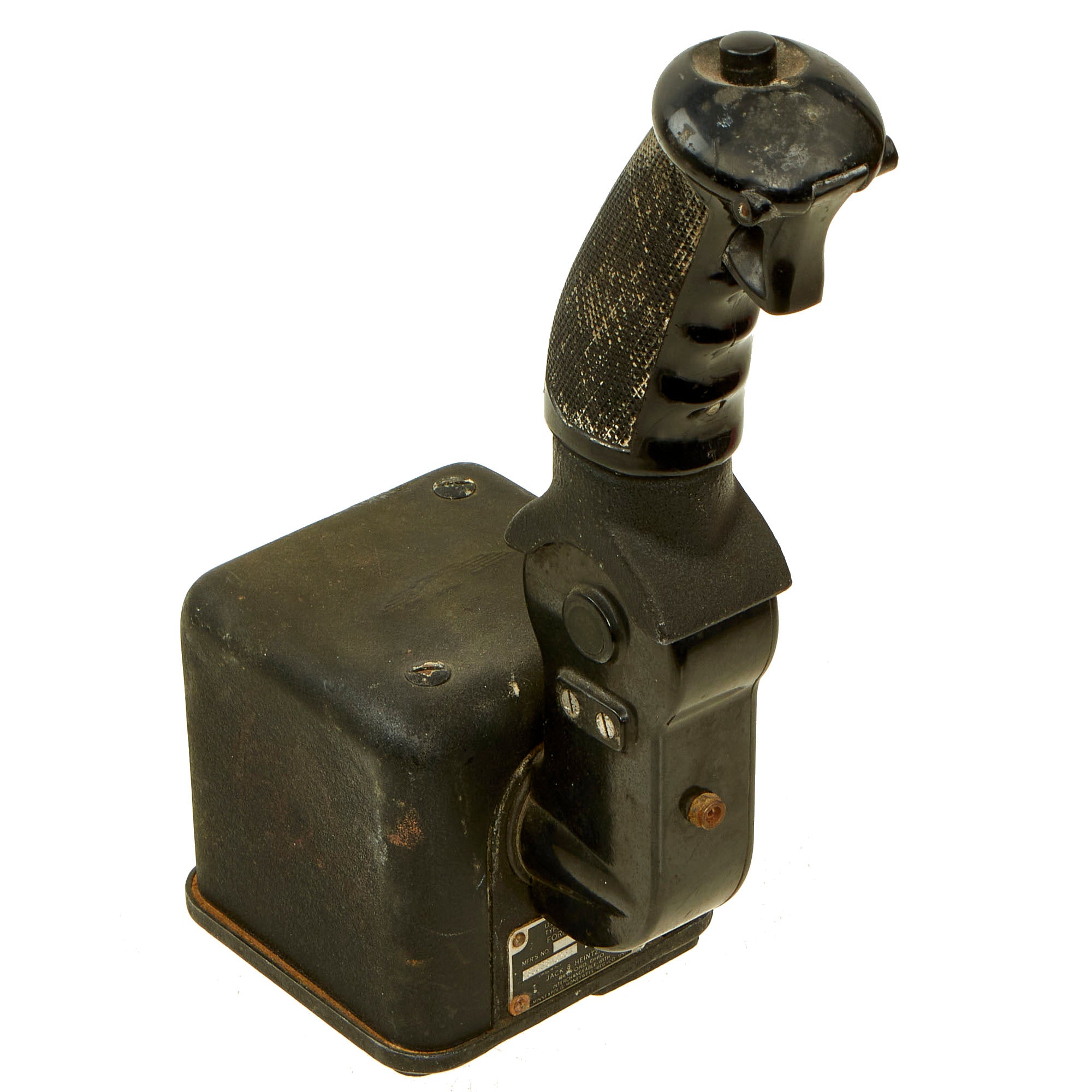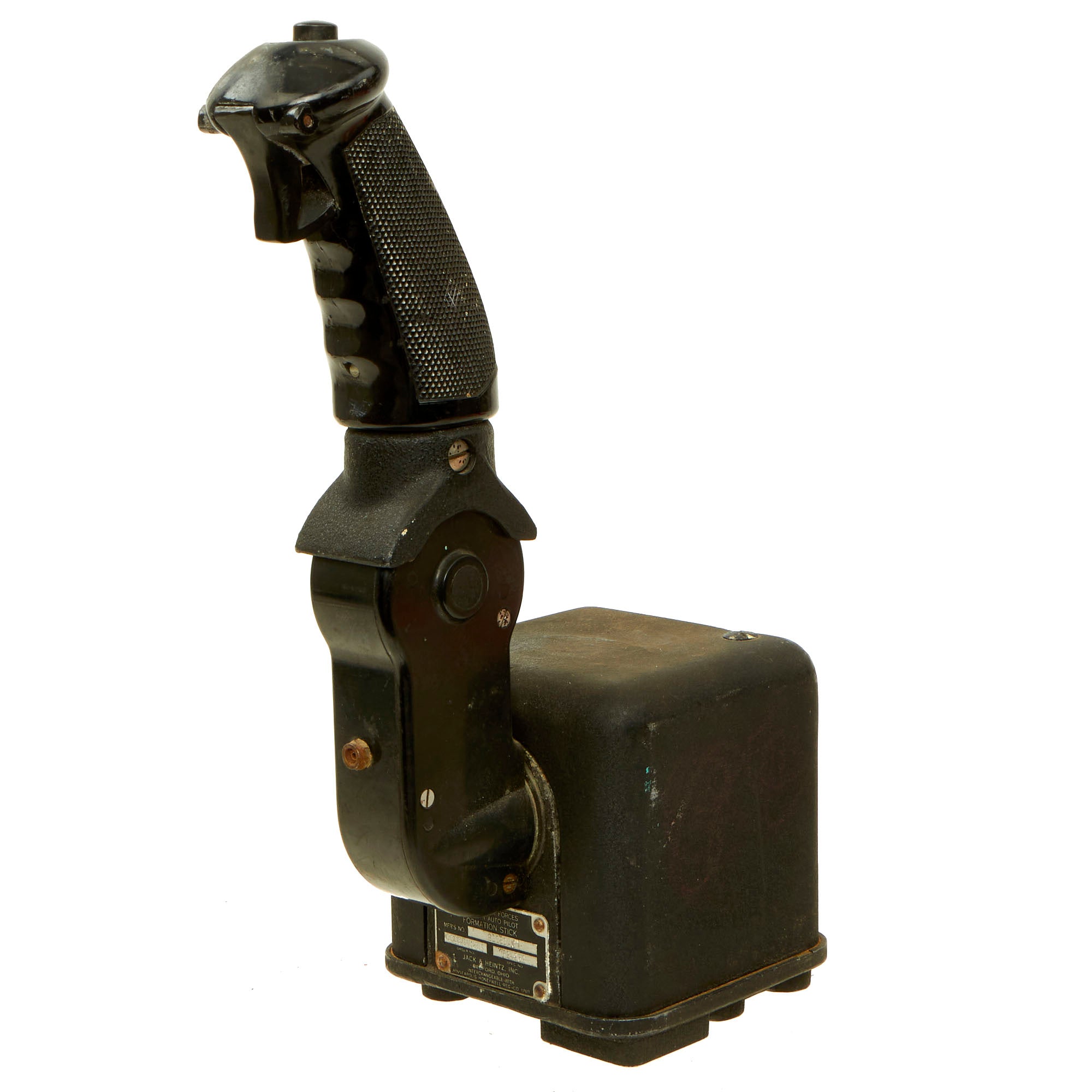 This formation stick was an improvement added to the original C1 autopilot. The original C-1 autopilot required turning rotary knobs for course corrections and control of the plane, when the Norden bombsight was not controlling it. This formation stick was mounted to the left of the pilot and right of the co-pilot where the armrest would be. It allowed an easier control of the plane when flying formation to the bomb site. It also had a trigger switch for use of the communication microphone and a transfer switch on top for transferring control between the pilot and co-pilot.