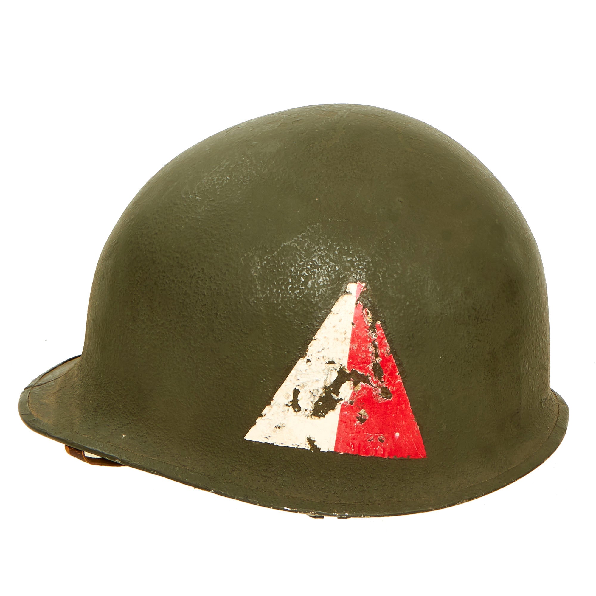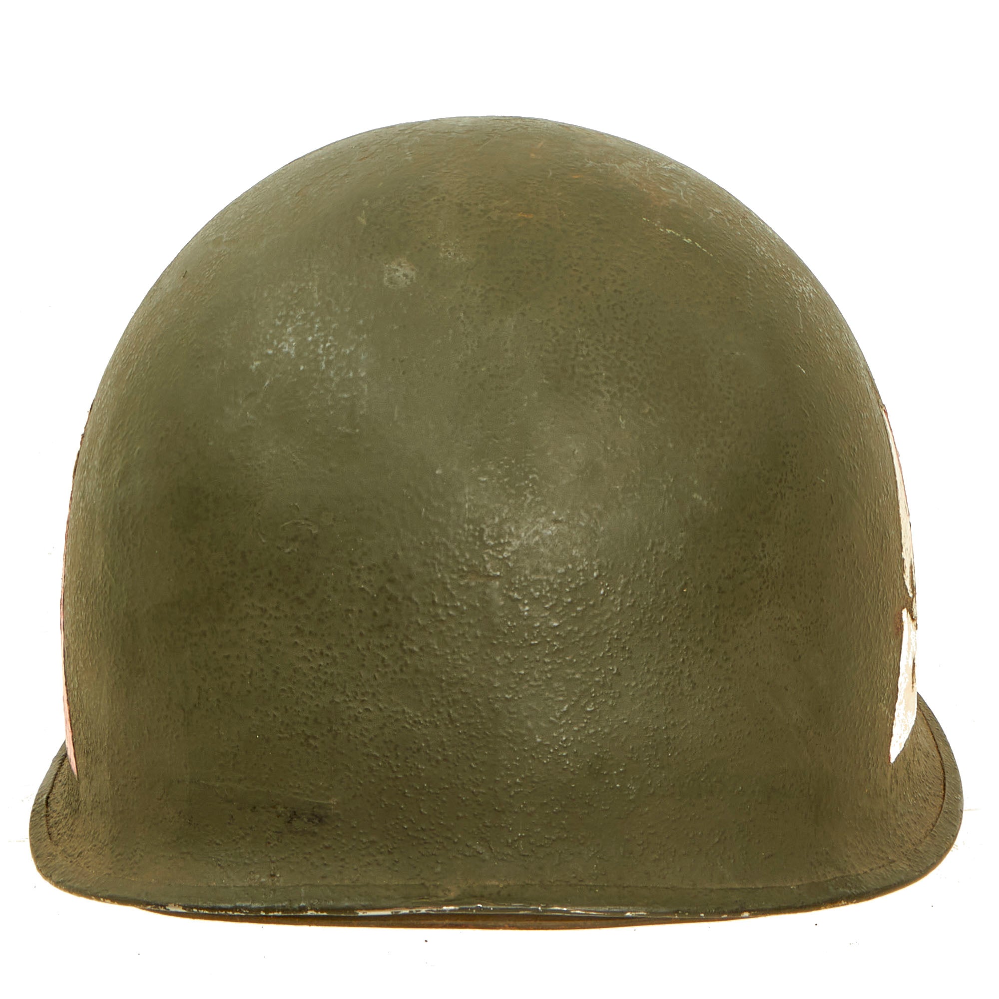 This very good condition M1 shell has correct earl war fixed chinstrap loops, called "bales," and a stainless steel rim with a front fully welded seam. These rims were both rust resistant and had "non-magnetic qualities" that reduced the chance of error readings when placed around certain sensitive equipment (such as a compass). In November 1944 the specification was changed to have the rim seam in the rear of the helmet.