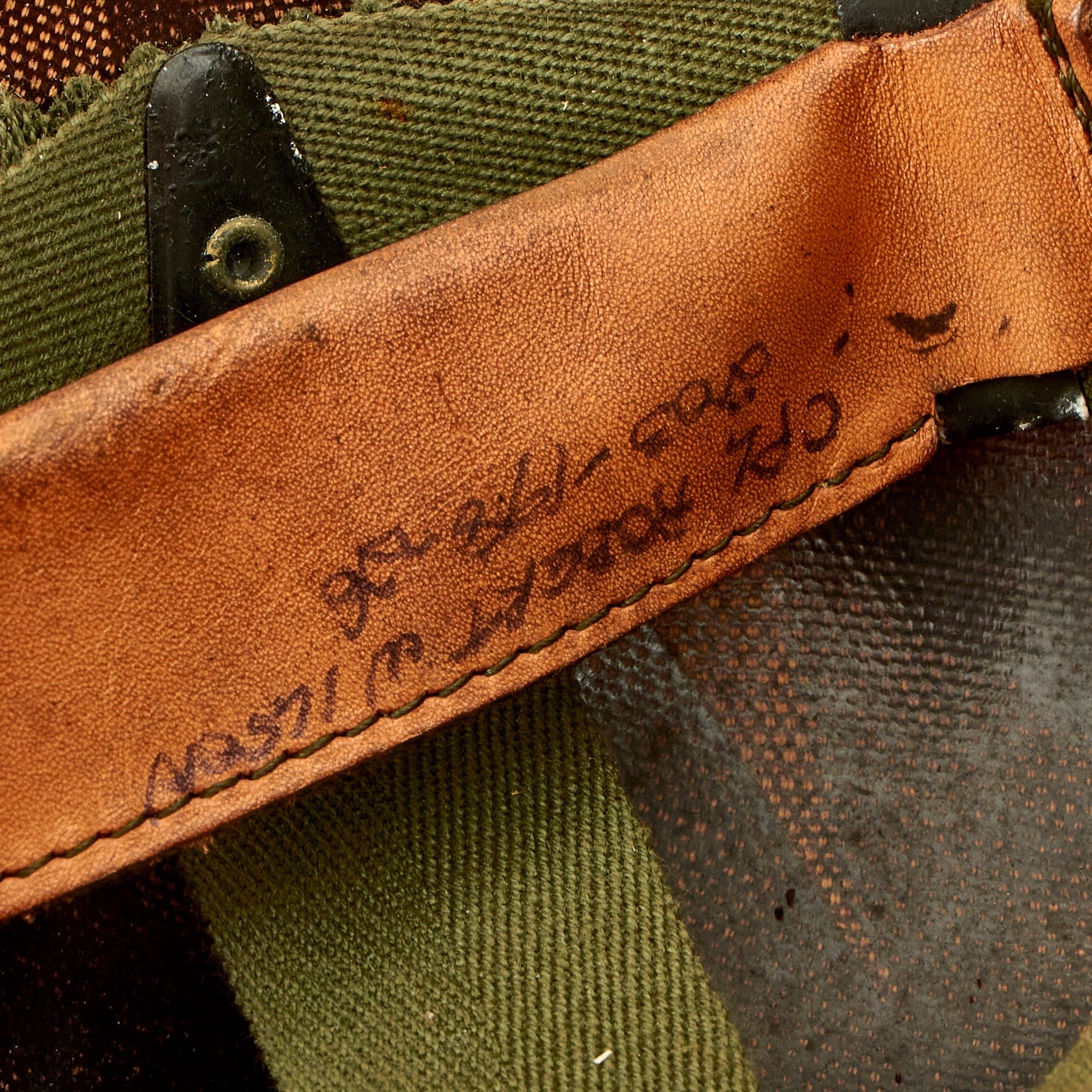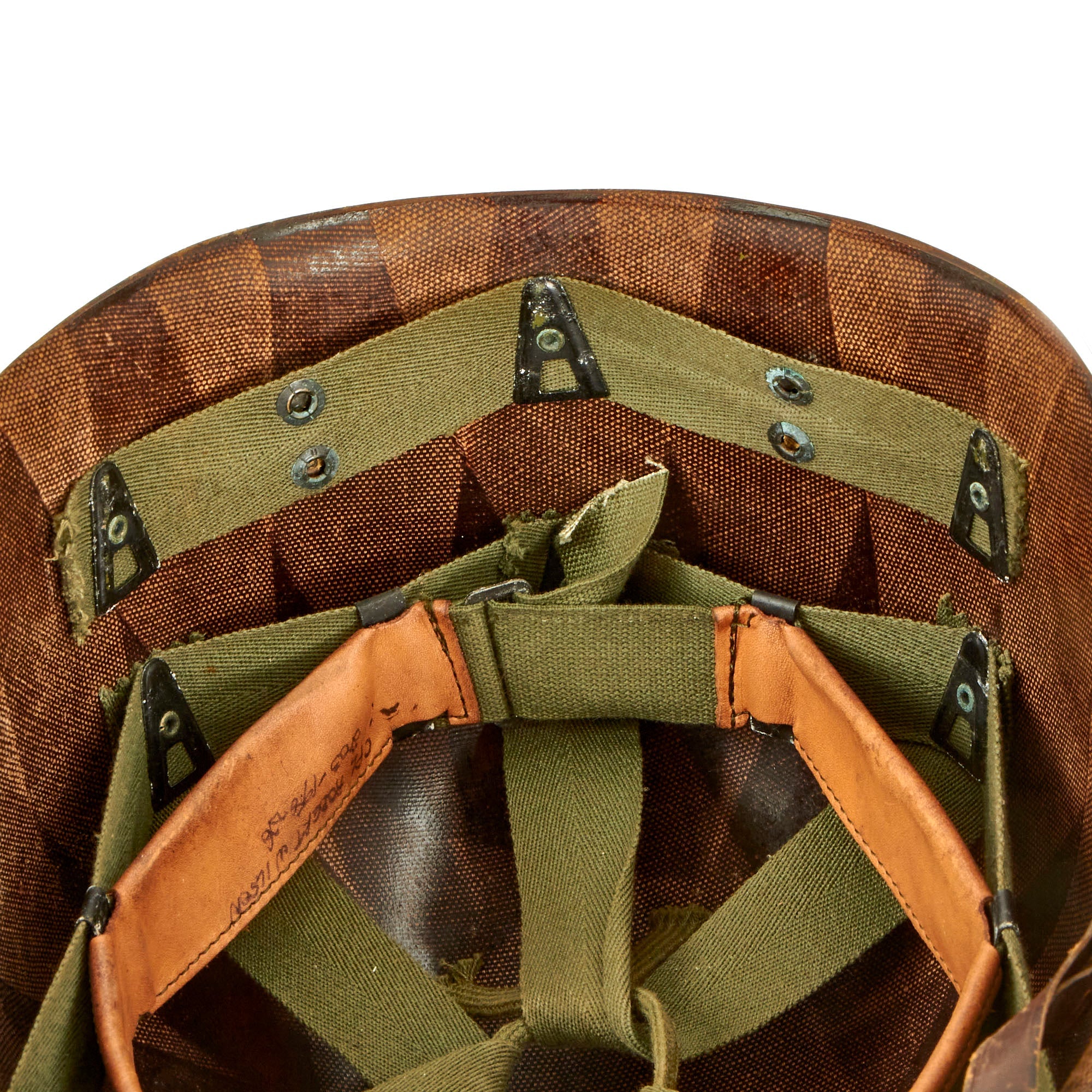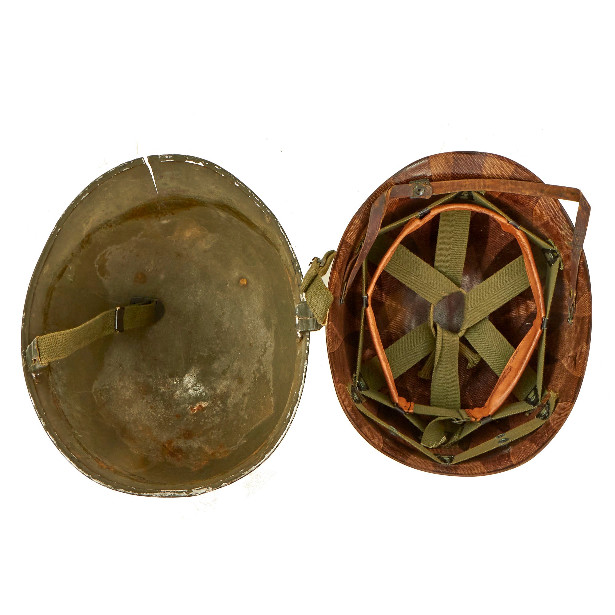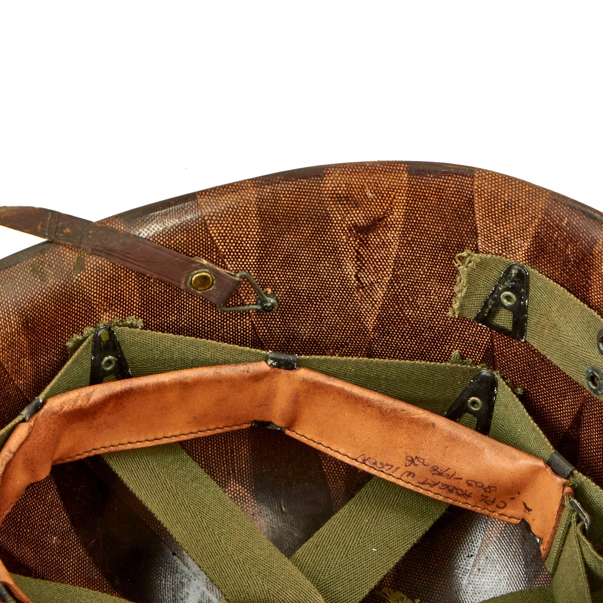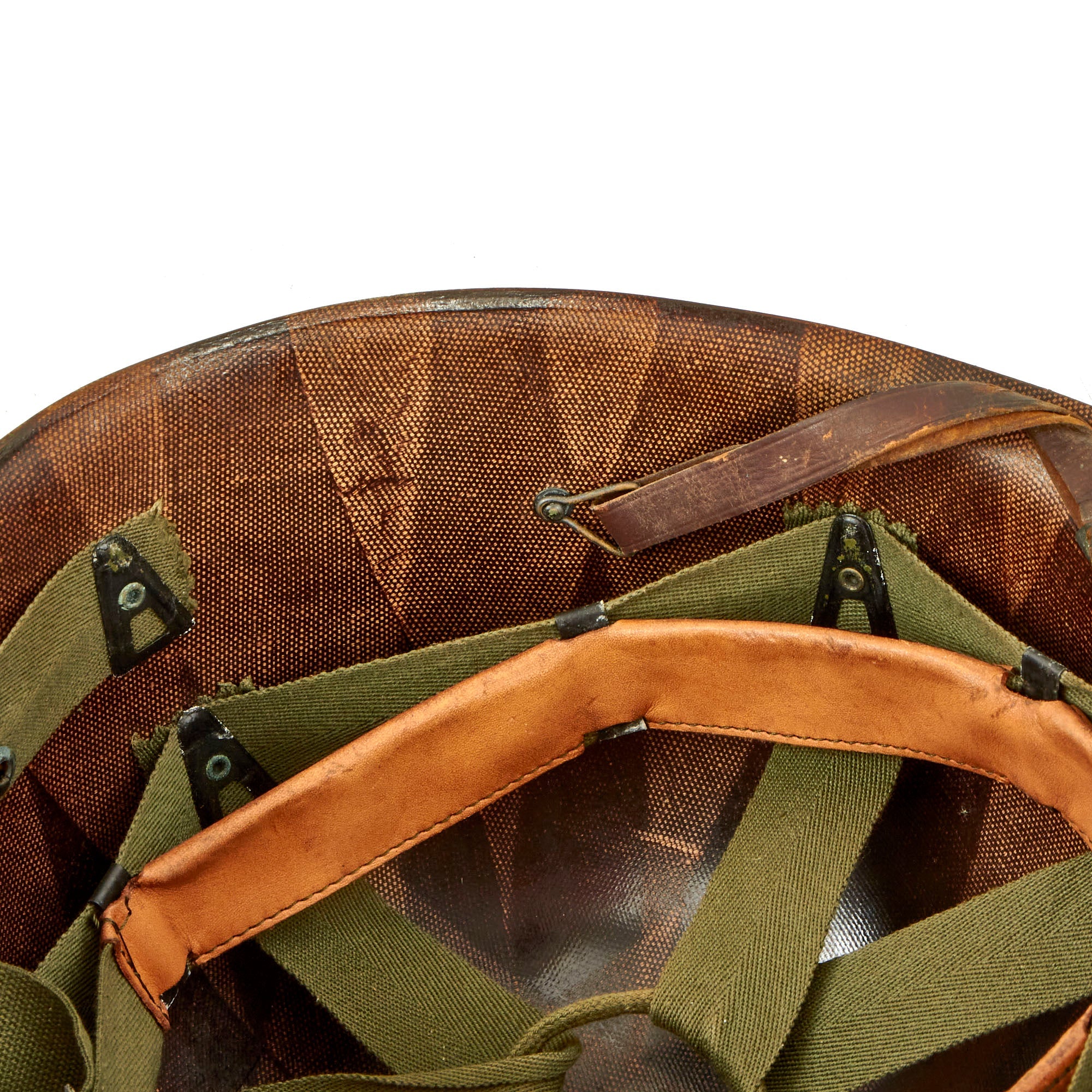 This true US WWII M-1 helmet liner can be identified through the frontal eyelet hole. Other correct WW2 features include cotton herringbone twill (HBT) cloth suspension which dates to early Vietnam. This HBT suspension is held tightly within the M-1 helmet liner by rivets and a series of black triangular "A" washers. The three upper suspension bands are joined together with a shoestring. This way the wearer could adjust the fit. Unfortunately the rear nape strap is slightly worn. The shell chin strap is original and in solid condition.