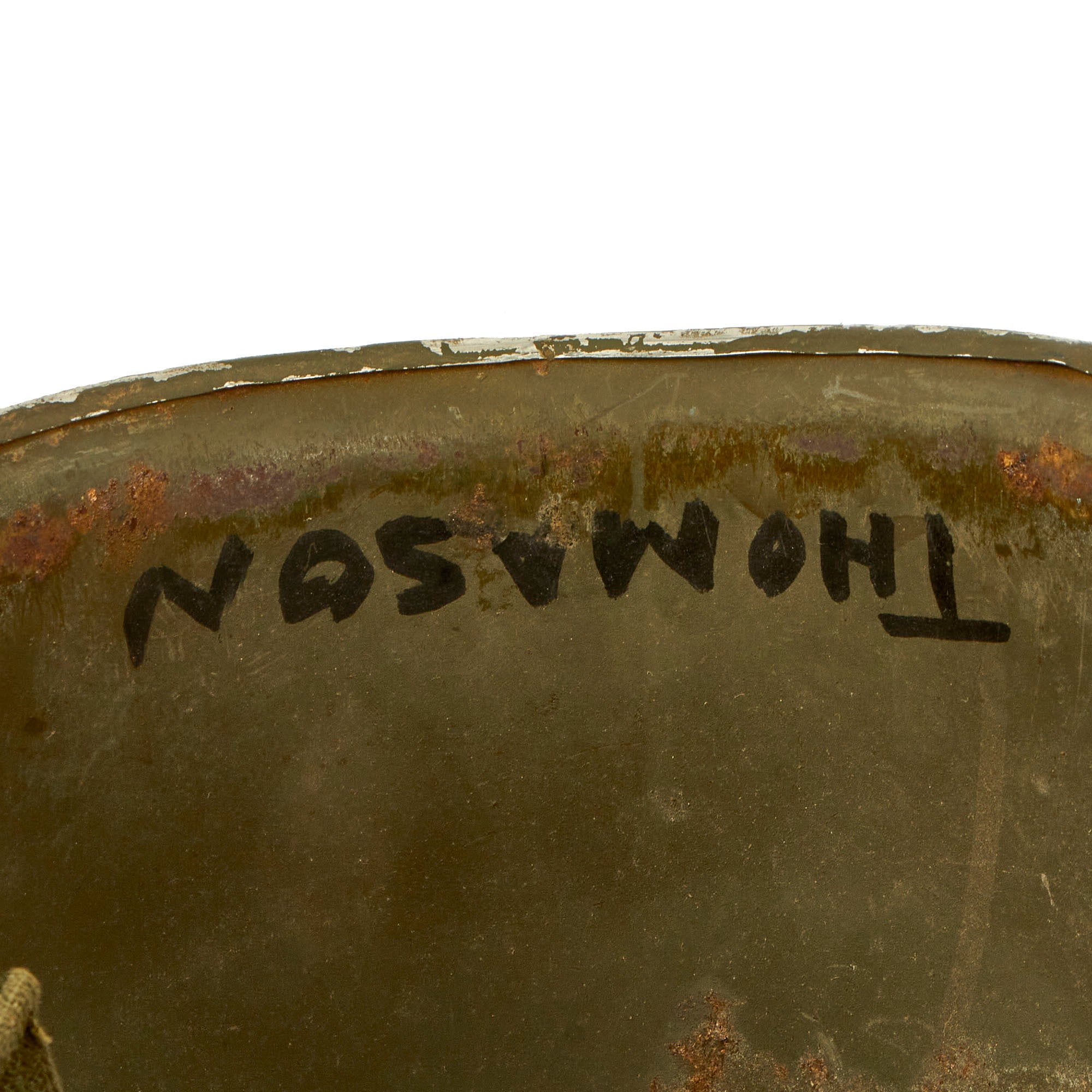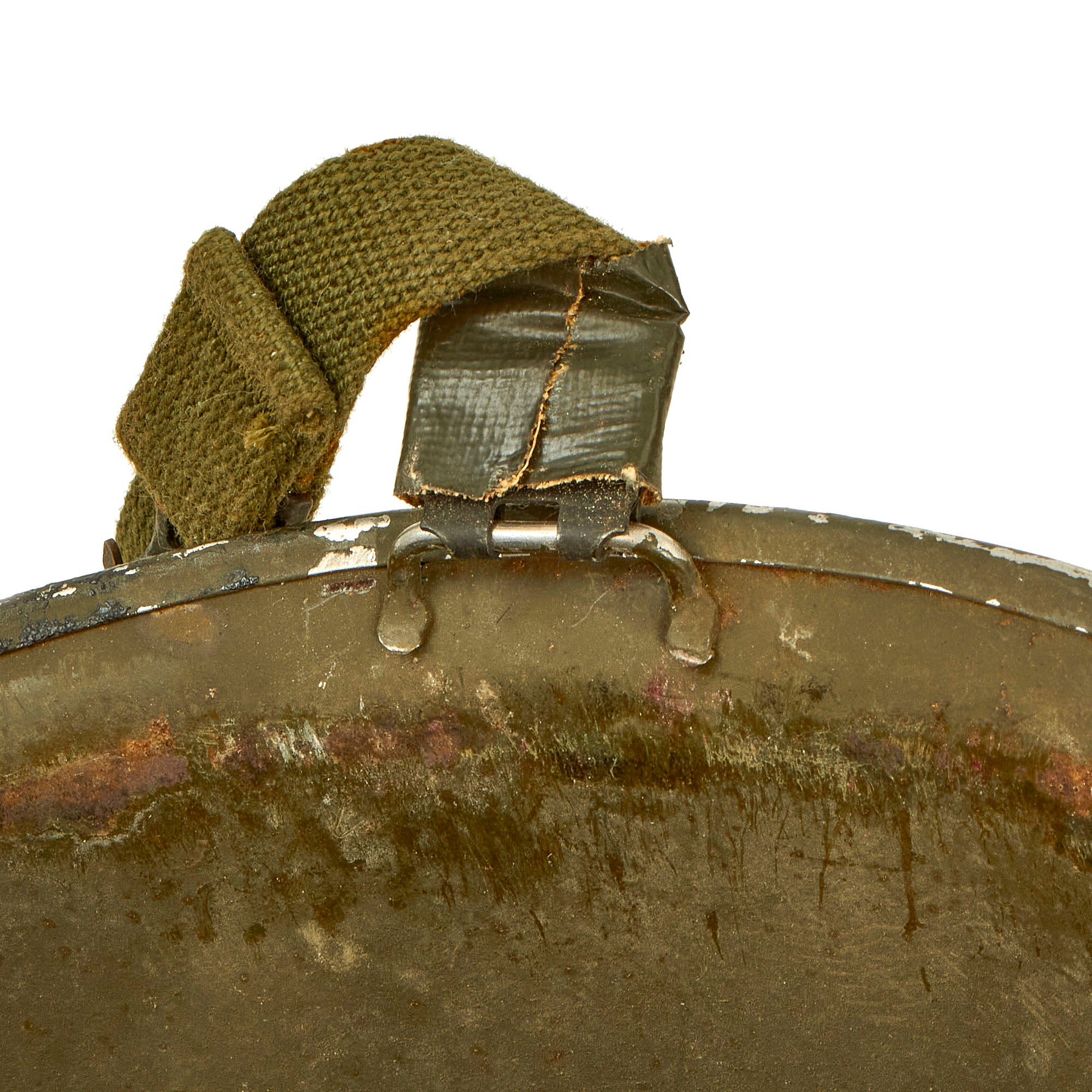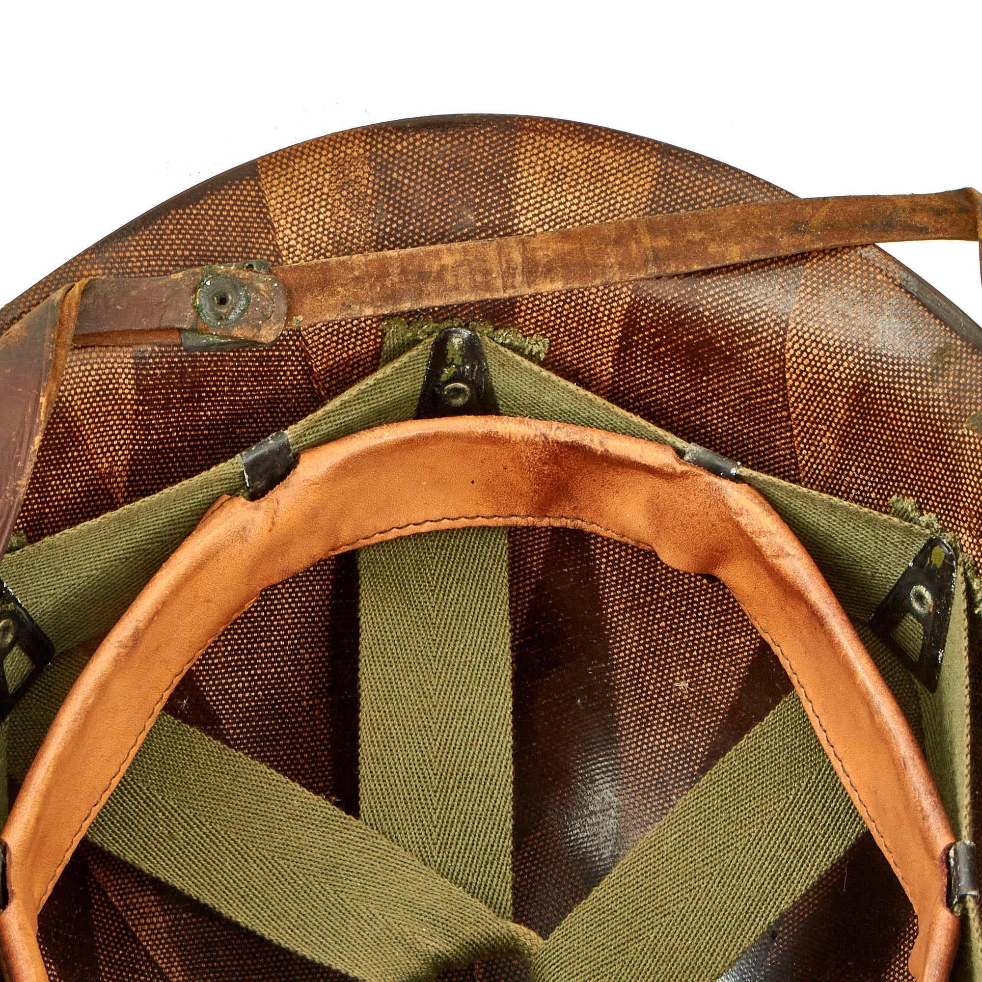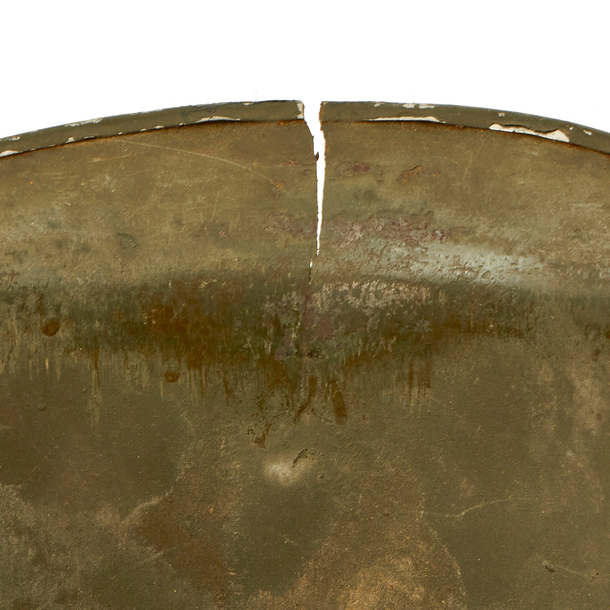 This helmet is a fine example and still retains all of its original WW2 parts and the shell has all original "corked" grain paint, though it was repainted and refitted at Arsenal for reissue during Korea into the Vietnam War. There is also the usual wear on the stainless steel rim, and due to it being an early war produced example, there are stress fractures and a large crack in the front.