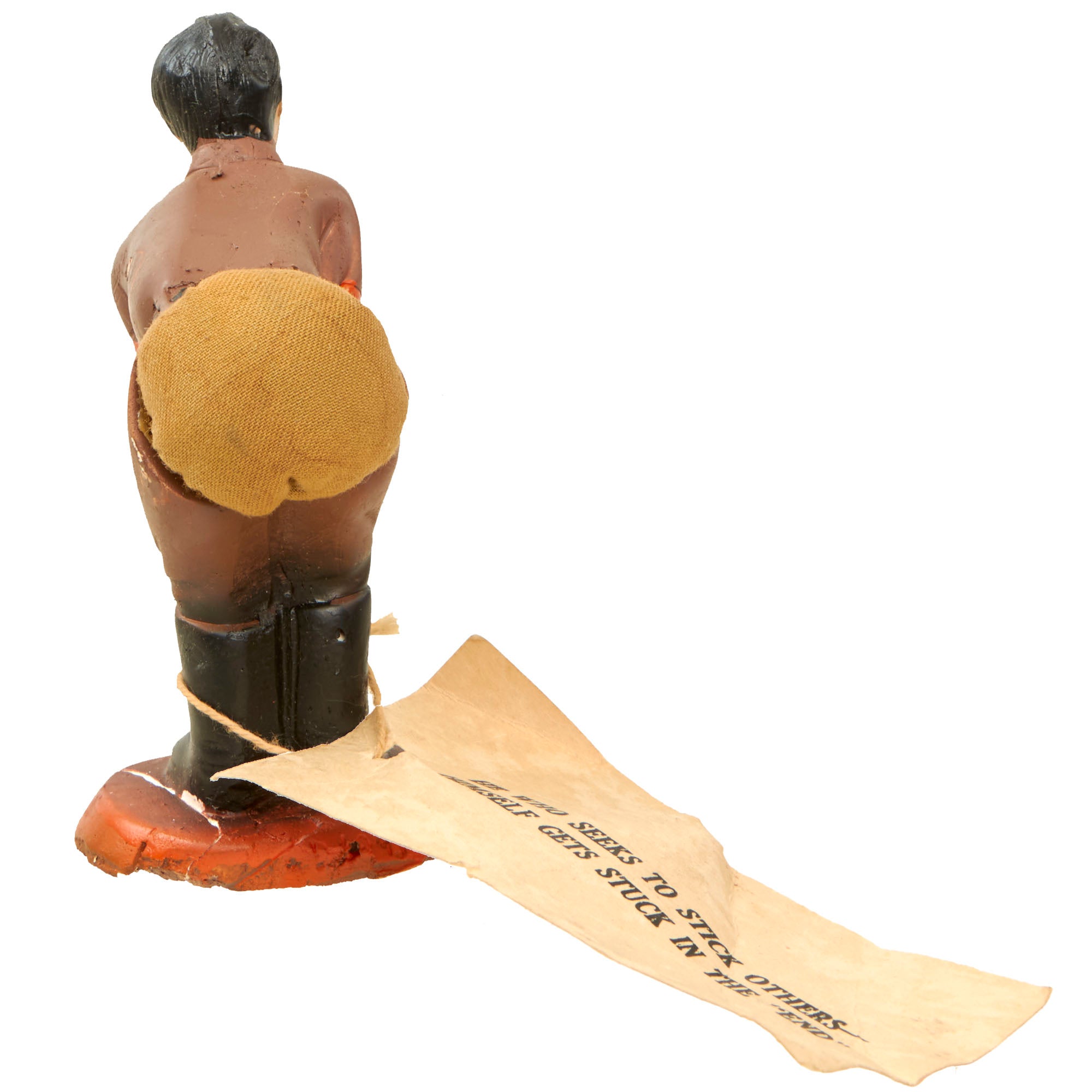 These are scarce items today simply because they were not very well made to begin with. Cast from plaster, with an applied cotton bound batting-filled pin cushion. The figurine is hand painted, with most of the original paint still present. The figure measures approximately 5 inches tall. This example comes in its original box but a piece is broken off of the base as shown.
