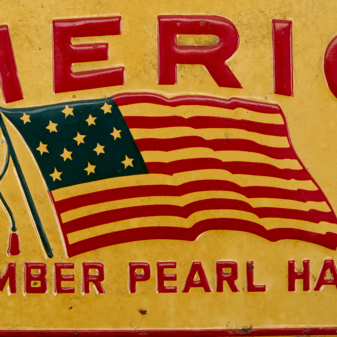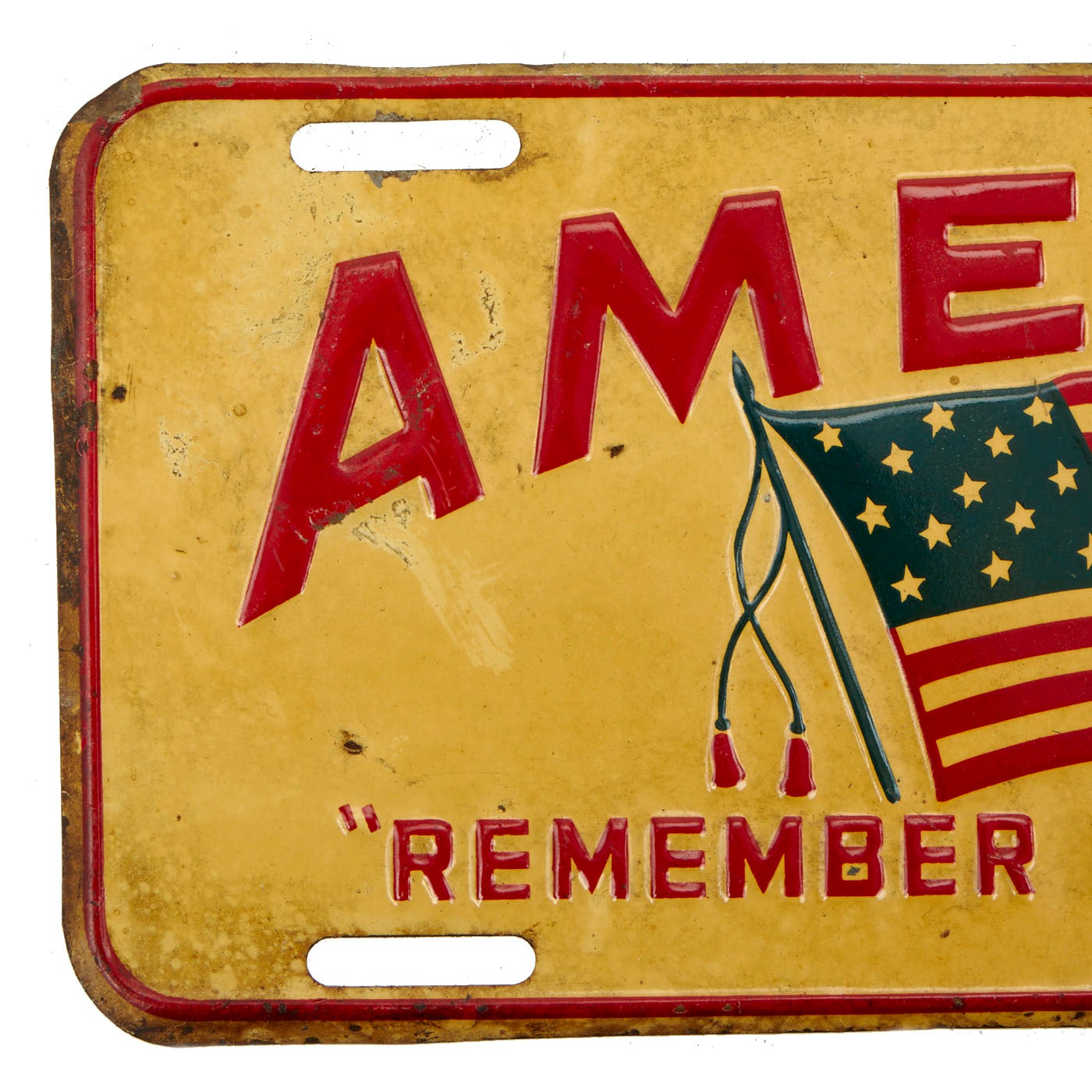Automobile Vanity Plate: This is another vehicle decorative plate displaying the same message as the other. The plate is constructed of the same type of thin steel and features an all yellow background with the word “America” in red above a beautiful American flag with the words “Remember Pearl Harbor” also in red beneath it. The colors still appear as if they did 80 years ago, they’re just a little dull due to being a little dirty. On the 4 corners of the plate you will find slots just like the ones similar in today's license plates for the purpose of mounting it on a vehicle. The plate measures 12 ½ x 5 ½ inches.