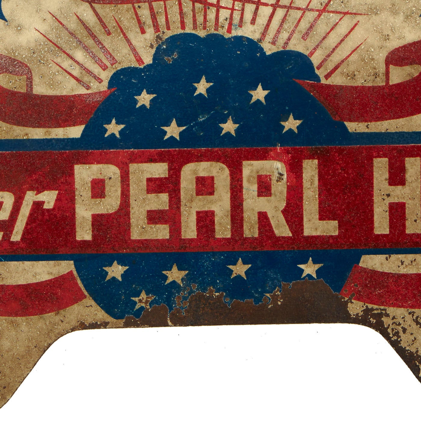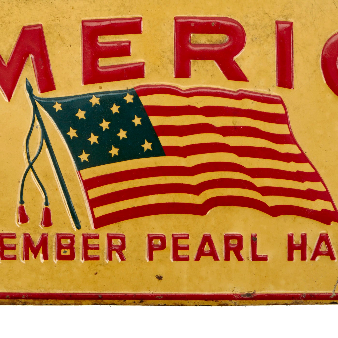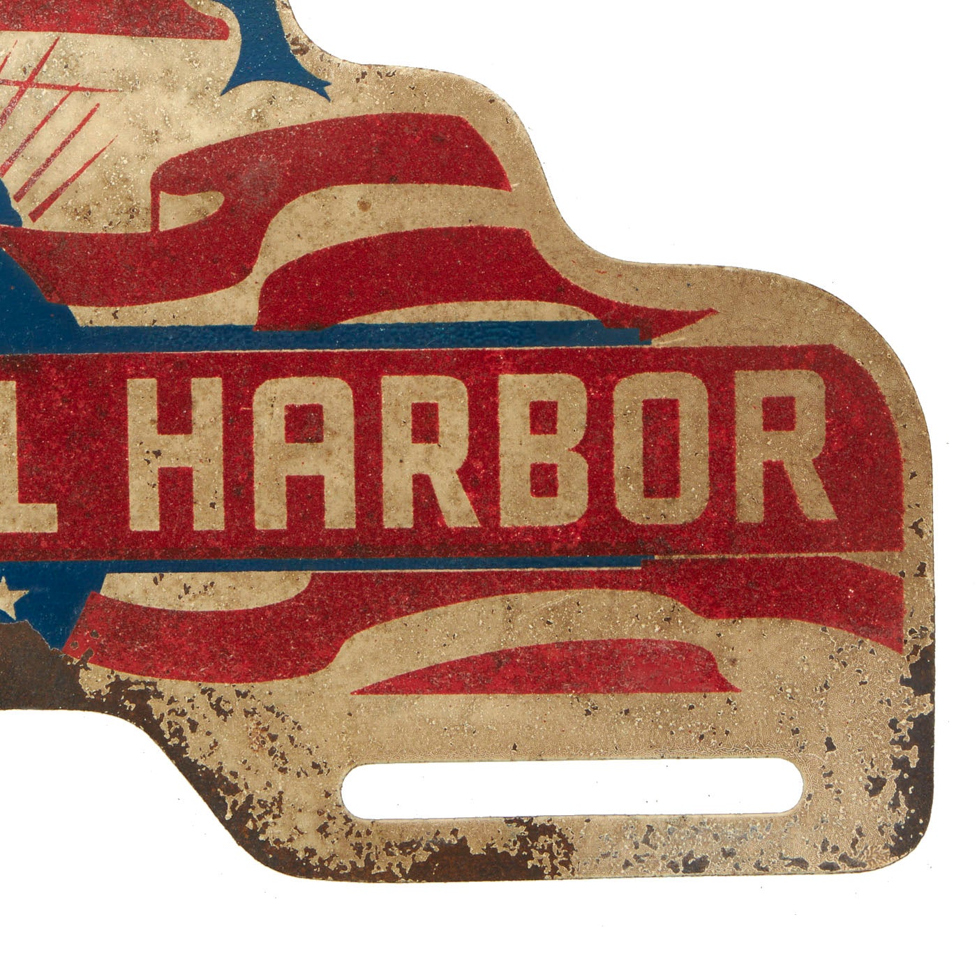 Original Items: Only One Available. These are incredible war time produced license plates for vehicles. The attack on Pearl Harbor on December 7, 1941 ignited not only anger towards the enemy, it also sparked a wildfire of patriotism in every American in all corners of the country. As the war effort was kicked into overdrive, Americans did everything they could to remind each other why they were fighting and what could be lost. A prime example of these reminders are the 2 license plate toppers you are looking at here. Both are very patriotic in nature and design, both with the slogan “Remember Pearl Harbor”. In the early years of WWII how could you not remember Pearl Harbor?