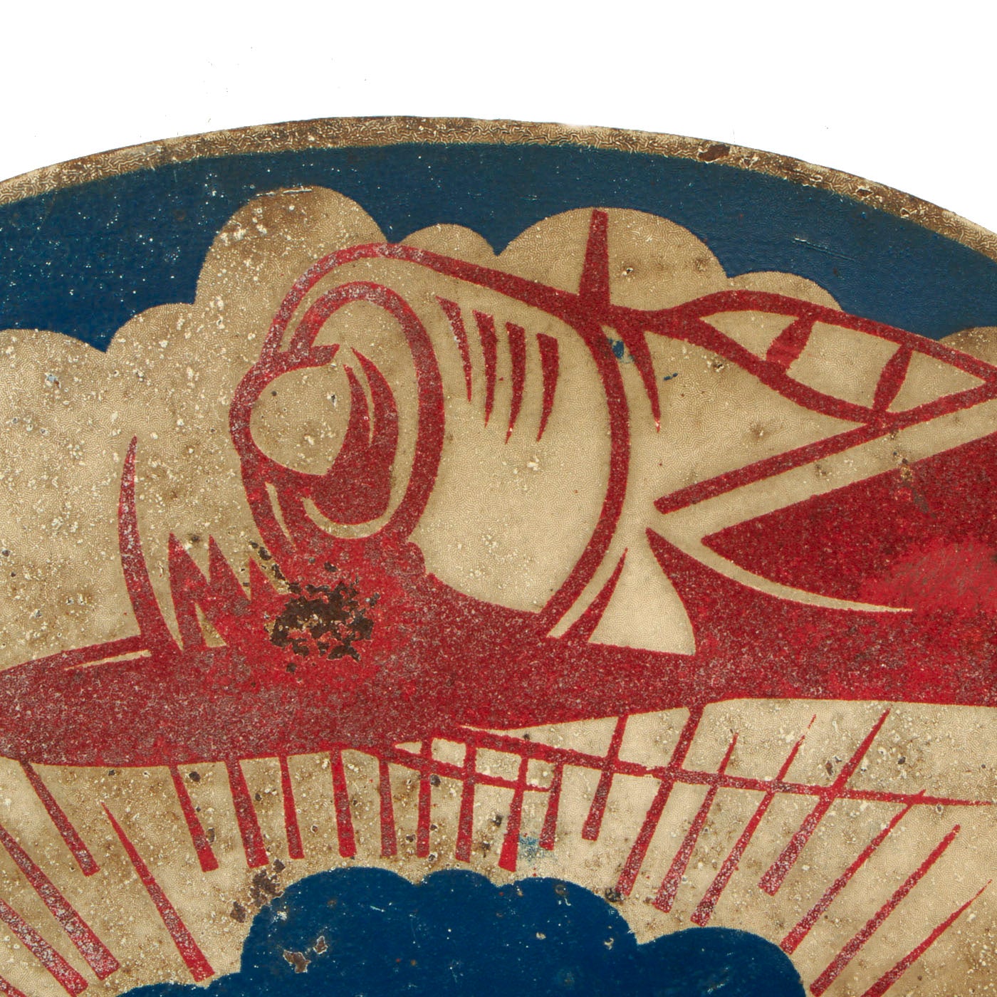 “Remember Pearl Harbor” License Plate Topper: This piece features a very patriotic motif of an American airplane flying over a red, white and blue banner with a cluster of white stars in front of a blue circular background. In the middle of the banner are the words “Remember Pearl Harbor”. It is made of a thin piece of sheet metal with 2 slots on the bottom so it could be attached to the top of your license plate on the front of a vehicle. The colors have faded in the past 80 years but the message is still very bright. The plate is measured at the widest points and that is 11 x 5 inches.