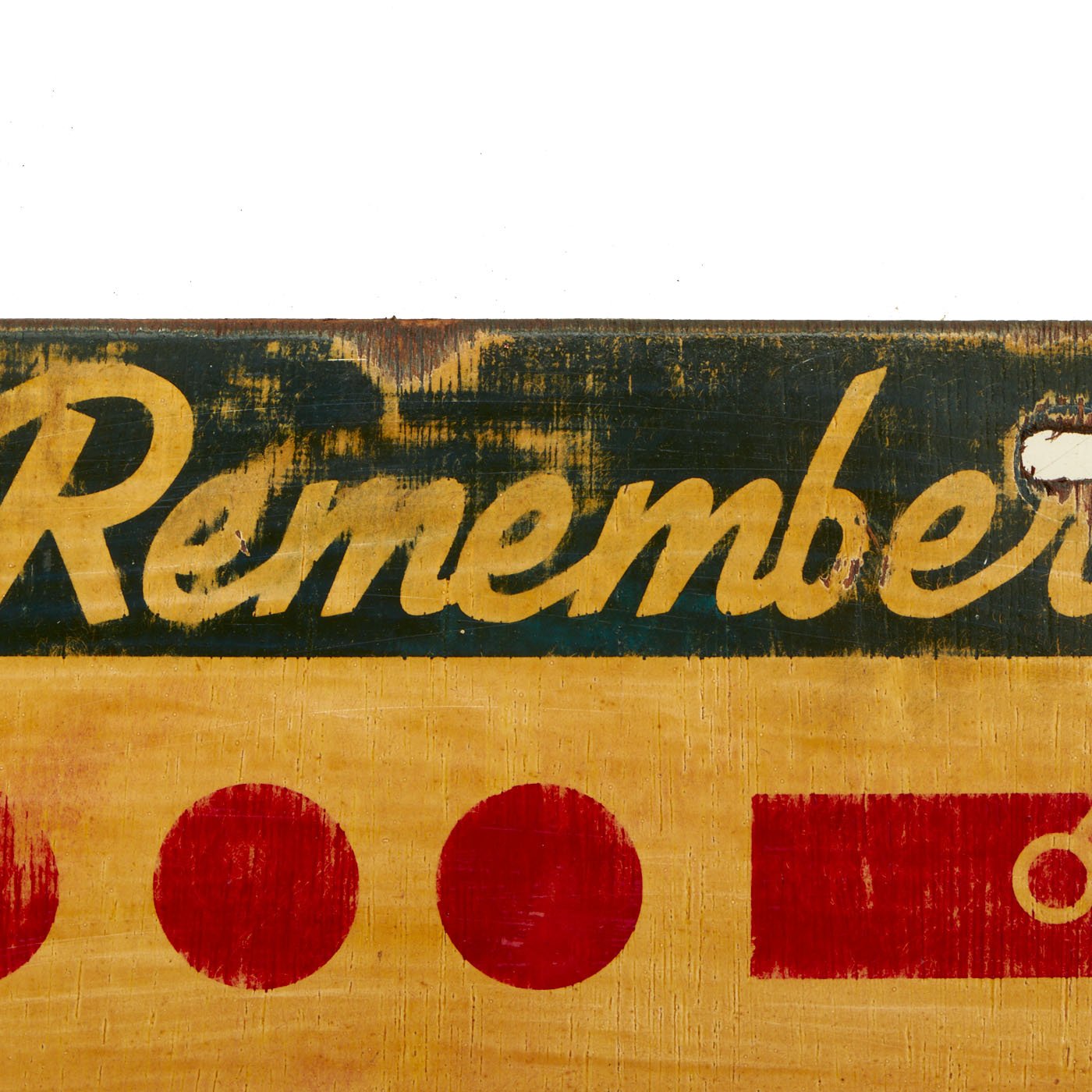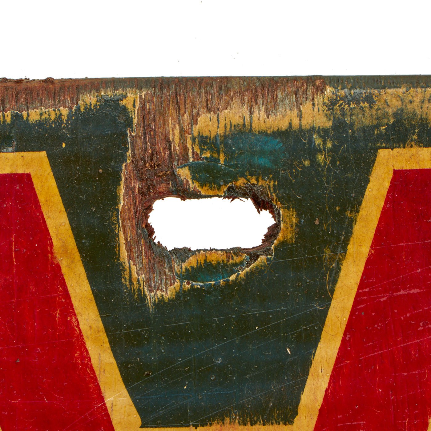 Typical homefront wartime construction, in an effort to save precious resources for the war industry, the plate was made by simply stenciling the design with paint on a die-cut piece of thin plywood. Many of these did not survive over the last eighty+ years! Shows an attractive patina and honest wear from use. Measures 12 1/4" x 6".