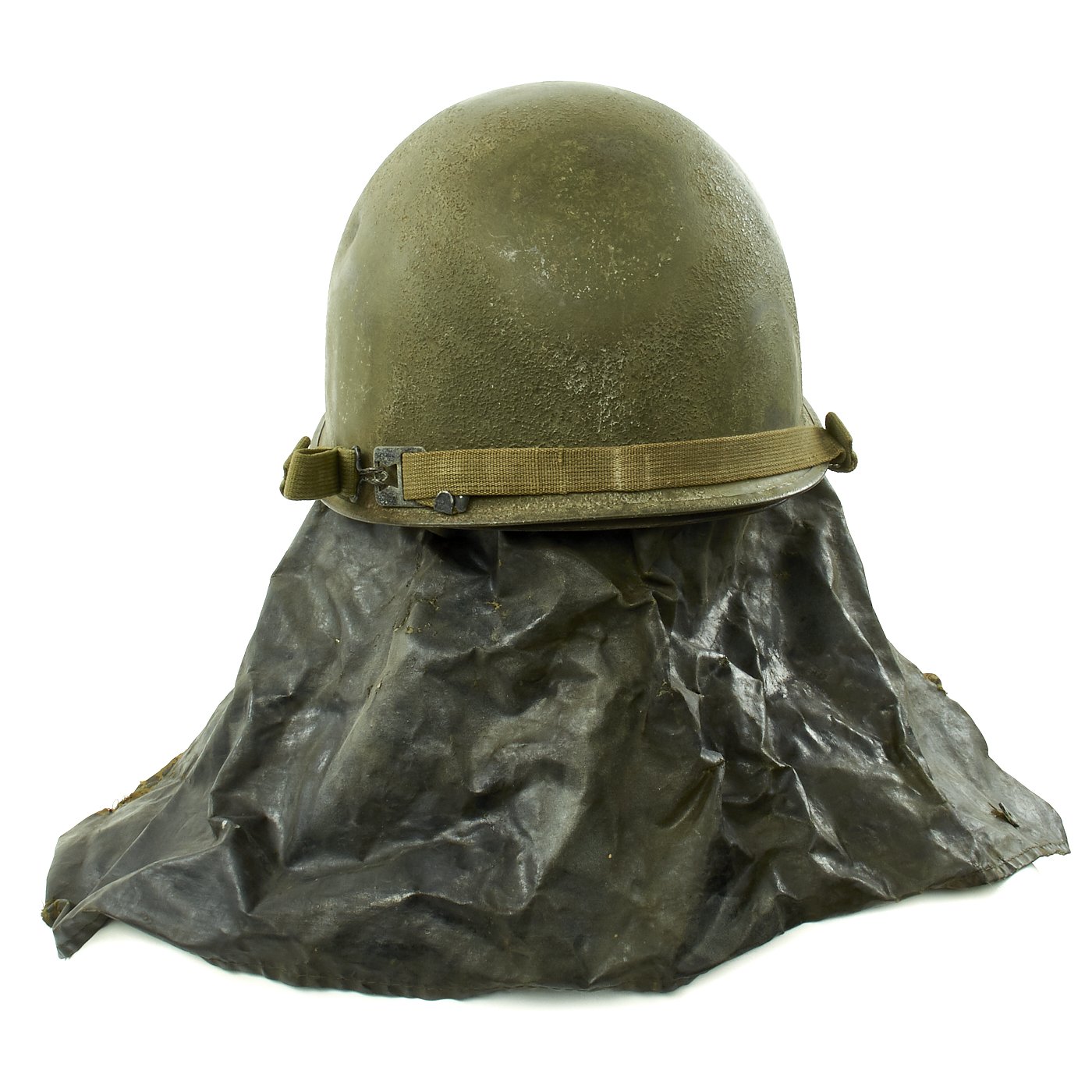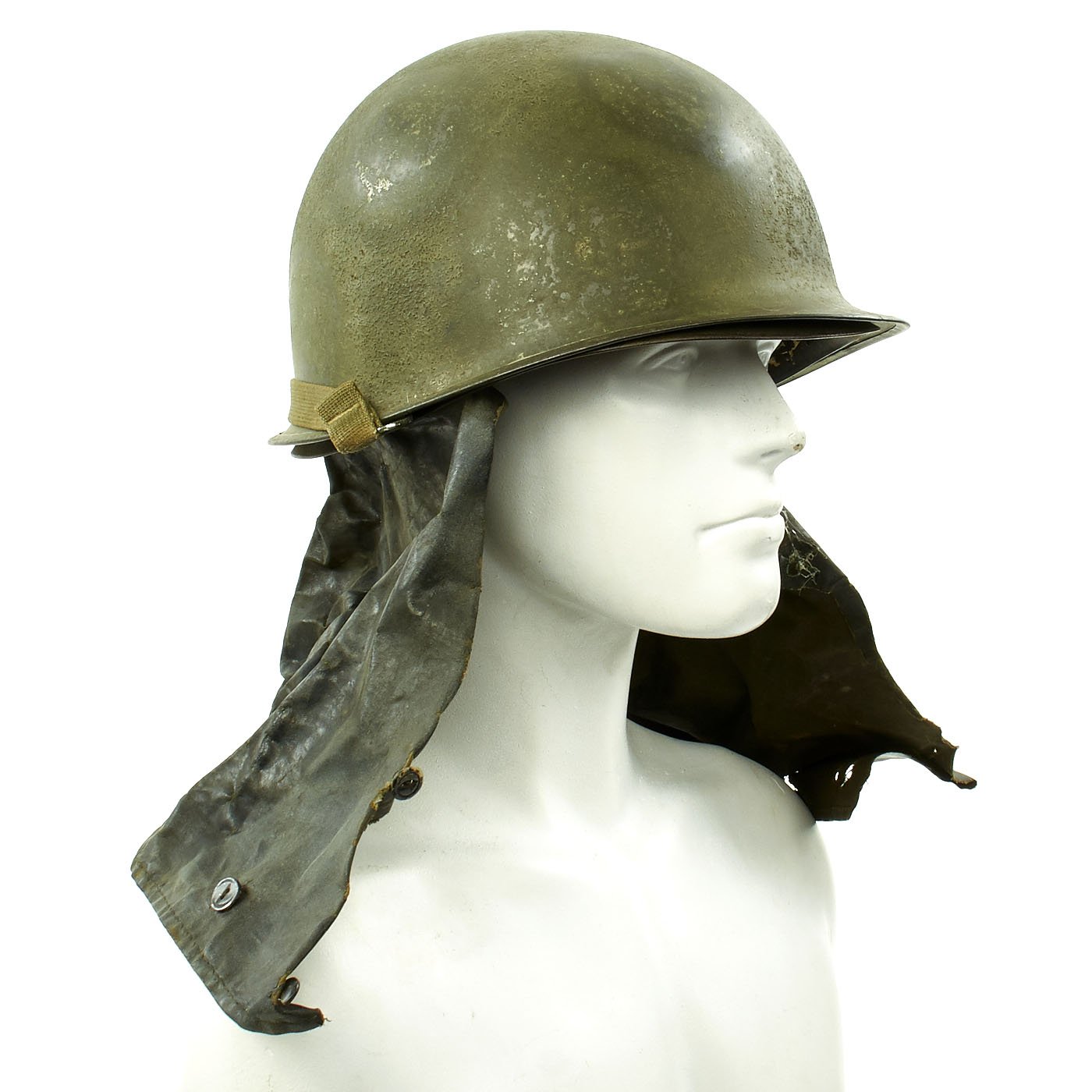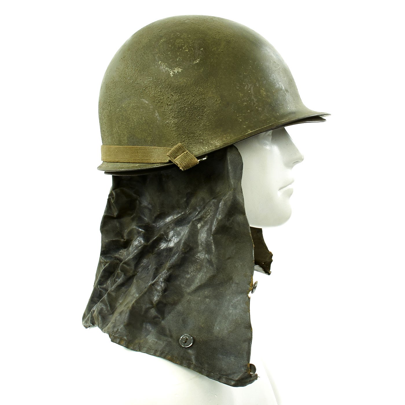 Attached to the reverse side of the liner is a custom made waterproof Havelock or neck flap which would aid the soldier in wet conditions, such as in the jungle or the rain.