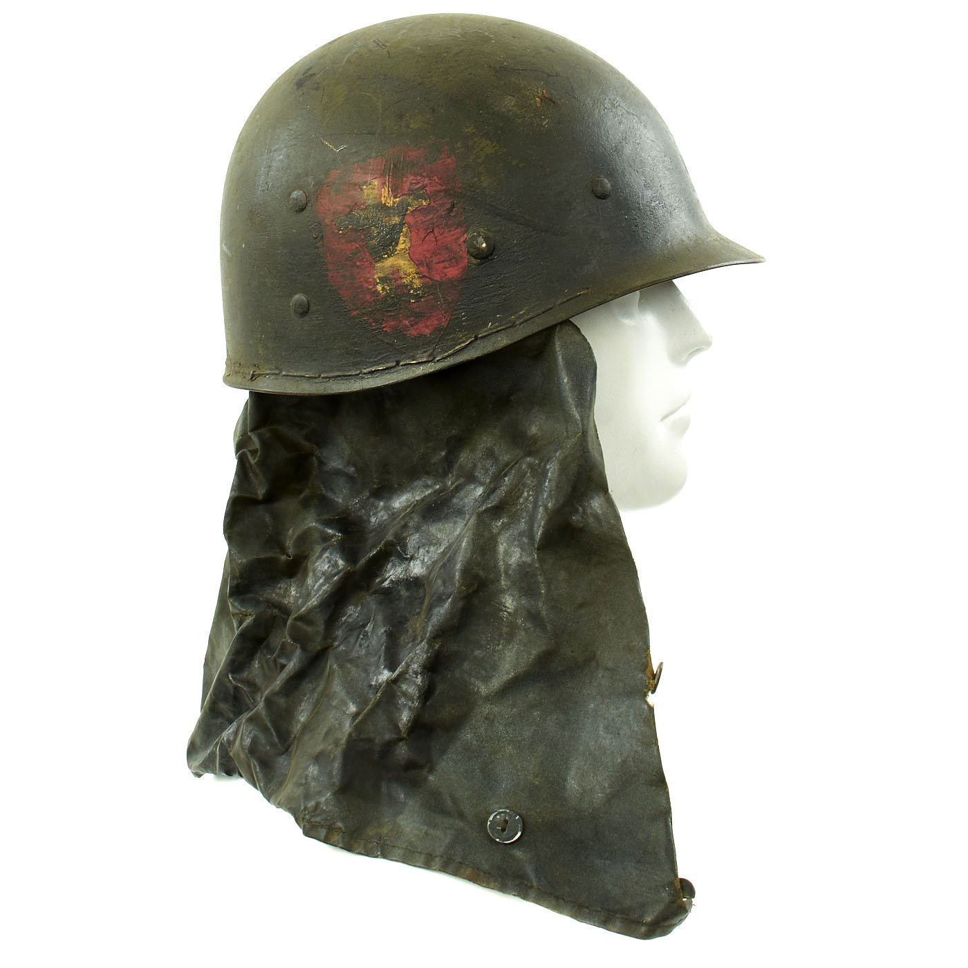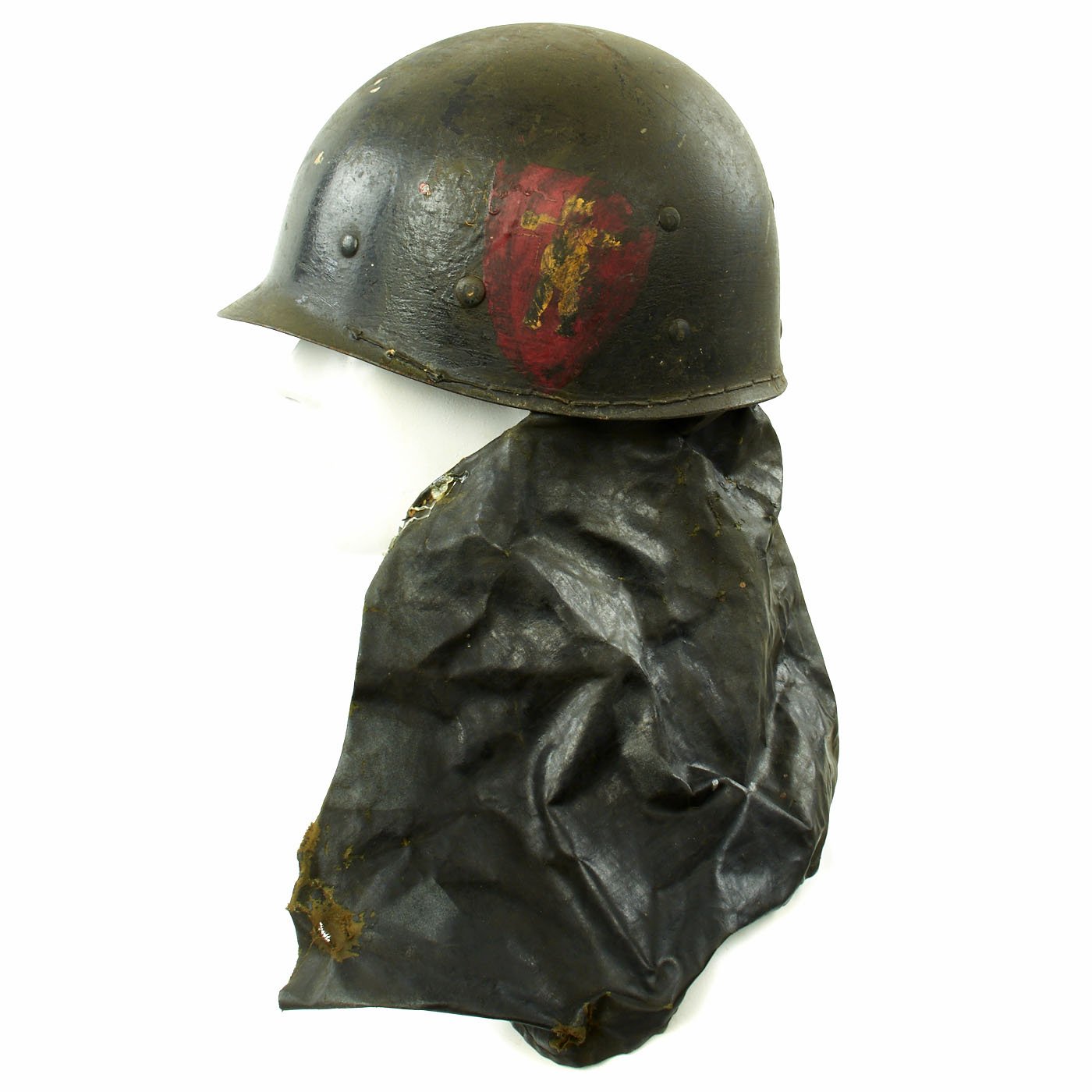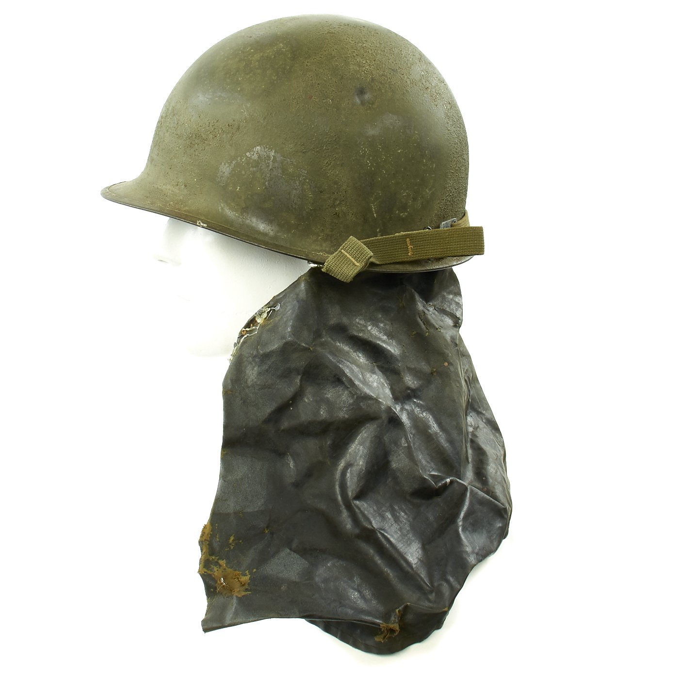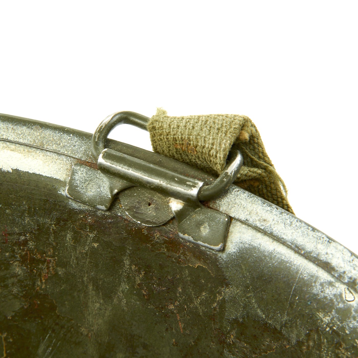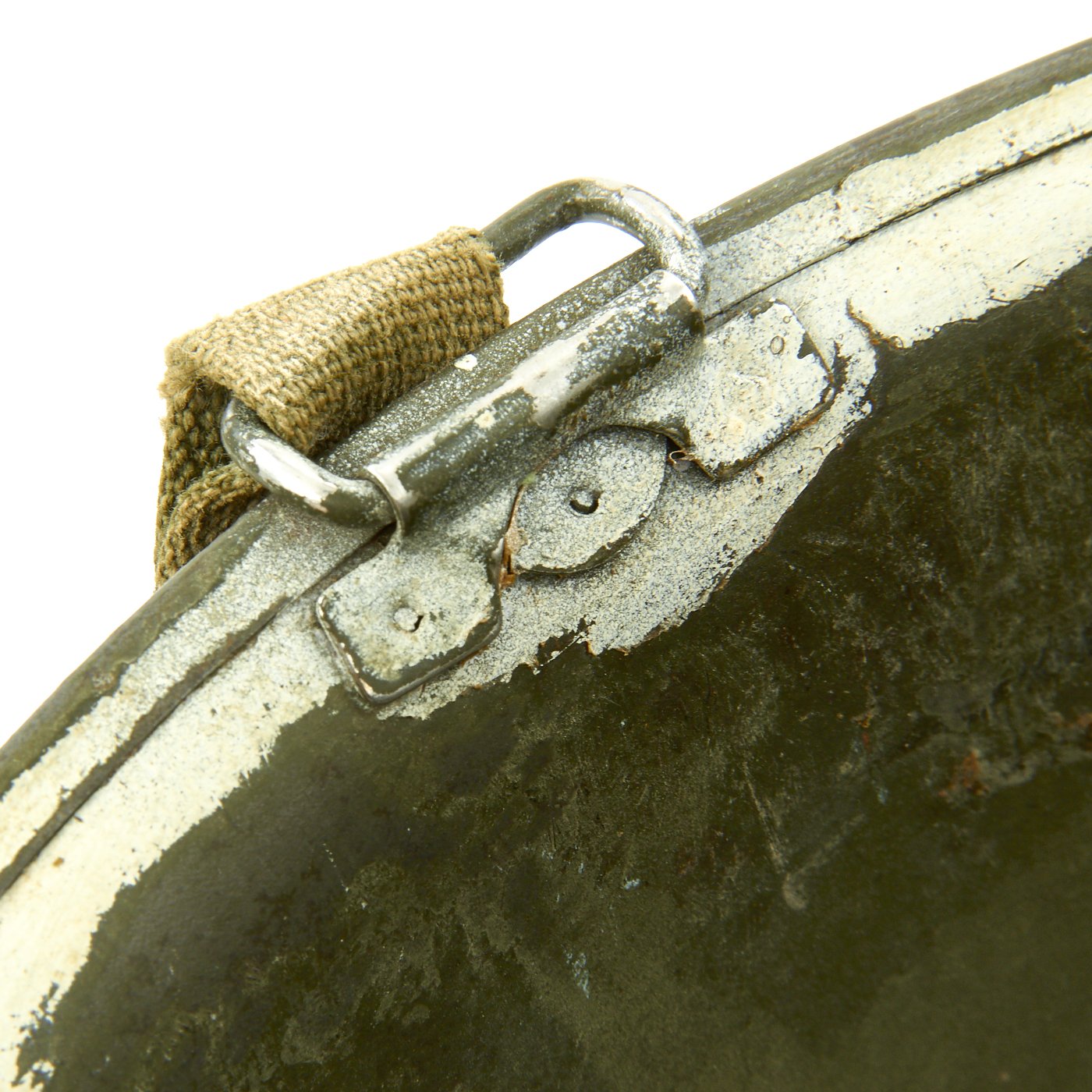 This rare helmet is an interesting example and still retains some of its original WW2 parts and paint. The steel shell is stamped S indicating Schlueter manufacture. M-1 helmet shells had s stainless steel rim. These rims were both rust resistant and had "non-magnetic qualities" that reduced the chance of error readings when placed around certain sensitive equipment (such as a compass). This helmet features the correct front seam rim and later war swivel bales.