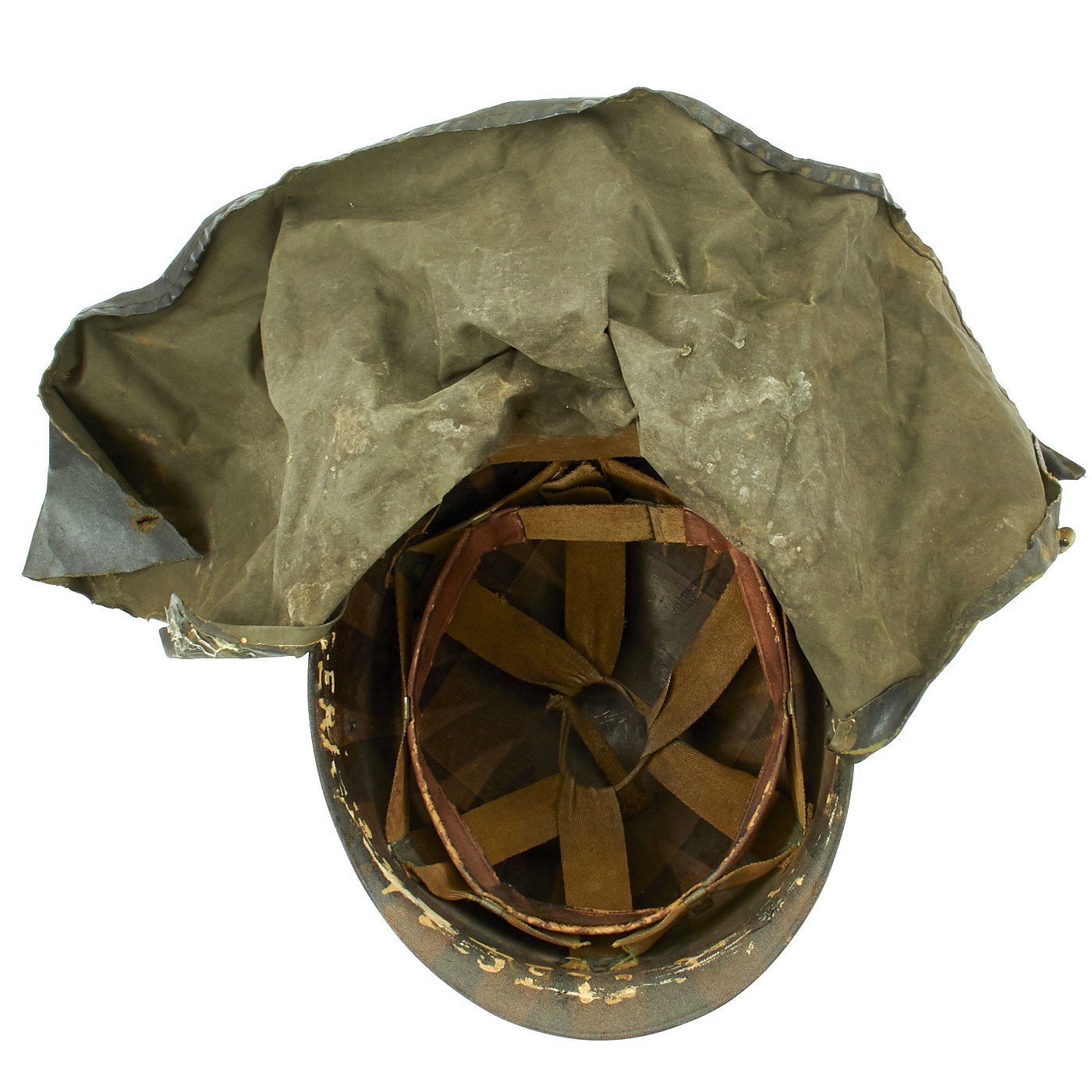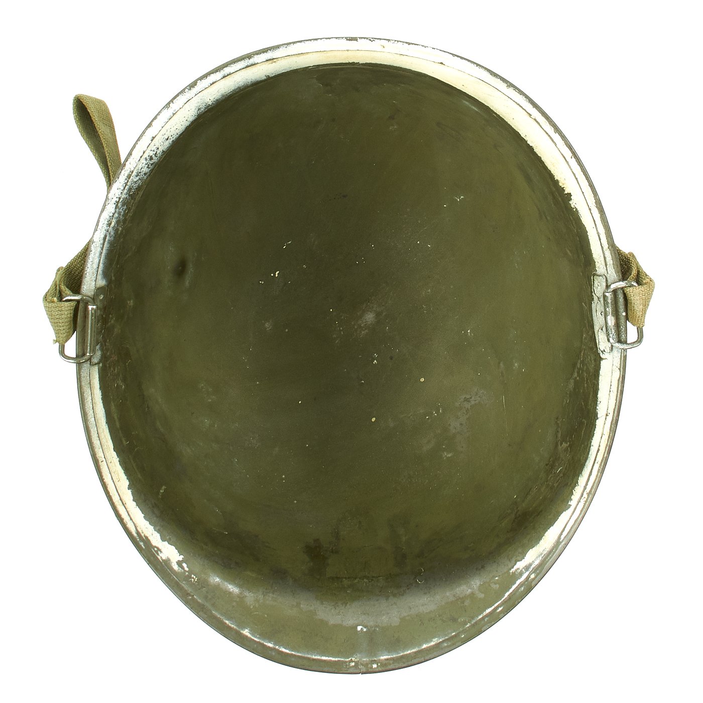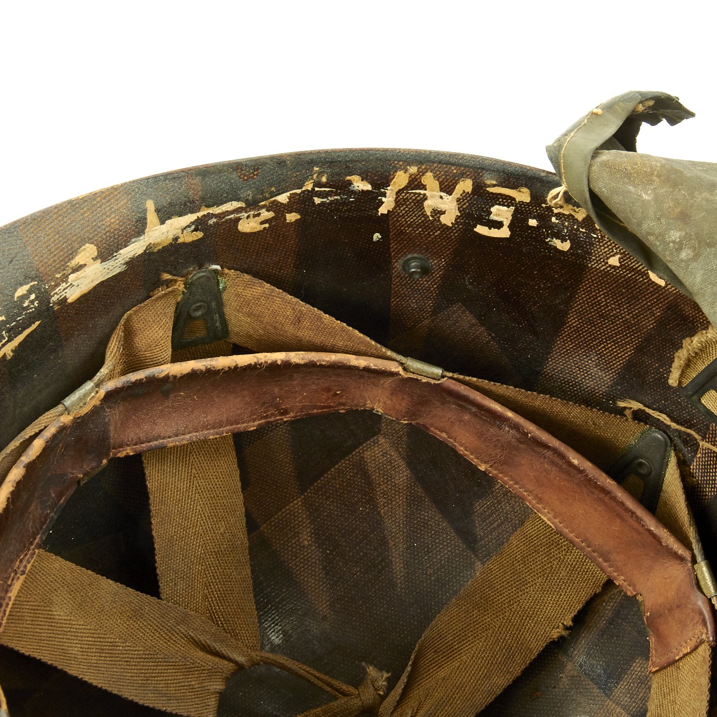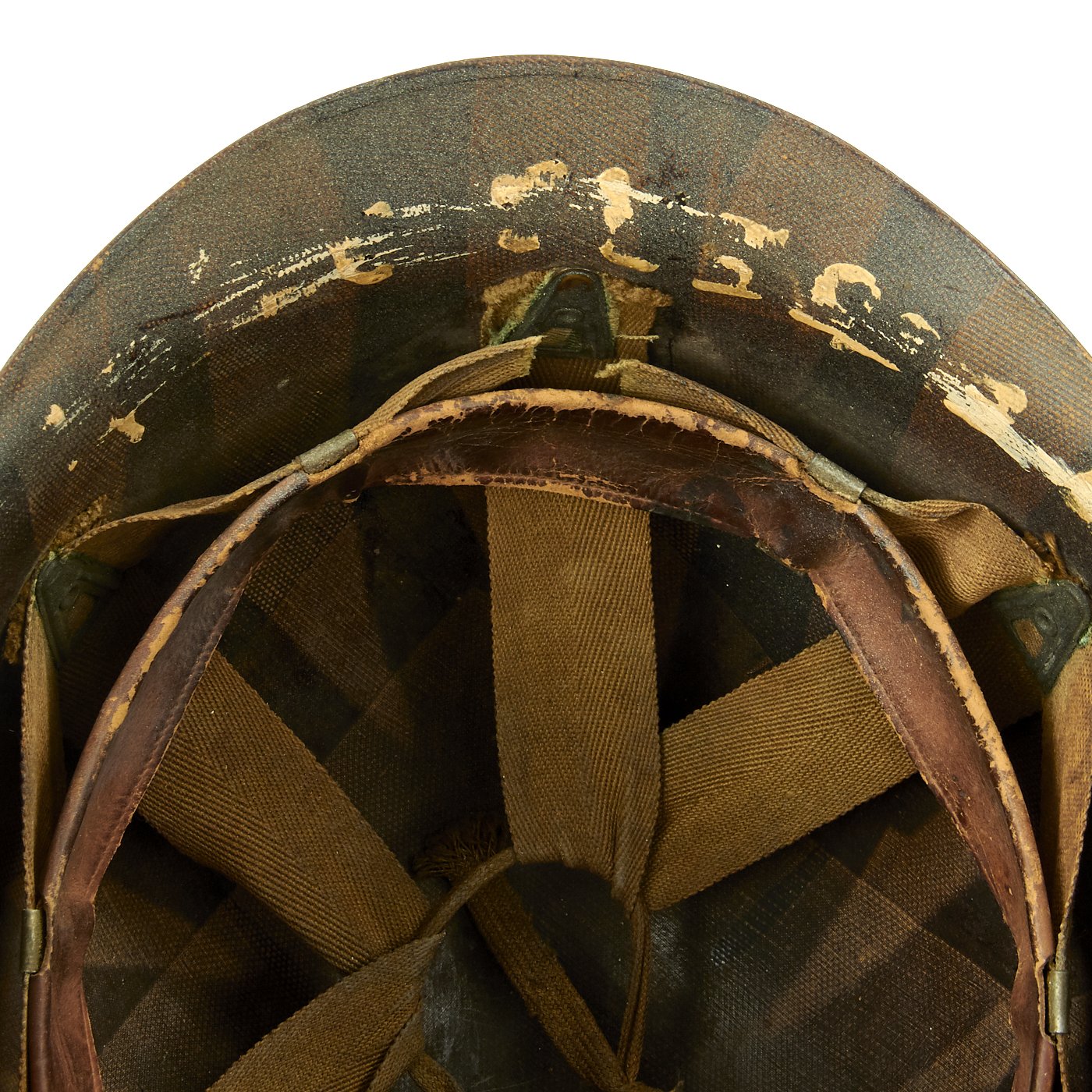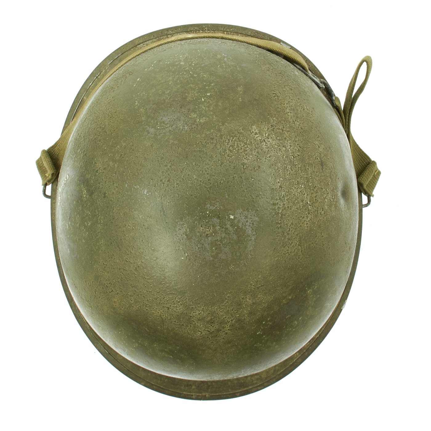 A true US WWII M-1 helmet liner can usually be identified through the frontal eyelet hole. Other correct WW2 features include cotton herringbone twill (HBT) cloth suspension. This HBT suspension is held tightly within the M-1 helmet liner by rivets and a series of triangular "A" washers. The three upper suspension bands are joined together with a shoestring. This way the wearer could adjust the fit.