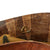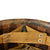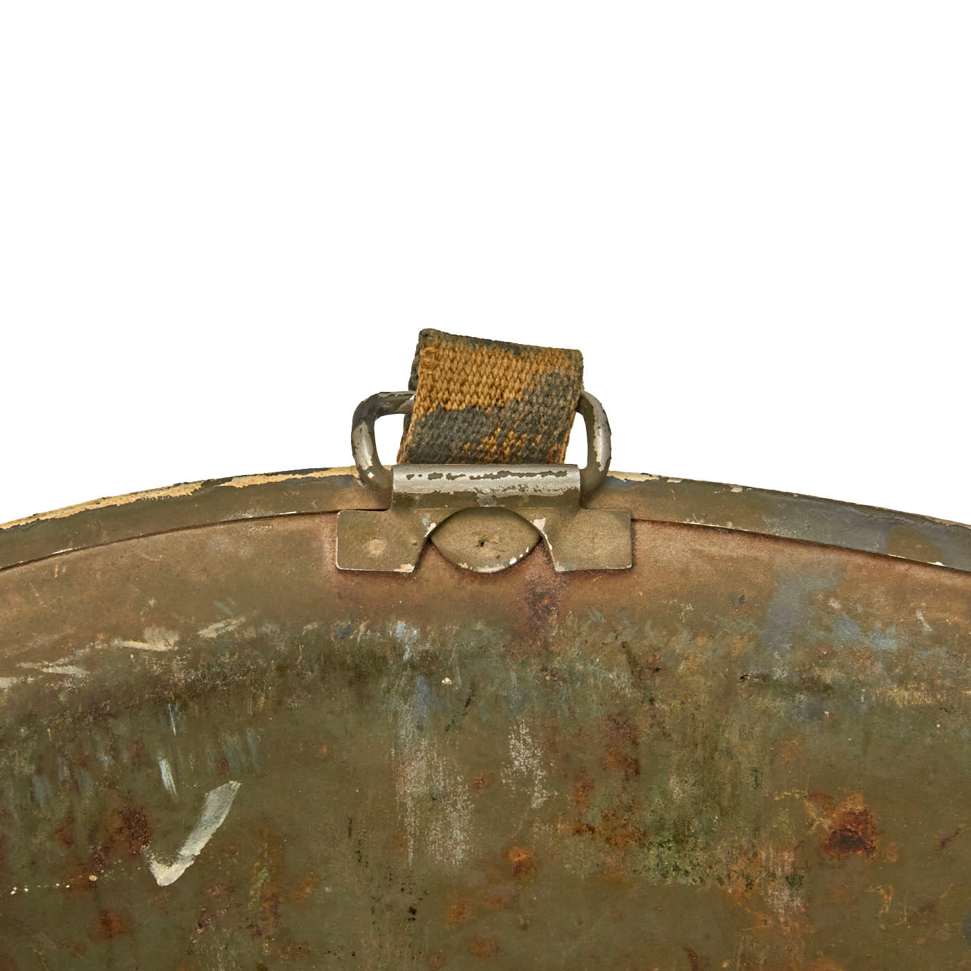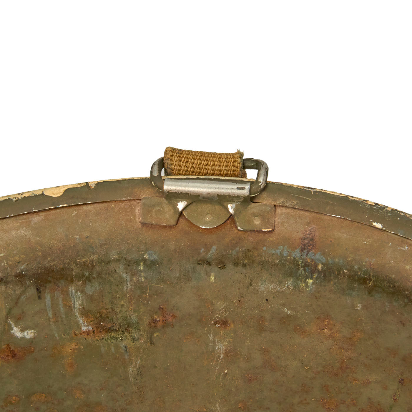 This M-1 helmet shell was originally designed with a stainless steel rim with seam in the front. Stainless steel rims were both rust resistant and had "non-magnetic qualities" that reduced the chance of error readings when placed around certain sensitive equipment (such as a compass). In 1944, due to issues with paint flaking off the bright stainless steel, the rim material was switched to non-magnetic manganese steel. This material was not as shiny and retained the paint far better. Slightly later, a "rear seam" design was implemented. This helmet features the correct late war manganese steel rim with rear seam and swivel bales.