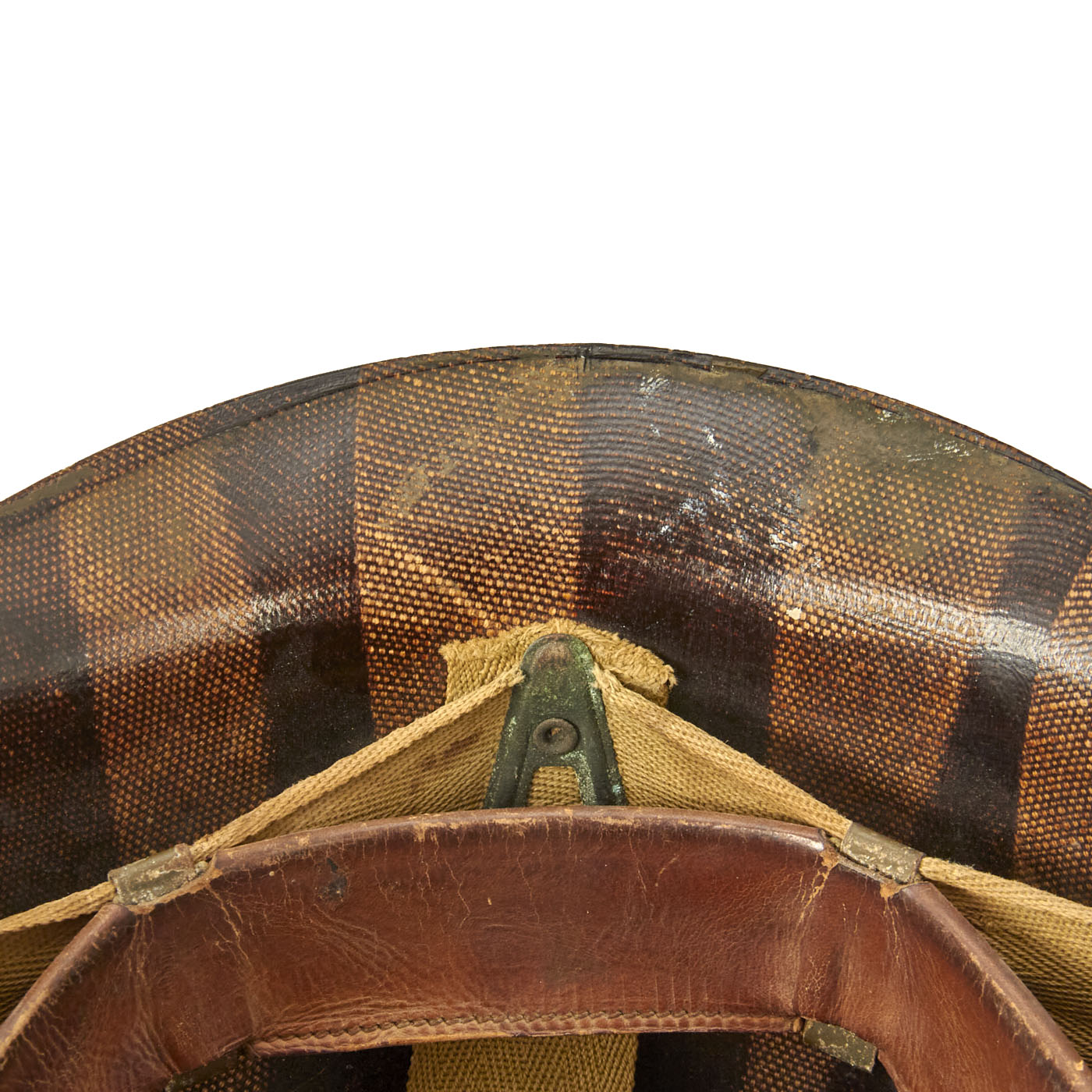 The shell chinstrap is present and intact, with wear from age and service. The shell strap is the correct OD Green #7 from a late war helmet, with a stamped steel buckle. It shows light wear, with some tearing near the bales, but nothing major. There are “haze gray” paint stains visible on the chin straps, evidence that the Corpsman helped with the preservation of the ship while underway. Like many helmets, this example has the chin strap fastened behind the helmet, and has for some time. The included OD Green #7 helmet net is in good condition, and is the type with a securing string around the edge, like the British used.