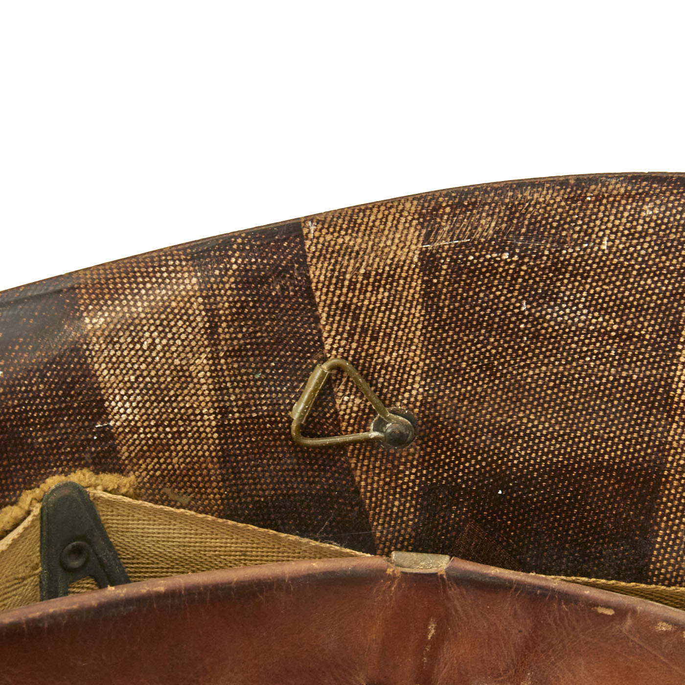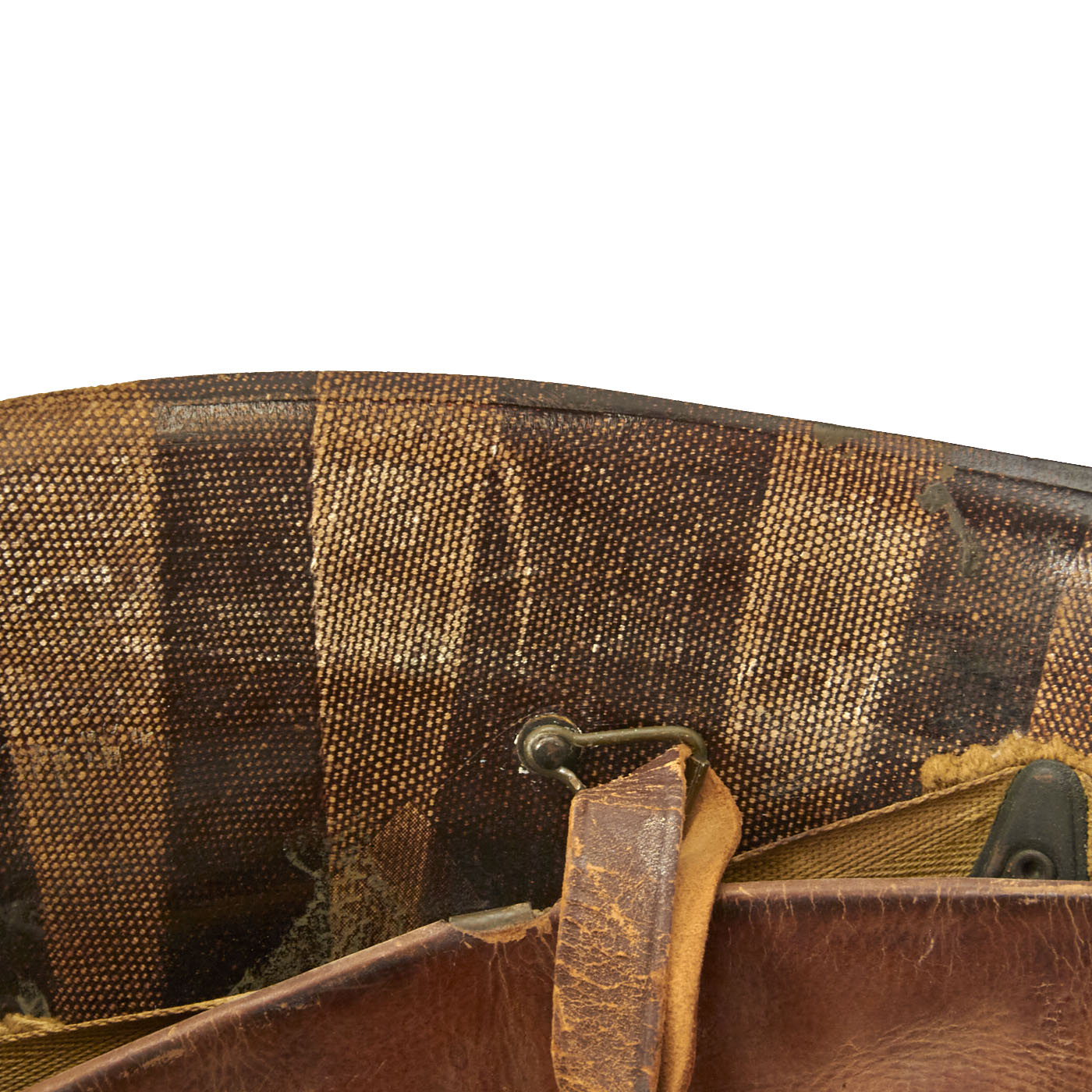 This nice late war production helmet is a fine example and still retains all of its original WWII parts and white paint with 4 “Red Crosses”, with some light wear from service. The steel shell is marked with a large S and heat lot stamped 264A, dating manufacture to early-mid 1944, after the switch to the manganese steel rim with a rear seam. The small round welds on the seam and chin strap bale bases are also definitive for a Schlueter helmet shell.