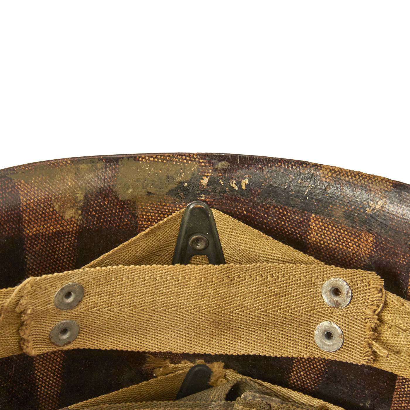 This true US WWII M-1 helmet liner can be identified through the frontal eyelet hole. Other correct WW2 features include cotton herringbone twill (HBT) cloth suspension. This HBT suspension is held tightly within the M-1 helmet liner by rivets and a series of triangular "A" washers. The three upper suspension bands are joined together with a shoestring. This way the wearer could adjust the fit.