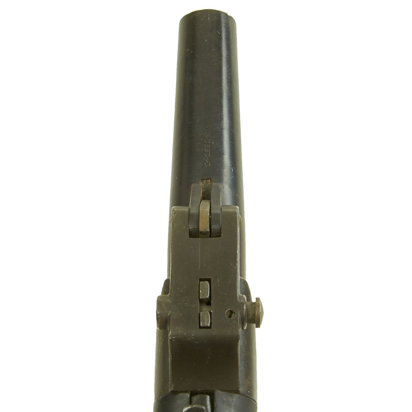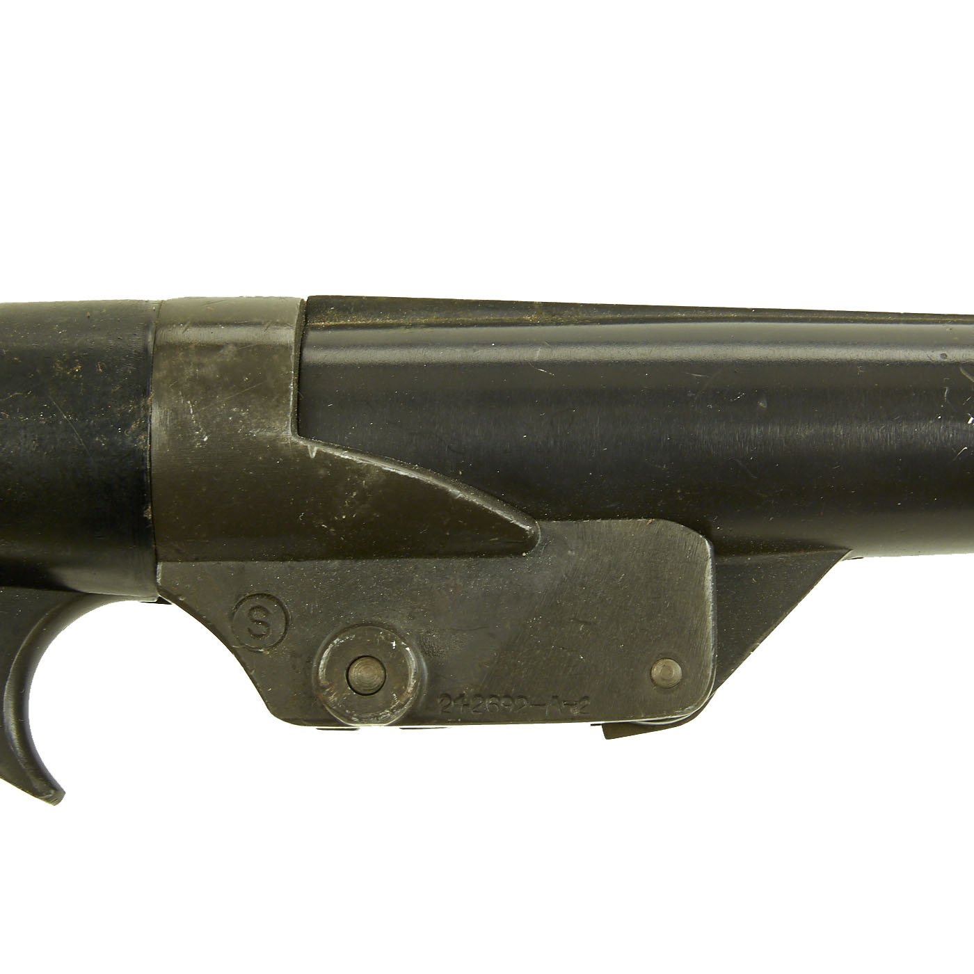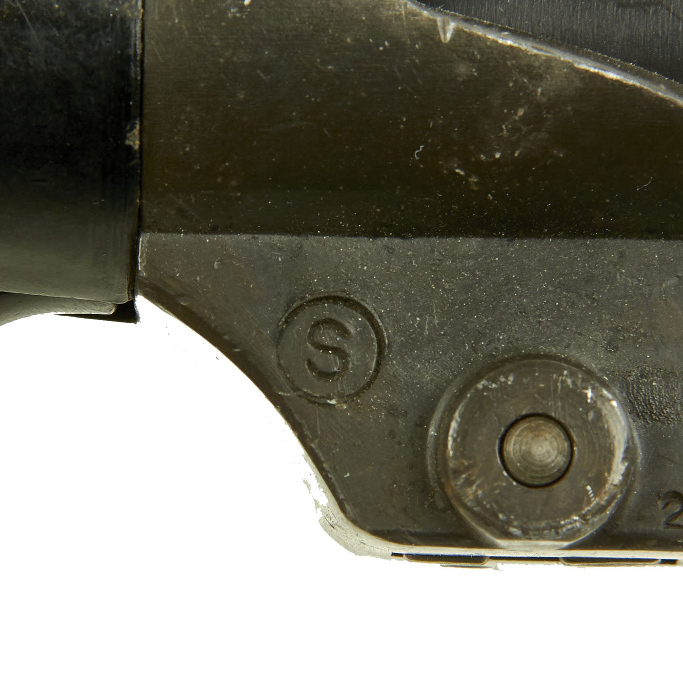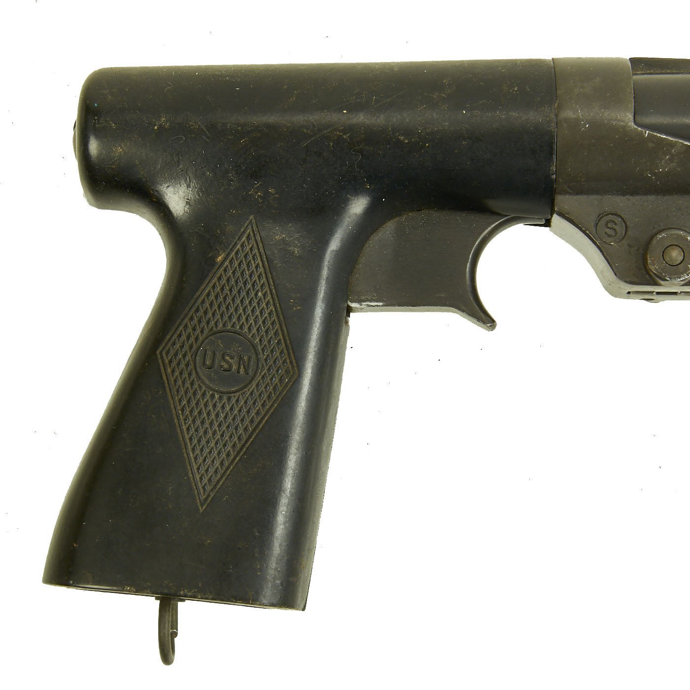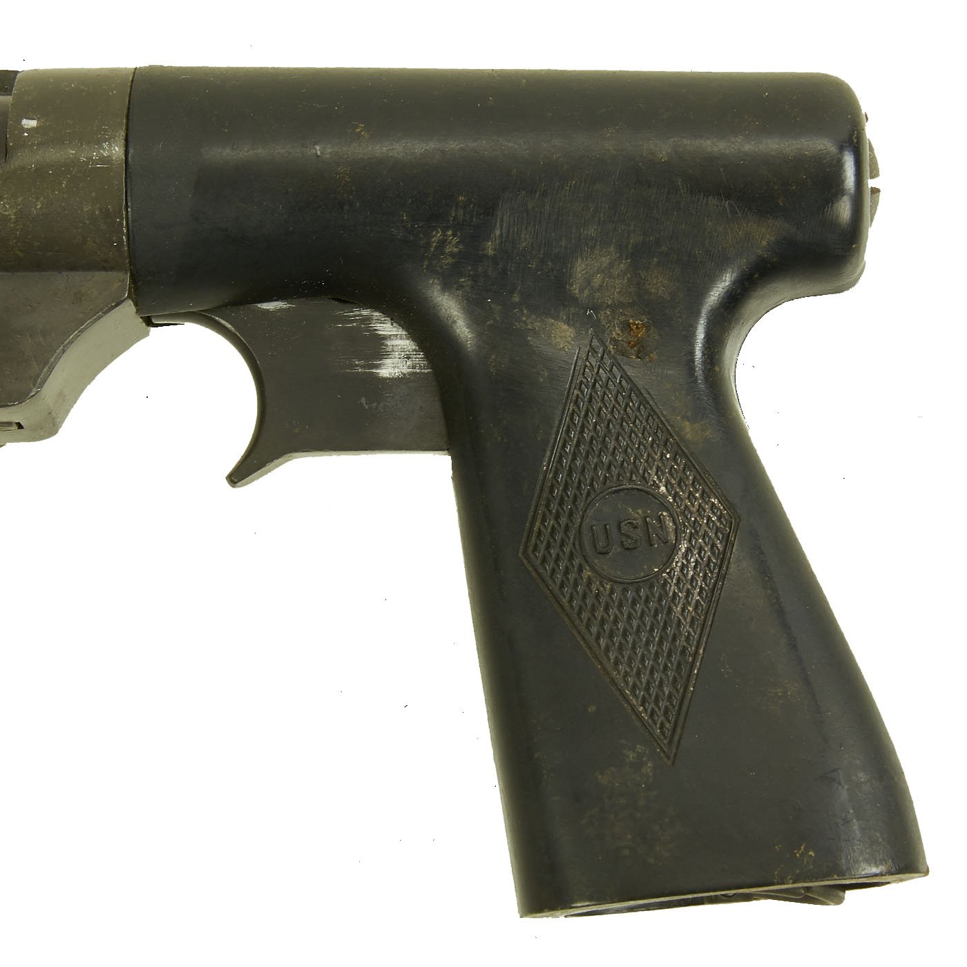 The grips are marked USN on both sides, which is uncommon, as often the marking was removed when being sold out of Navy storage. The barrel, frame, and grip are all marked with part number 242692, each with a different number suffix. There is also S in a circle on the right side of the breech. Pistol is functional and retains its complete firing pin.
