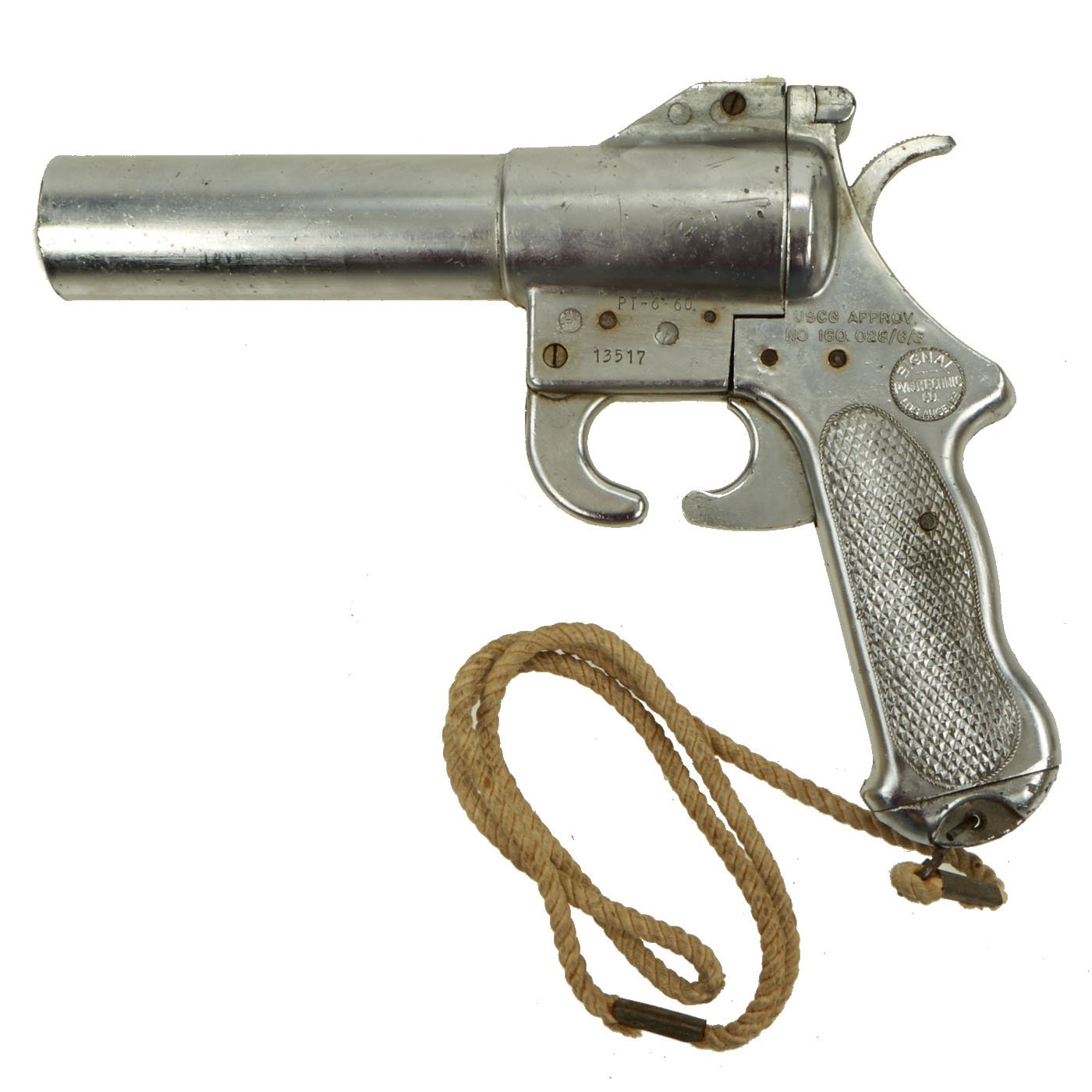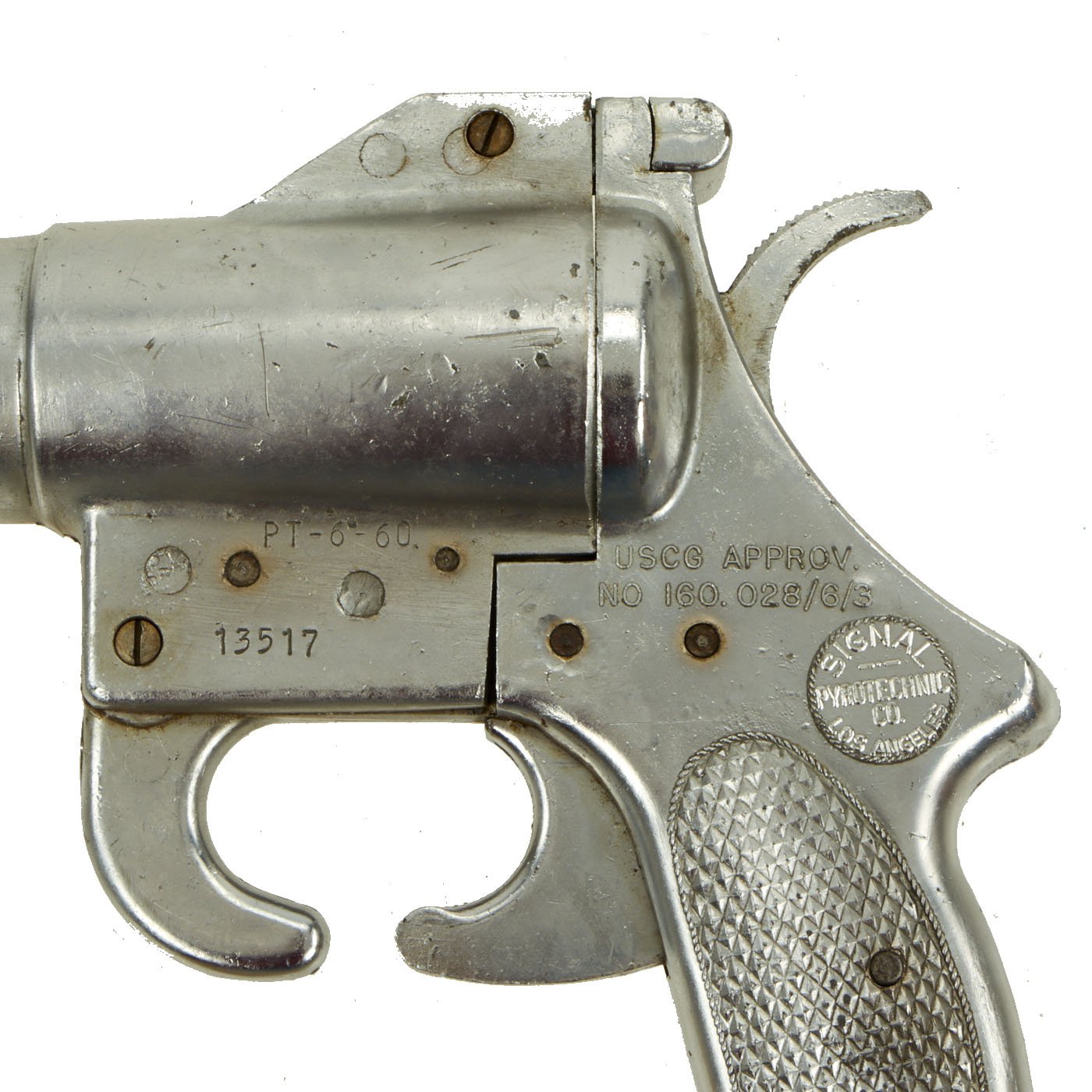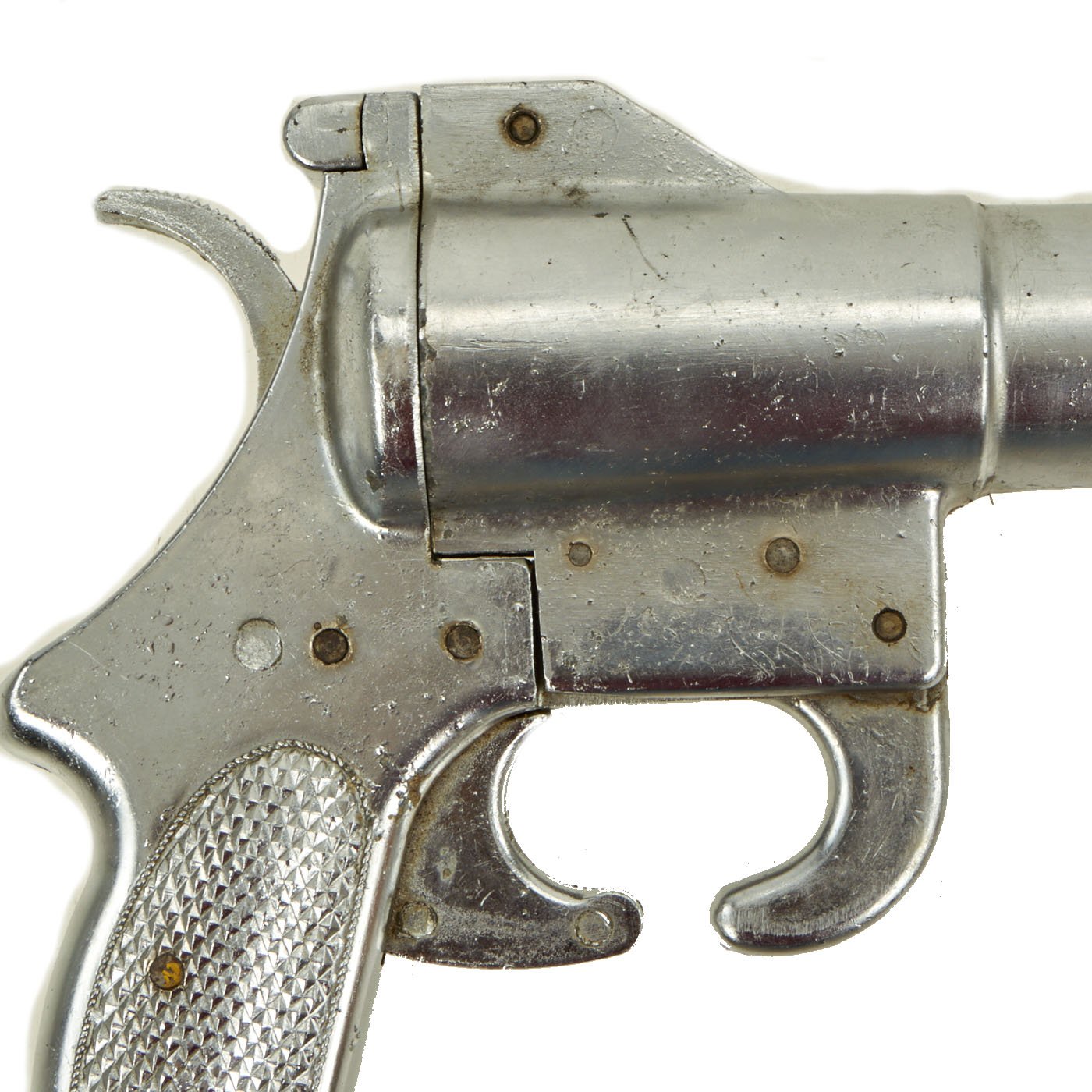 Original Item: Only One Available. WWII U.S. Navy Flare/ Signal Pistol made by Signal Pyrotechnic Company of Los Angeles, California during WWII. This is a very large flare gun intended to launch (approximately) 37mm flares. Chrome finish to inhibit rust aboard ship, this pistol measures 11"x8.5" with a 1.5" barrel opening.