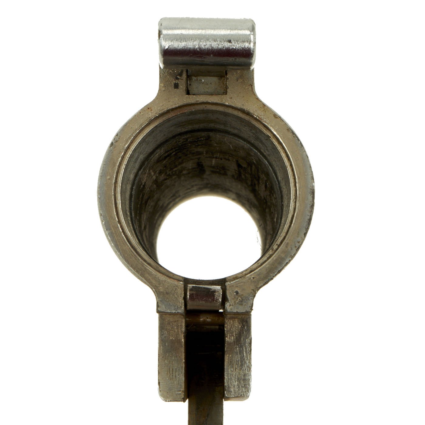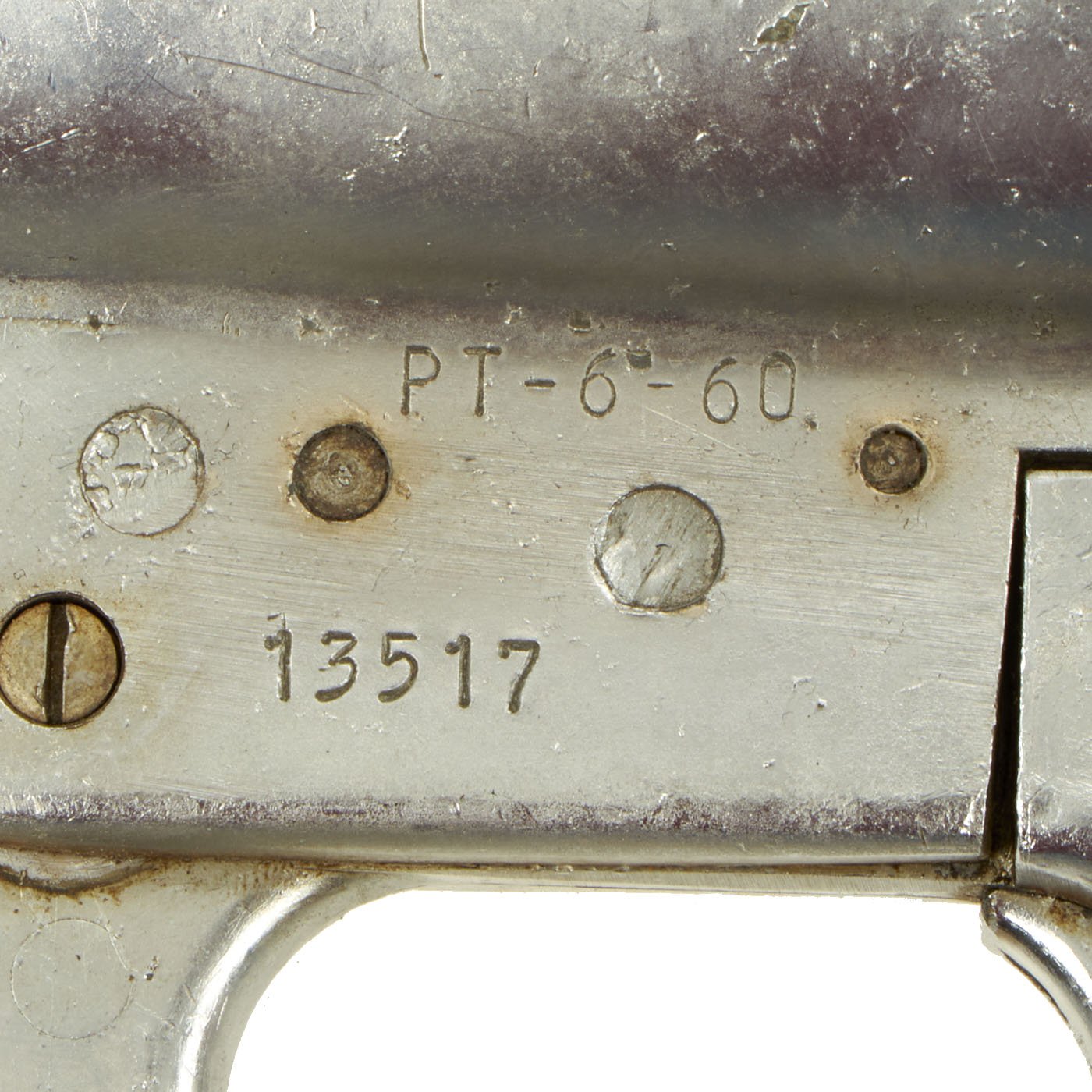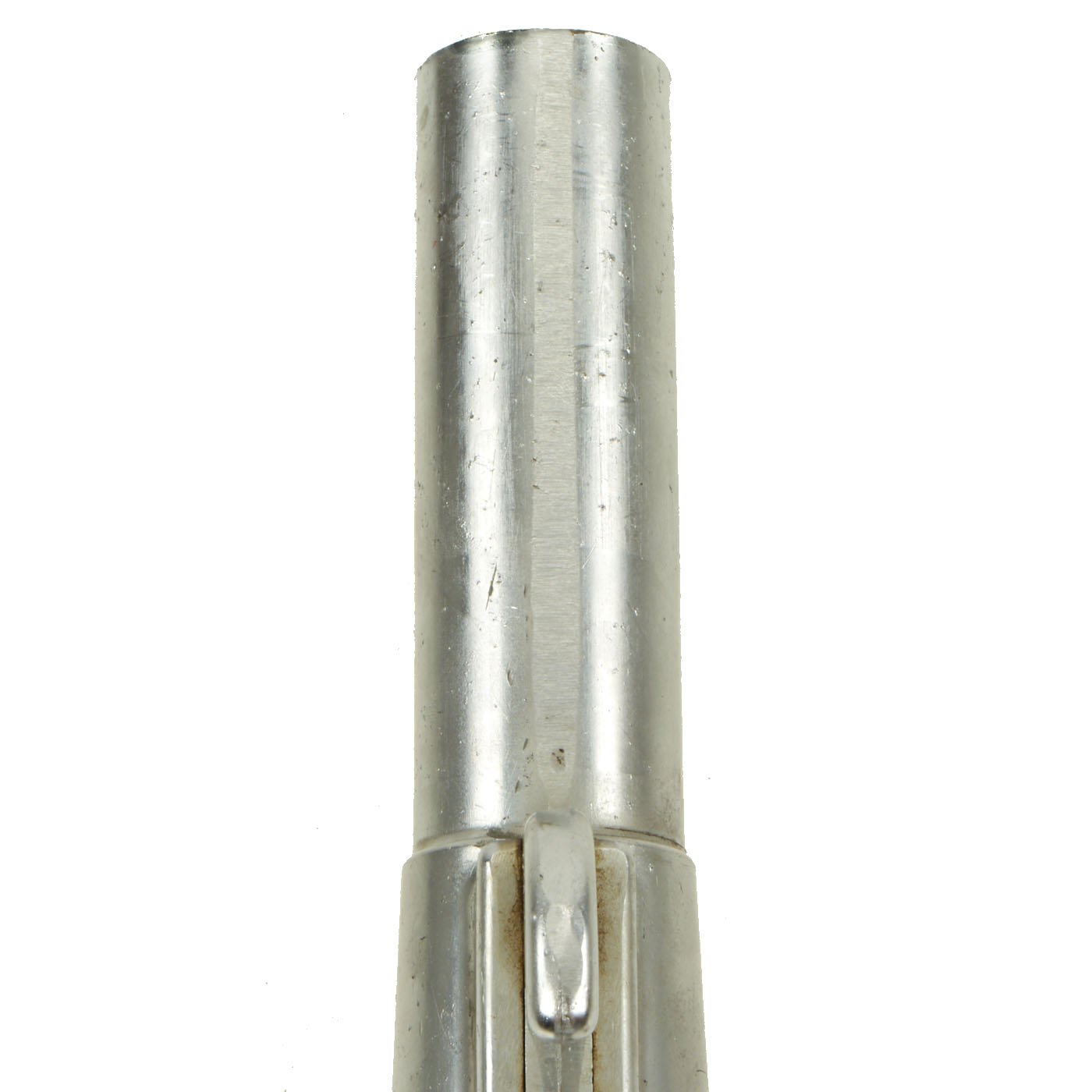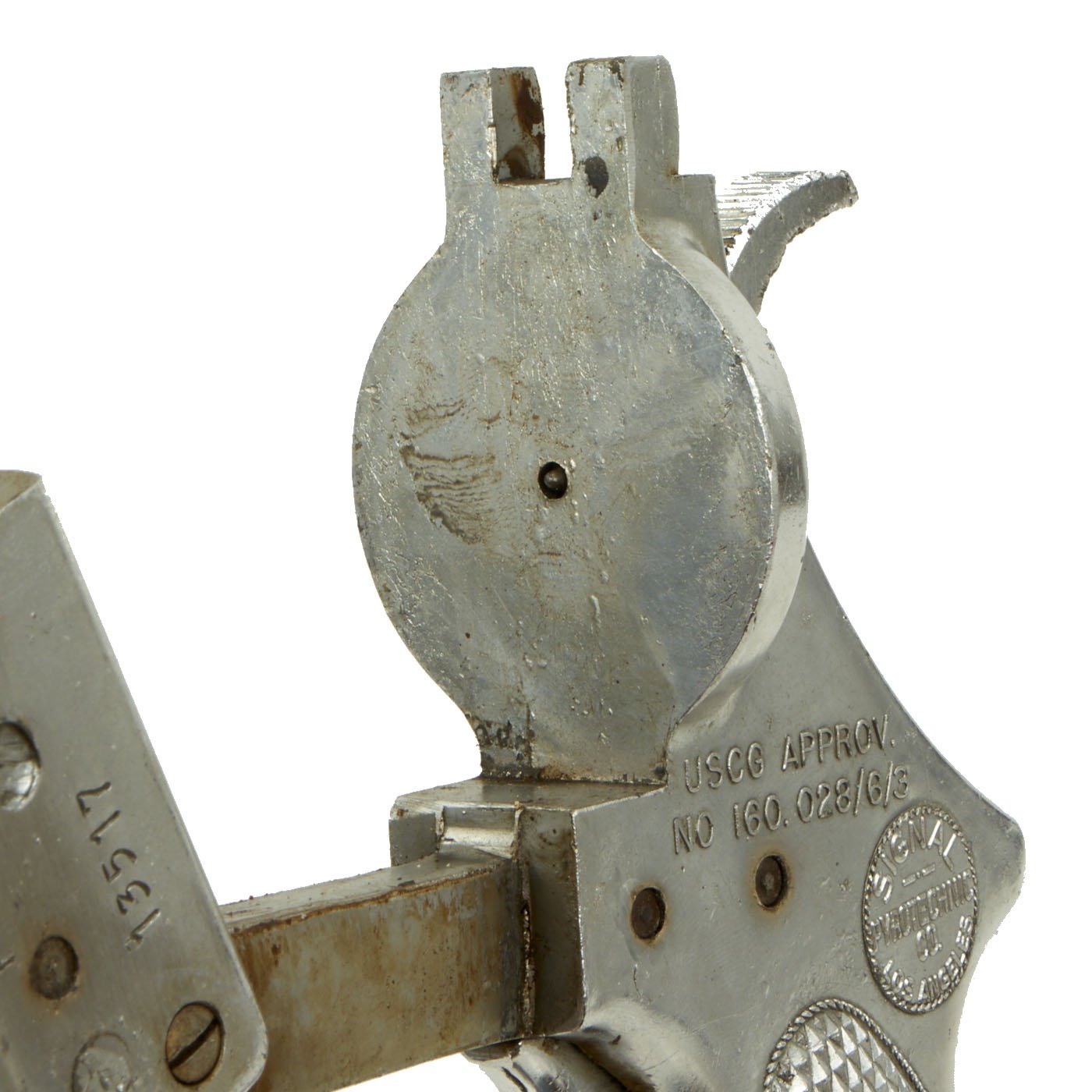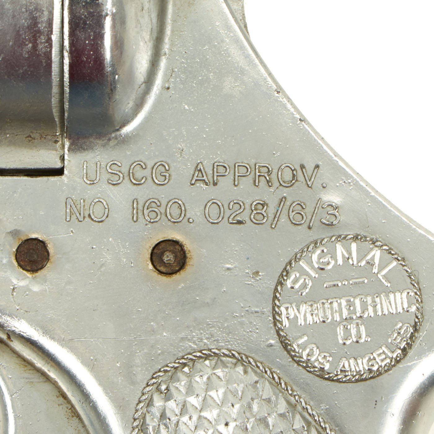 This pistol is features a break-open operation. Embossed on both side of the crosshatch grip in raised letters: SIGNAL / PYROTECHNIC CO. / LOS ANGELES. The Chrome plated steel barrel has very chrome loss. Very good markings and condition with only a few very minor surface blemishes. The serial number is 13517. Excellent overall condition, in complete working order with firing pin still present. The original white canvas lanyard is still intact as well!