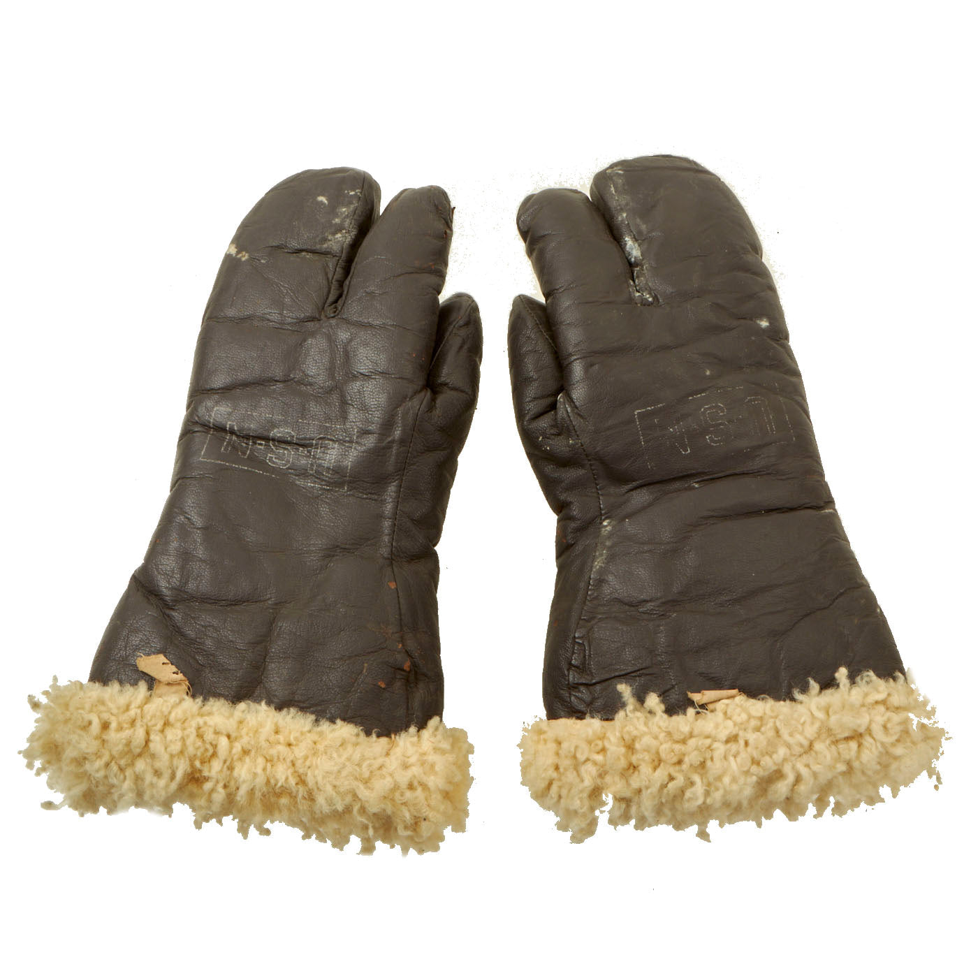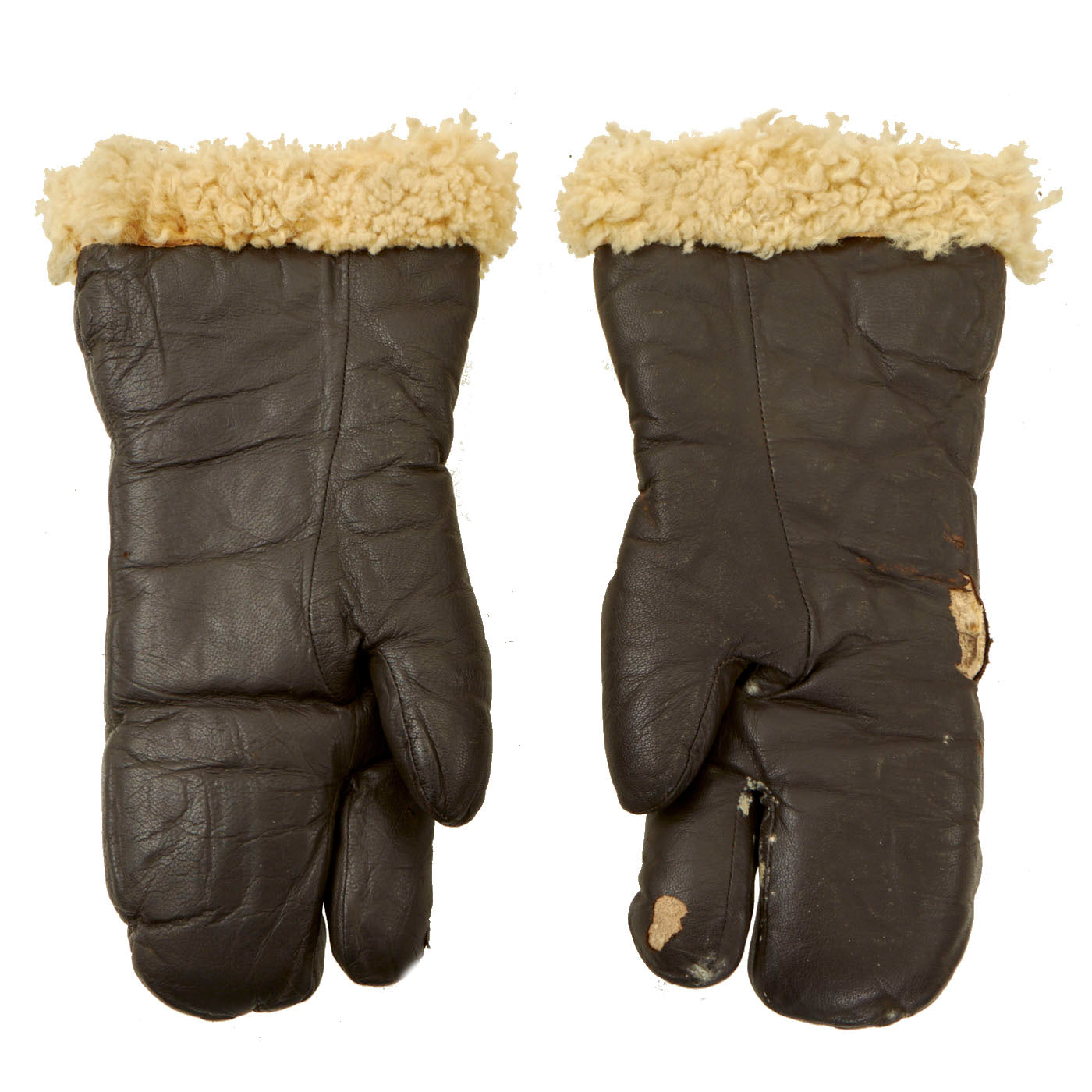 Original Item: Only One Set Available. Genuine Vintage WWII cold weather lambskin flight mittens with trigger finger. Condition of these gloves is very nice. The brown finished leather is supple with no stains but does have minor cracks on the side and trigger finger. Size is listed on medium on the tag of each glove.