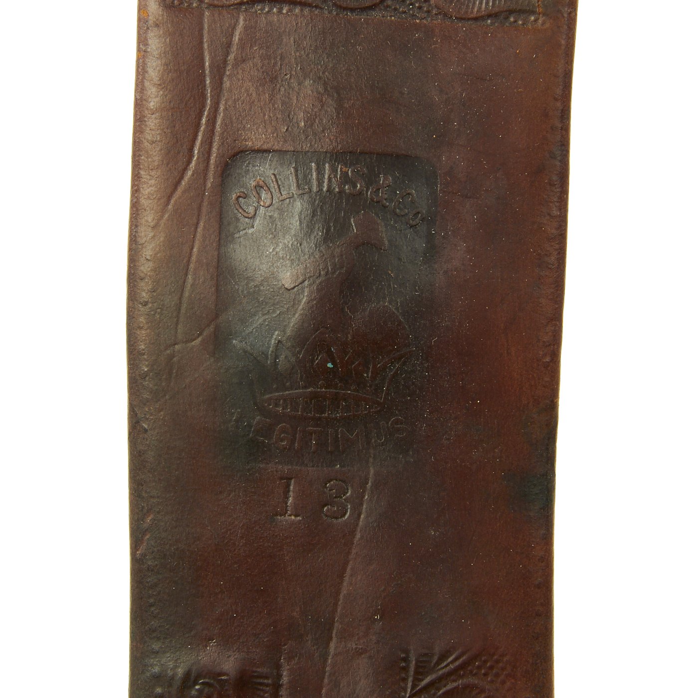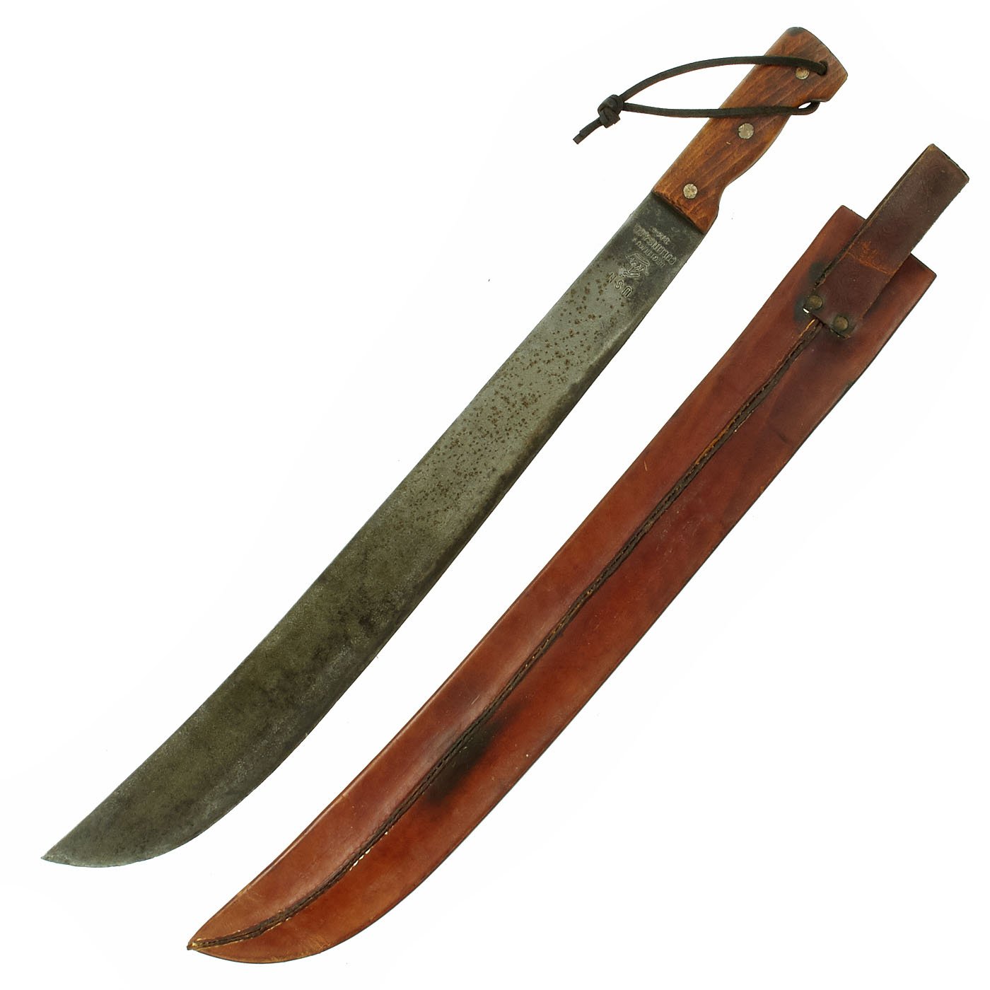 Original Items: Only one available. These long machetes are extremely rare on today's market, especially in such good condition, with their original tooled leather scabbard. Made by Collins & Co. of Hartford, Conn, this is a LEGITIMUS model long jungle machete. The Machete has an impressive overall length of 25 inches, with a slightly curved 20 inch Bush/Collins machete shape blade. The blade is about 2 1/4 inches wide at the thickest point. The ricasso is nicely marked: