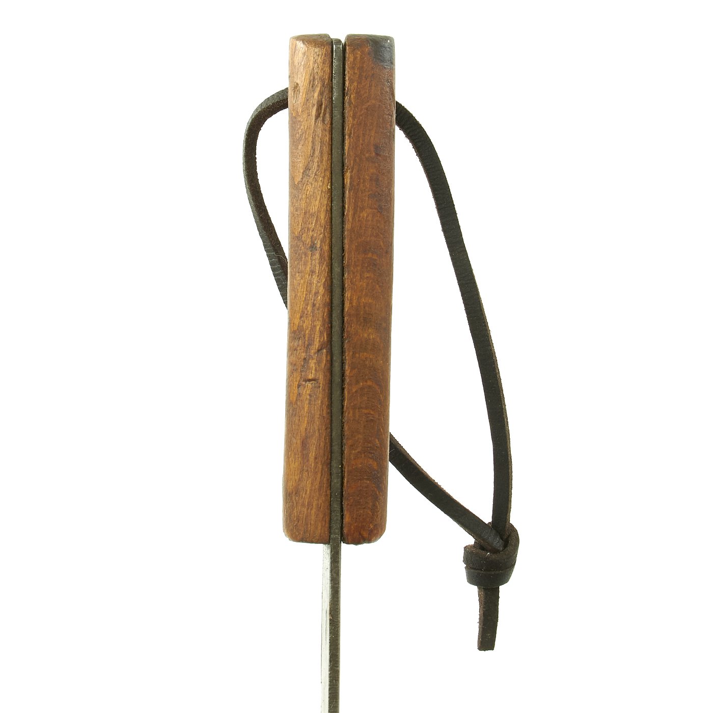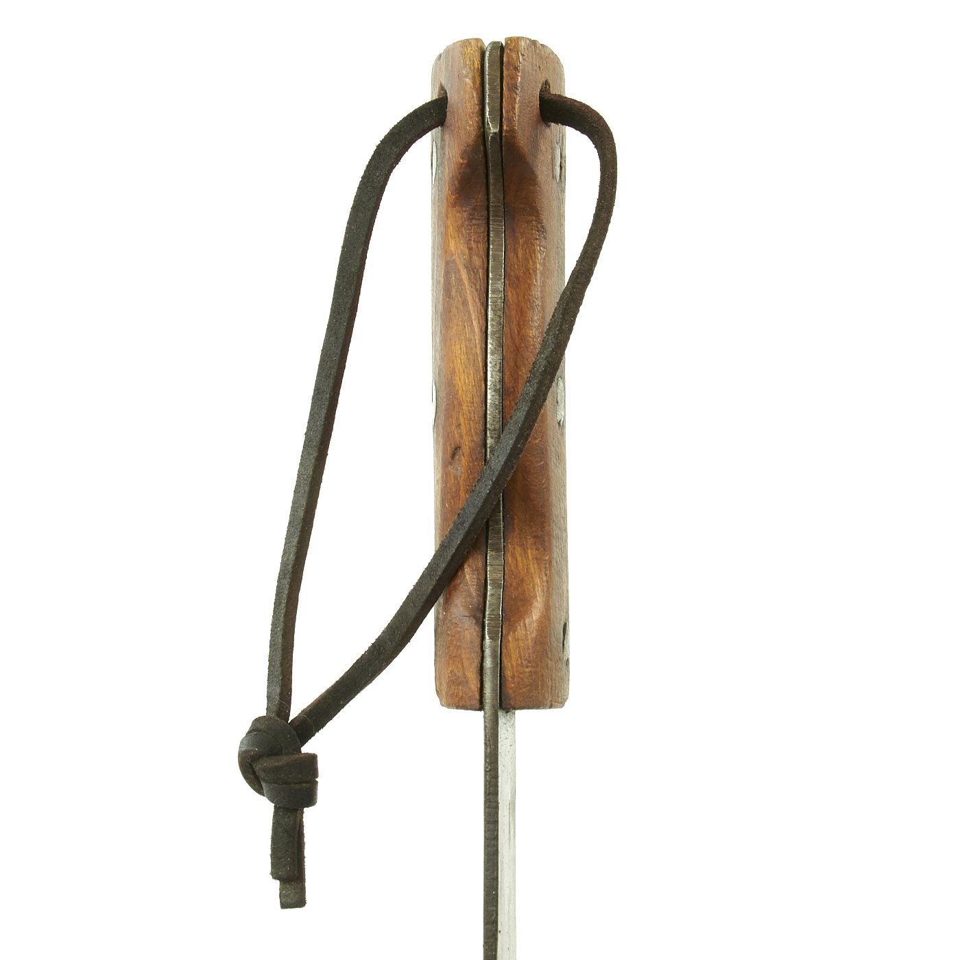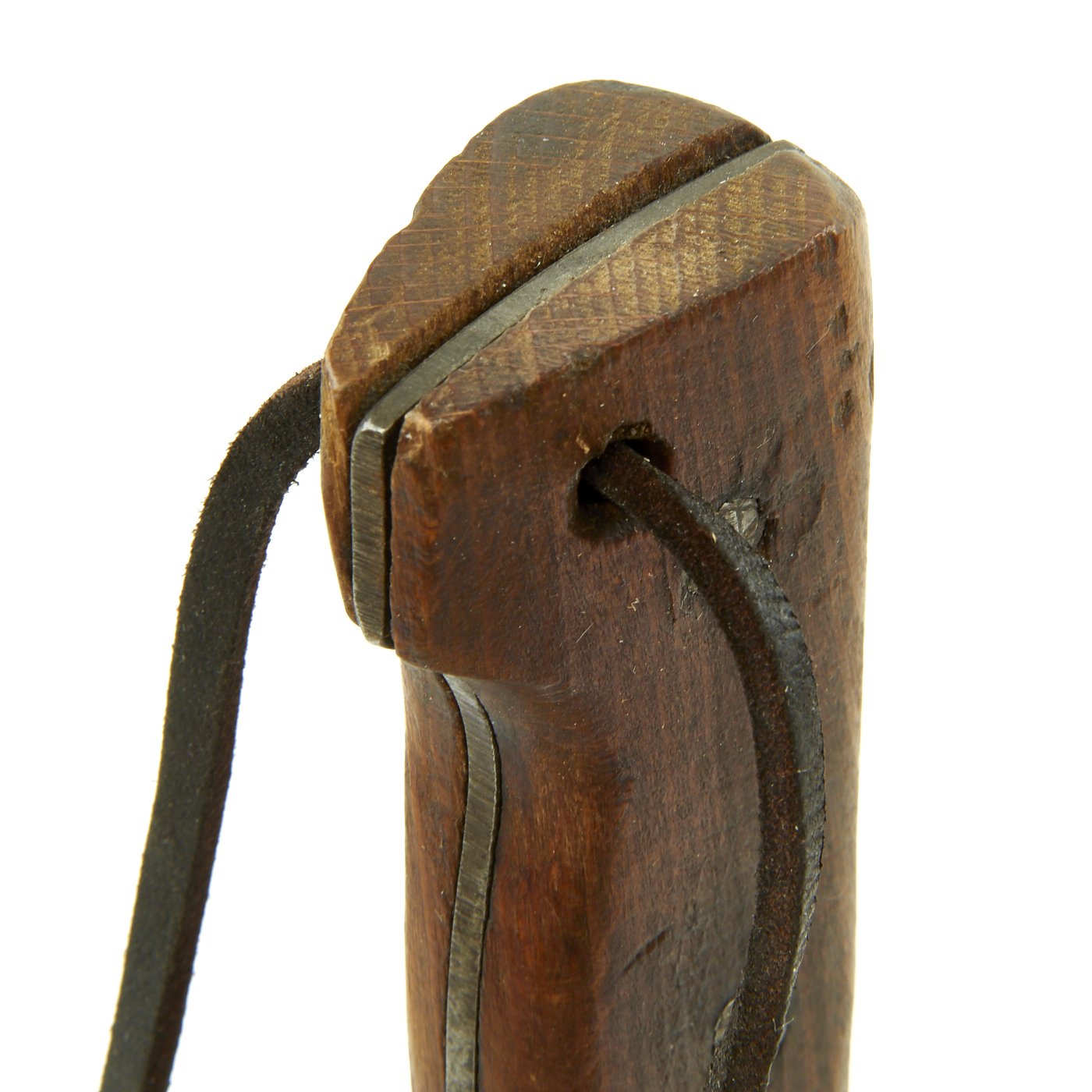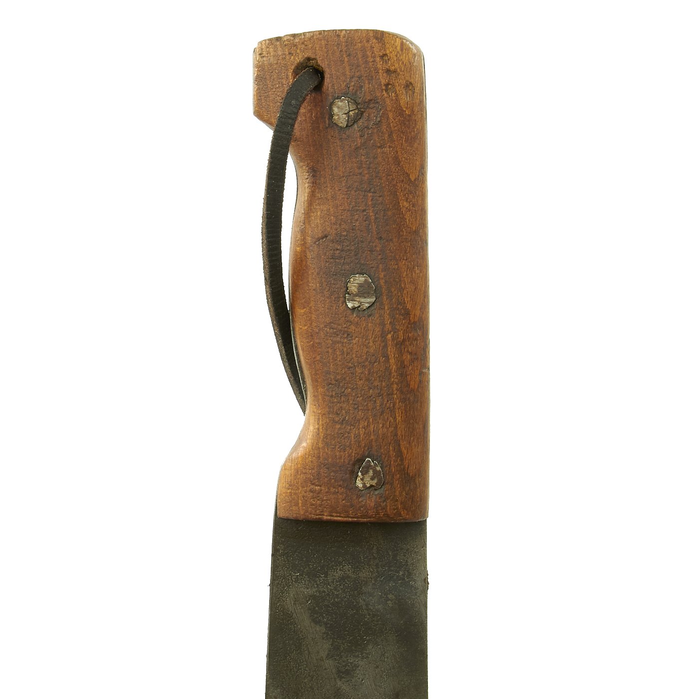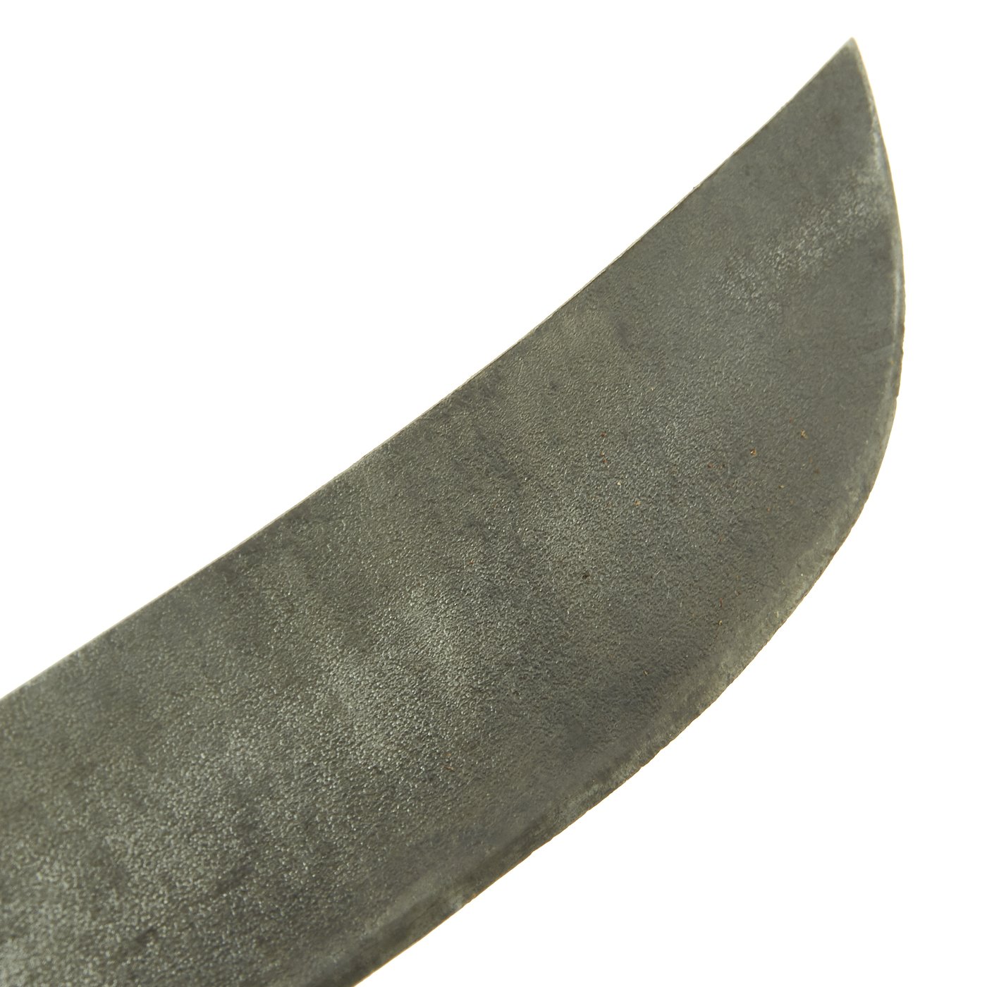 The blade is in very good condition, thought it does show some use and staining. It has been sharpened several times, so this was a machete that did not spent its life in the scabbard. The blade body is textured from the factory, which helped prevent plant material from becoming stuck to to the blade. The wooden handle is in very good shape, with no chips, cracks, or other major issues. It has a lovely color and grain, and still has the original leather wrist strap.