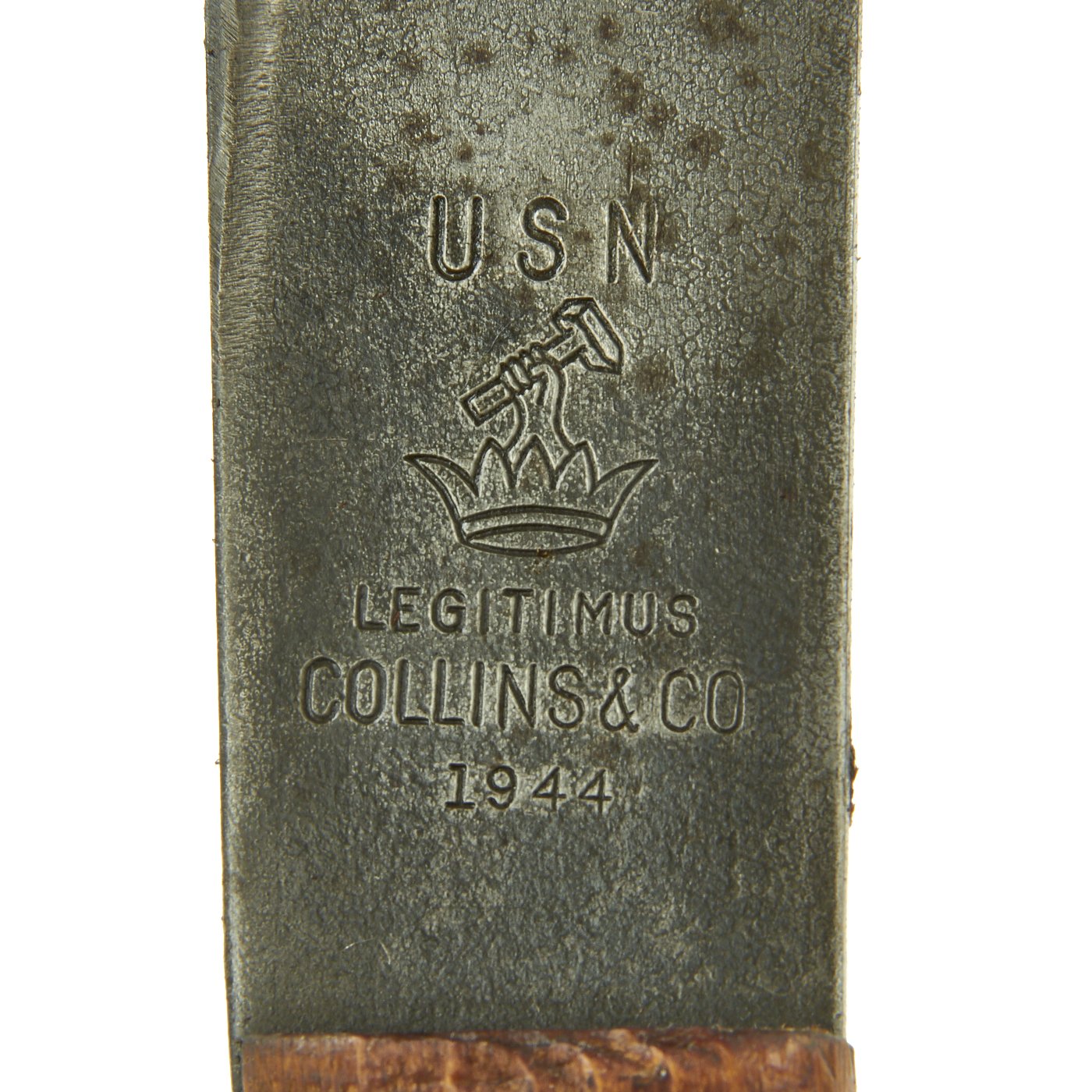 An very nice WWII dated U.S. Navy Collins Legitimus machete, complete with its original tooled leather scabbard, ready to display!