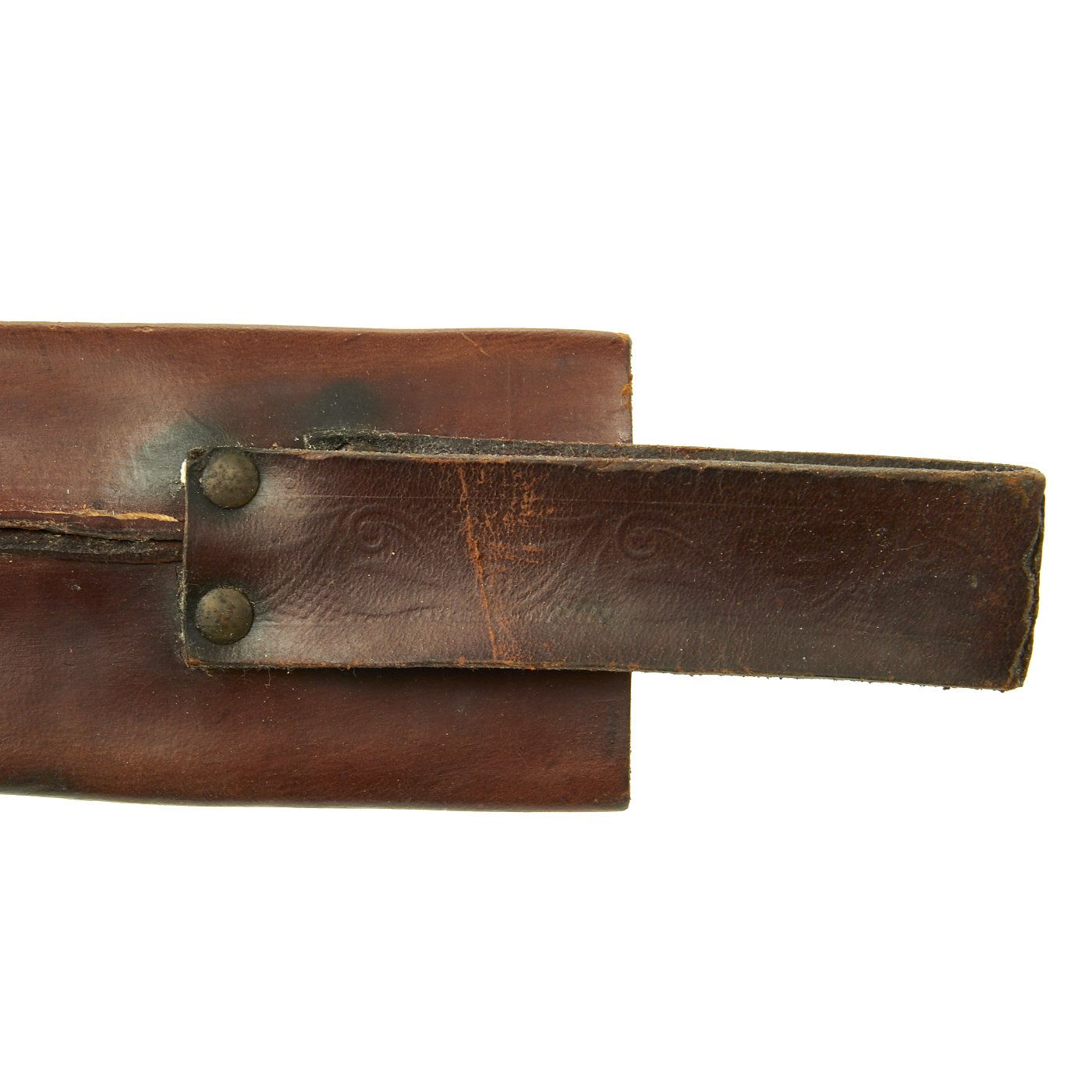 The machete comes with a very good COLLINS & CO LEGITIMUS No. 13 tooled leather scabbard. It has aged to a very attractive red brown color, with the embossed designs on the front still clear. The are a few stains, but the stamped Collins logo is still visible. The leather is a bit stiff, but after 70+ years, that is to be expected.