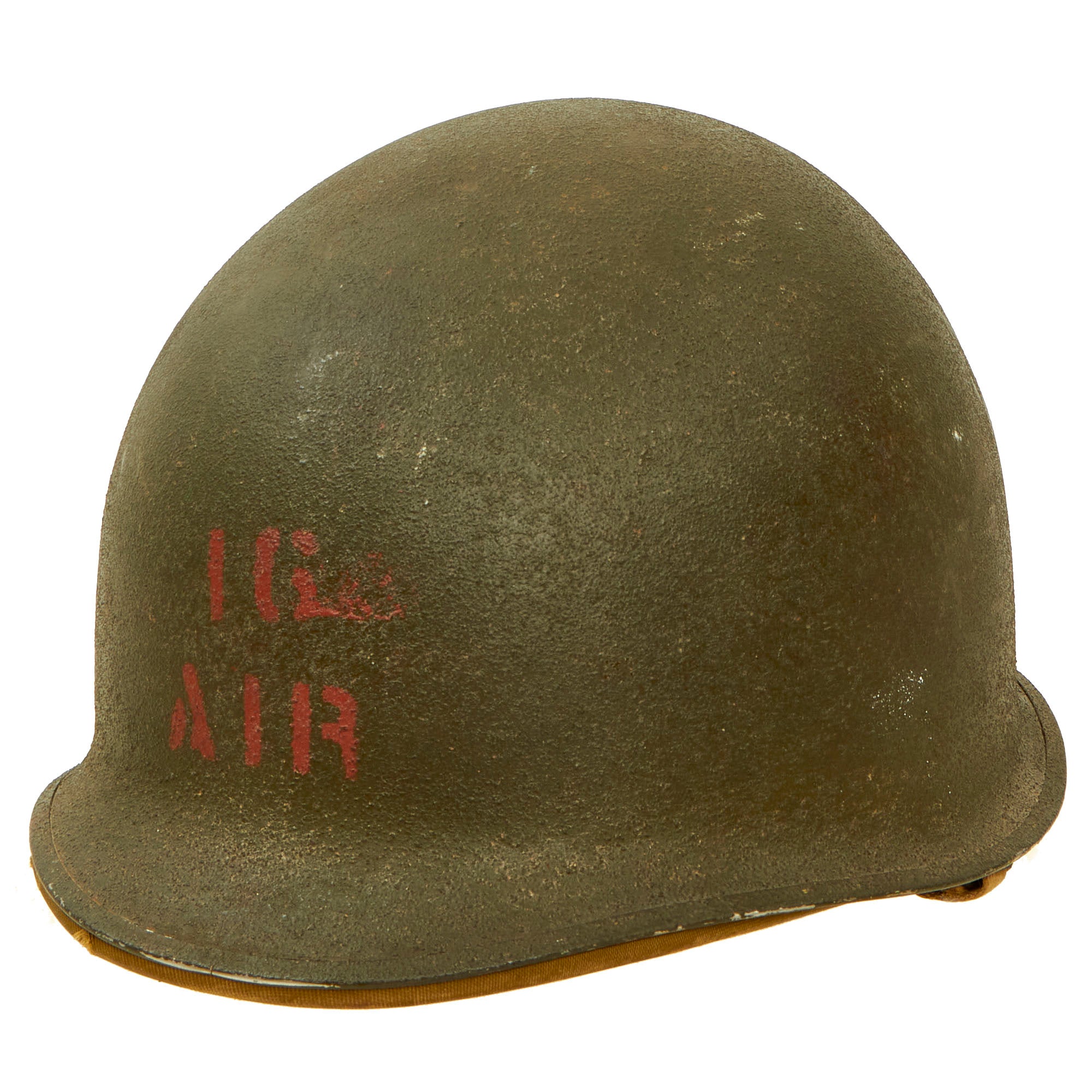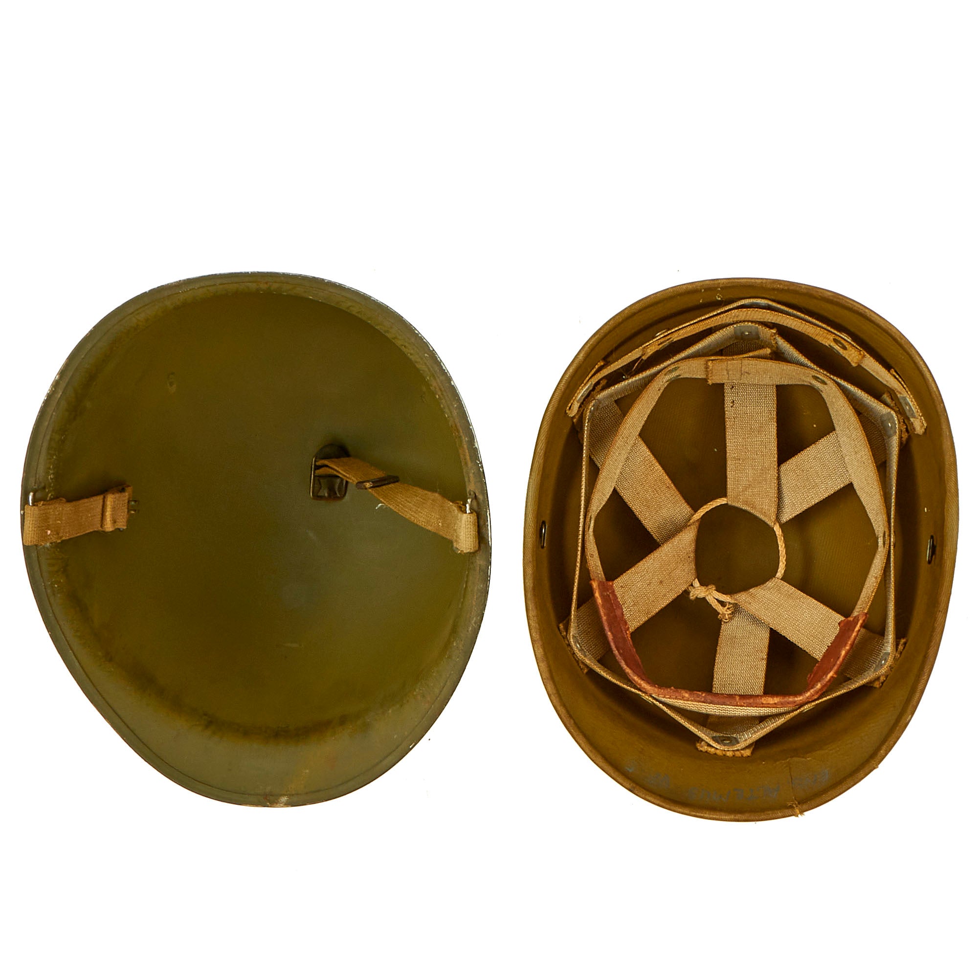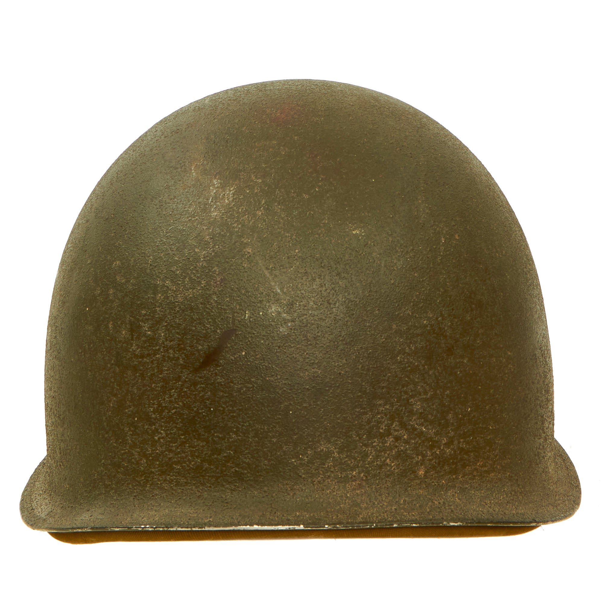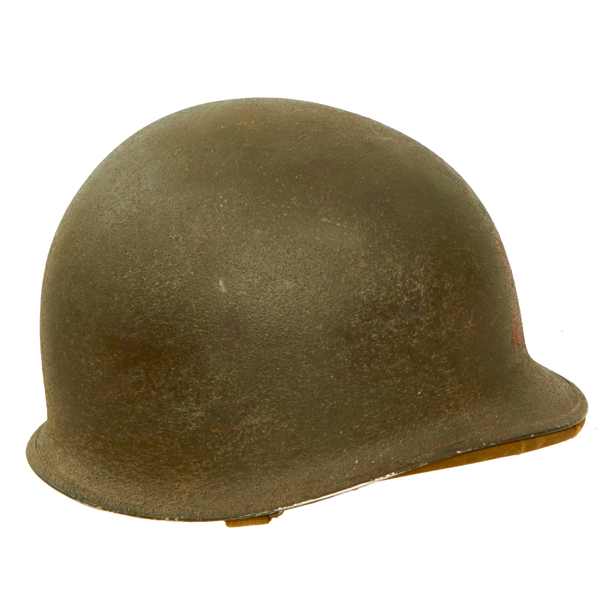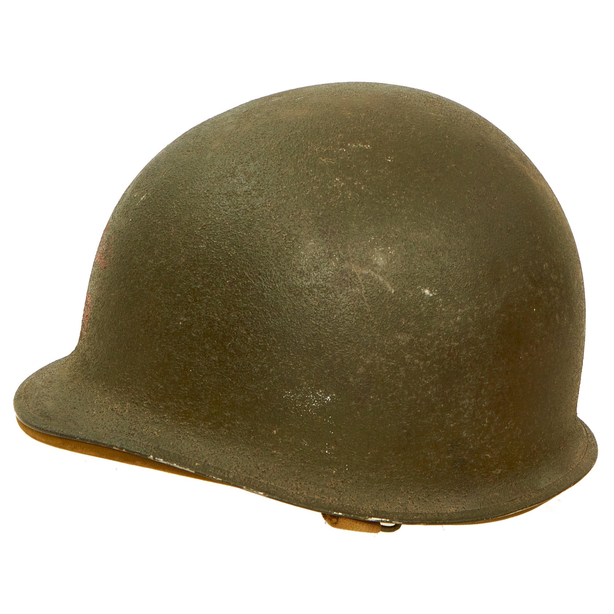 The U.S. WWII M-1 helmet was only produced from 1941 to 1945. The first production batch resulted with over 323,510 M-1 helmets before the start of the American involvement in the war. This helmet is heat-lot stamped 55B, a very low number which indicates the approximate manufacture date of February 1942, two months after the U.S. entered into WWII.