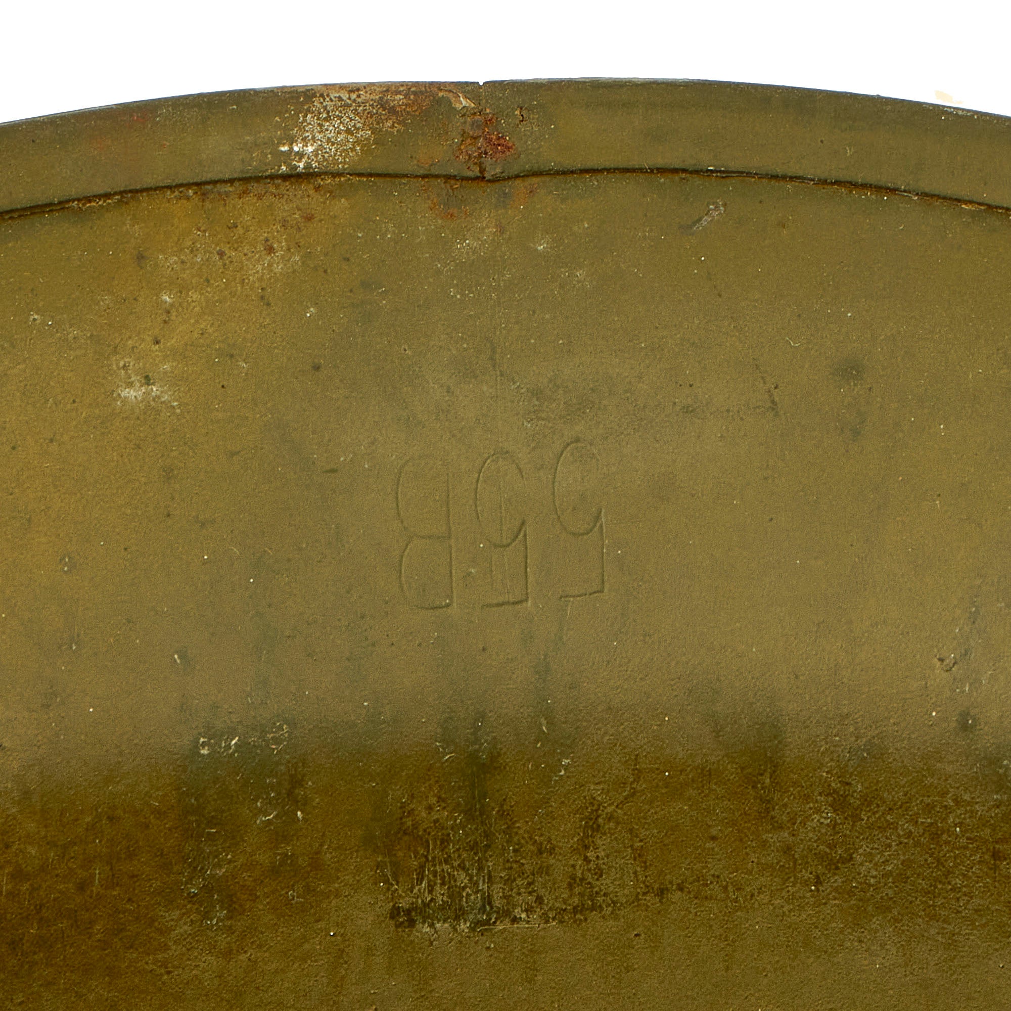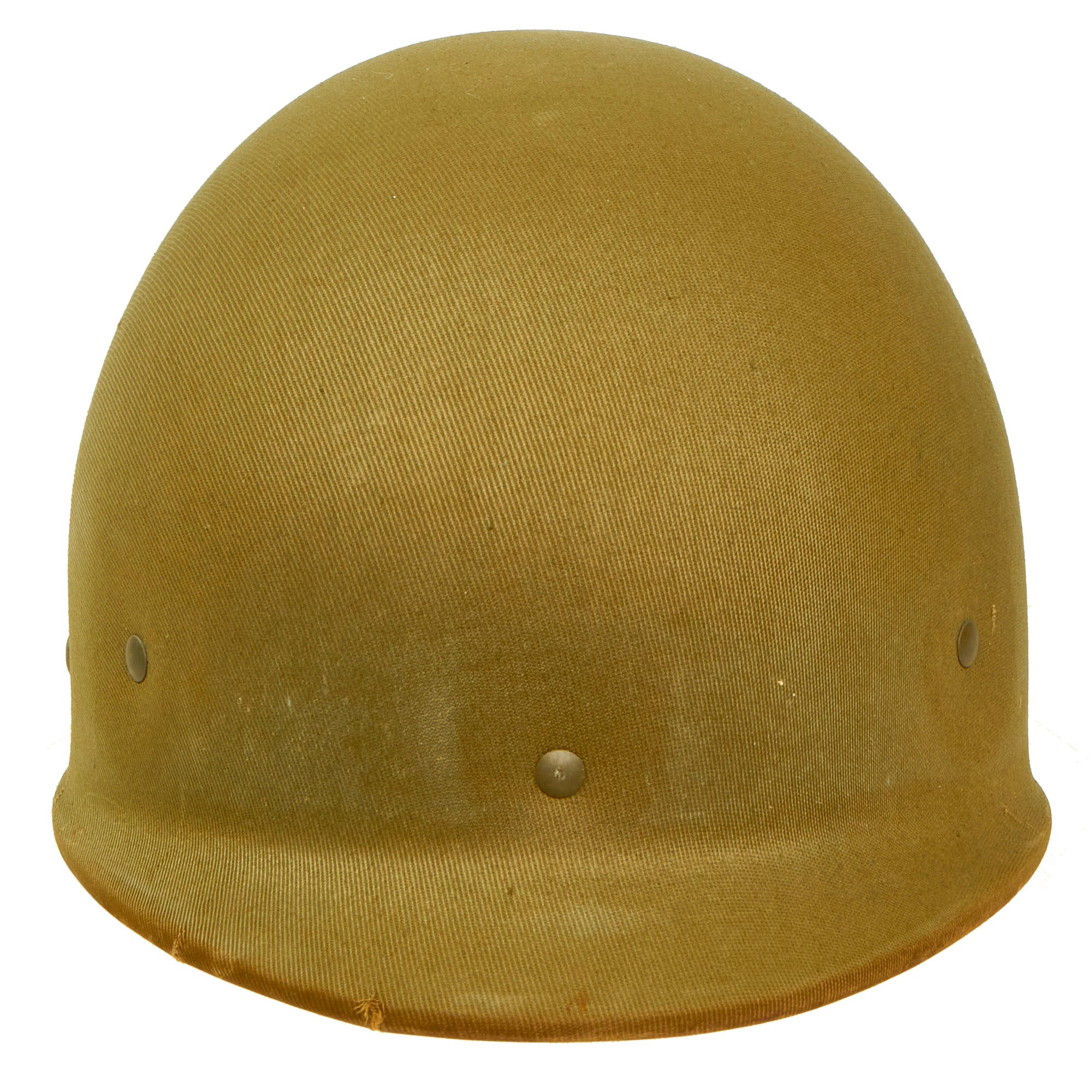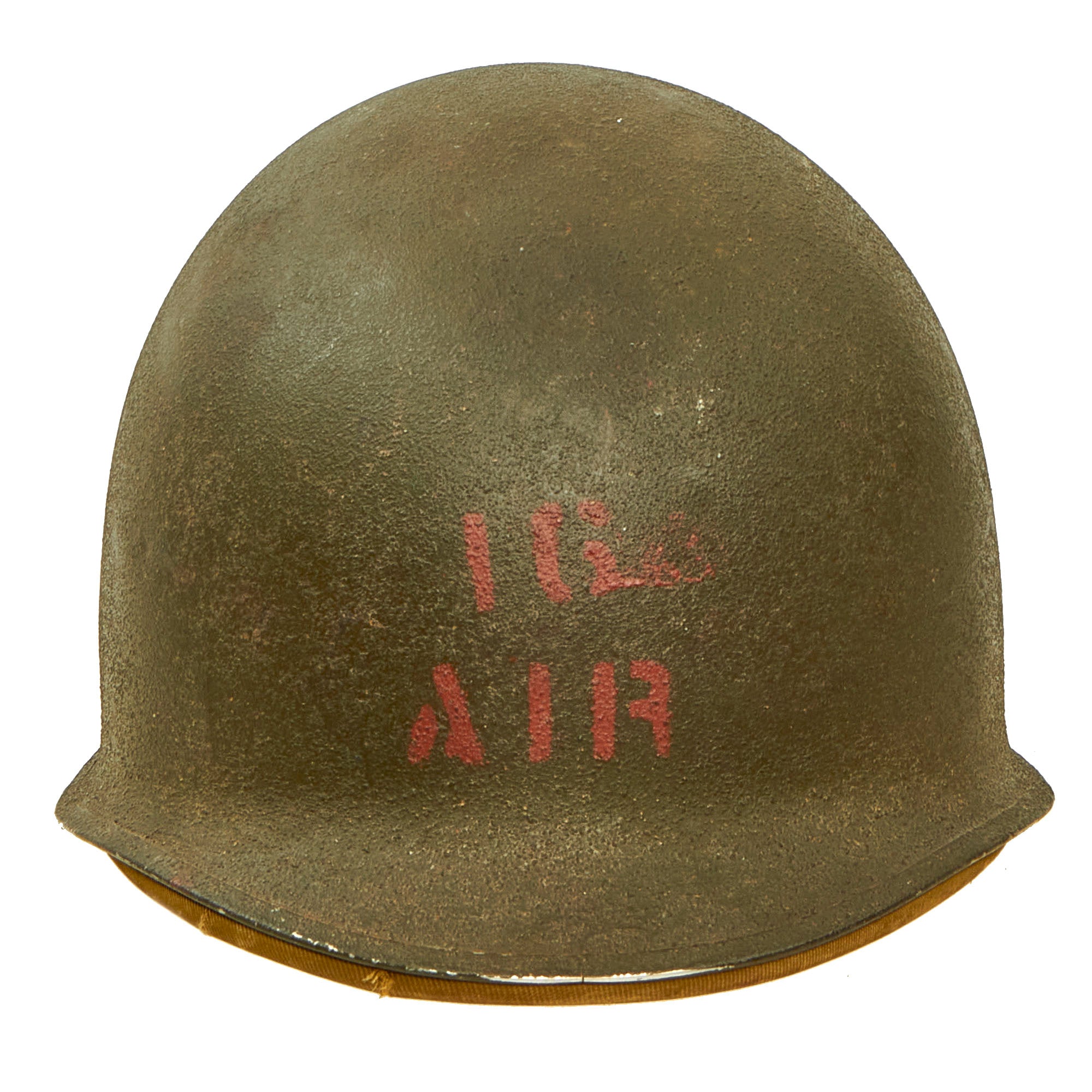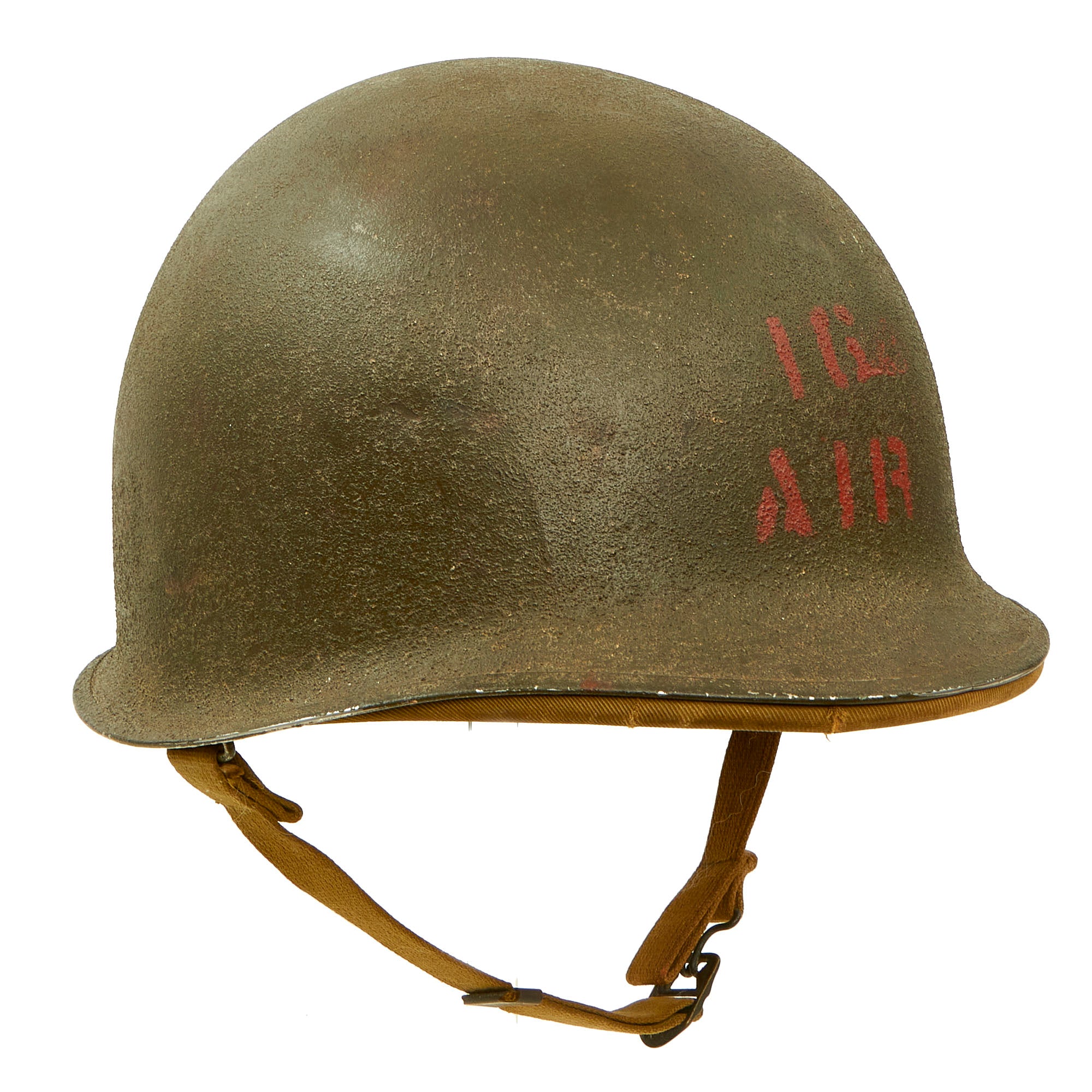 The U.S. WWII M-1 helmet was only produced from 1941 to 1945. The first production batch resulted with over 323,510 M-1 helmets before the start of the American involvement in the war. This helmet is heat-lot stamped 55B, a very low number which indicates the approximate manufacture date of February 1942, two months after the U.S. entered into WWII.