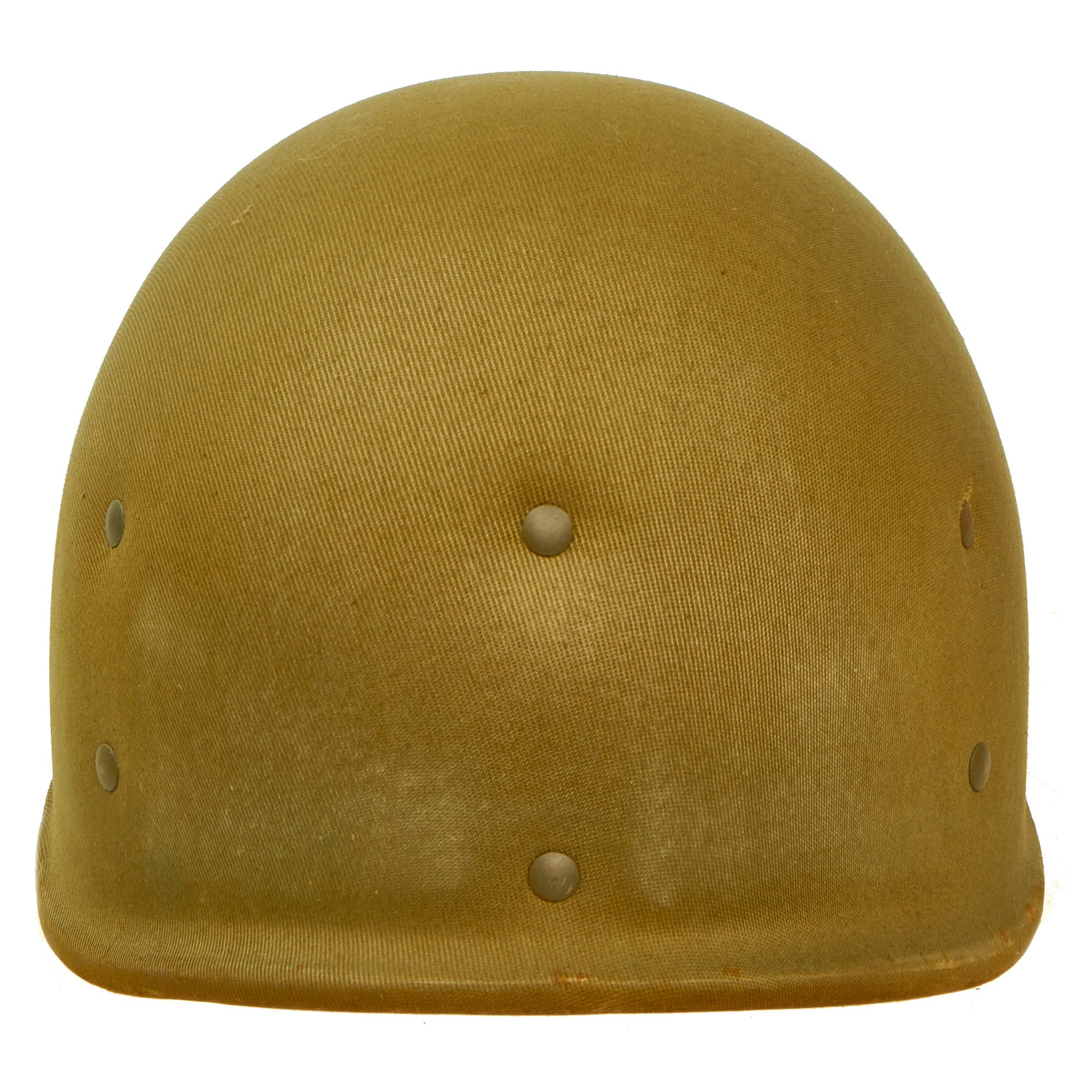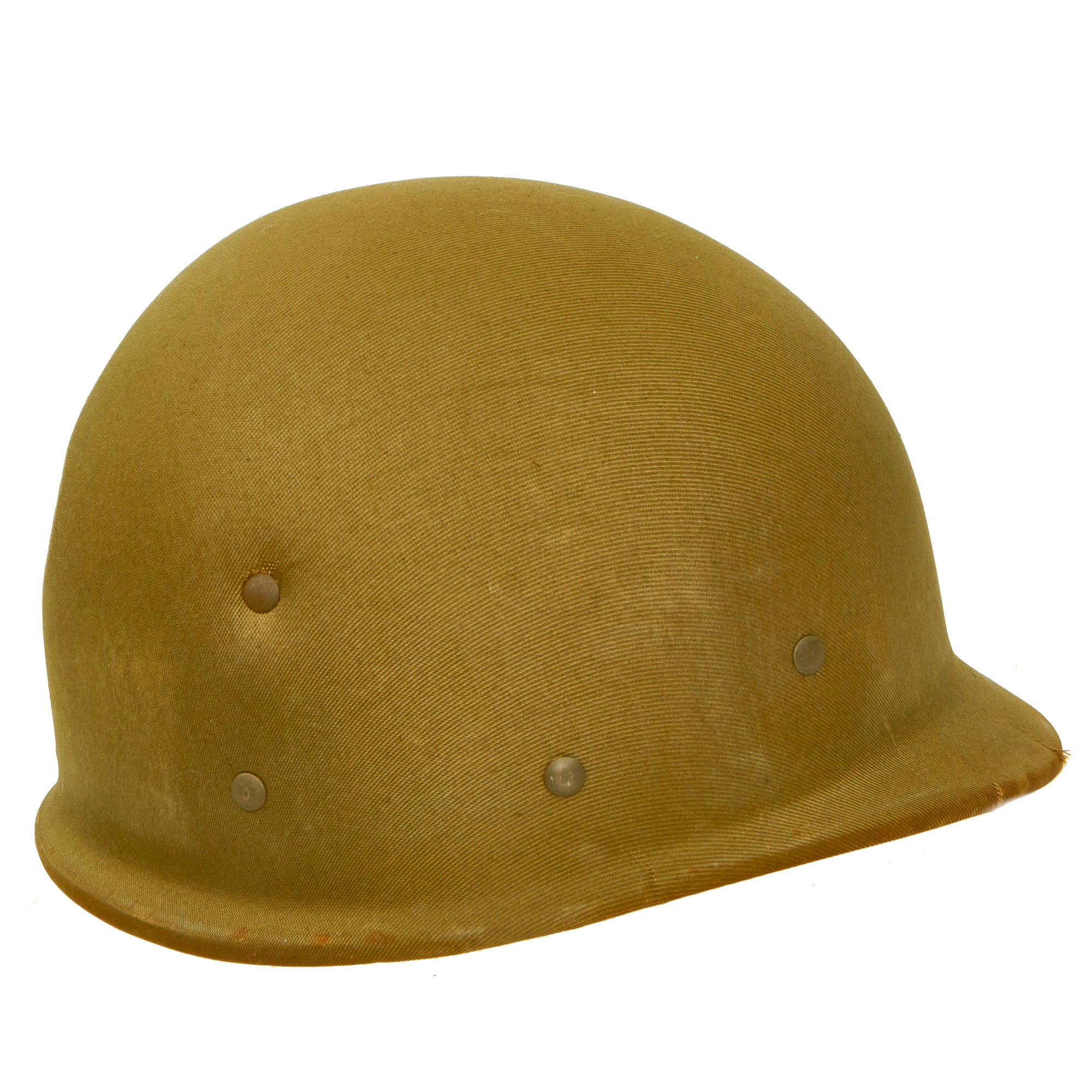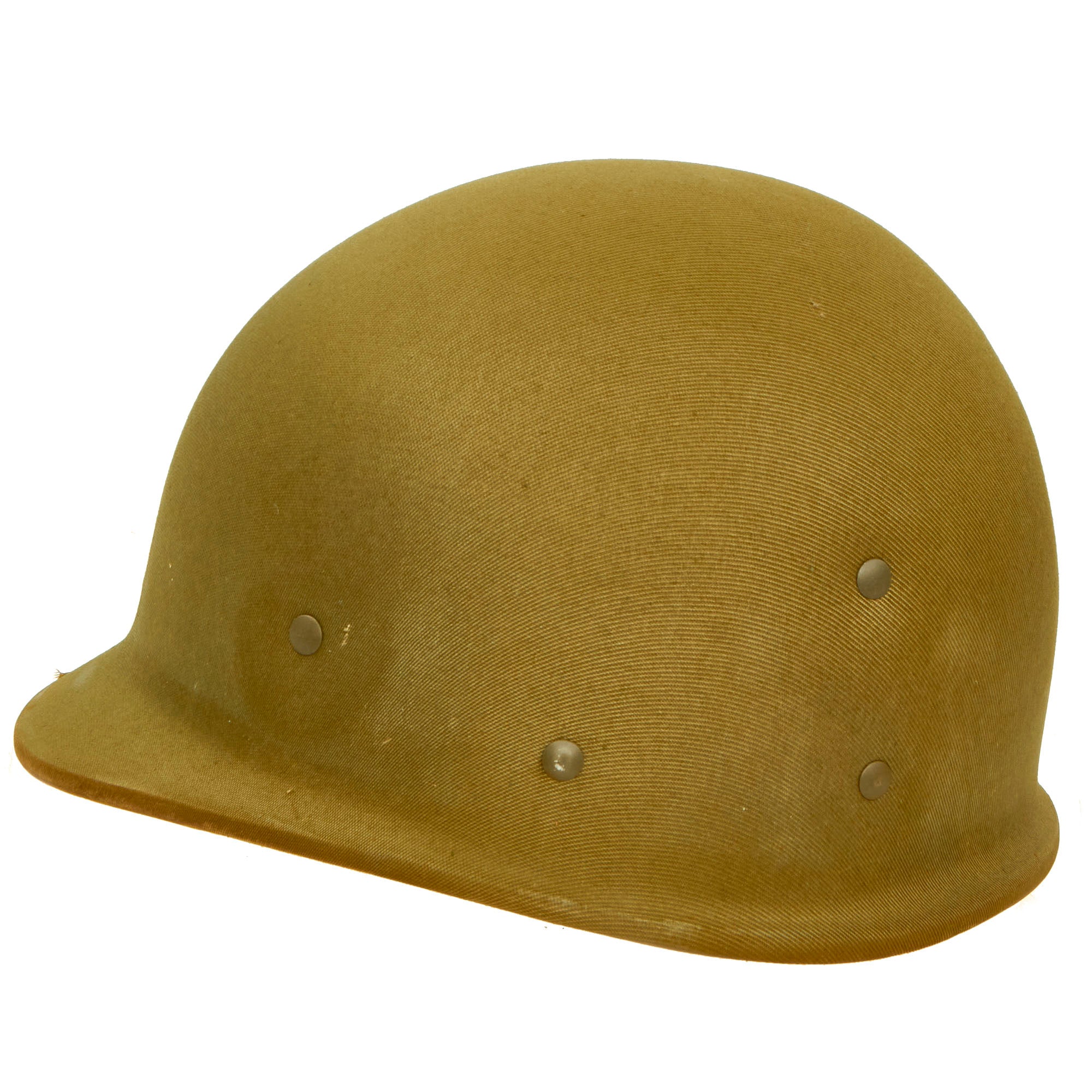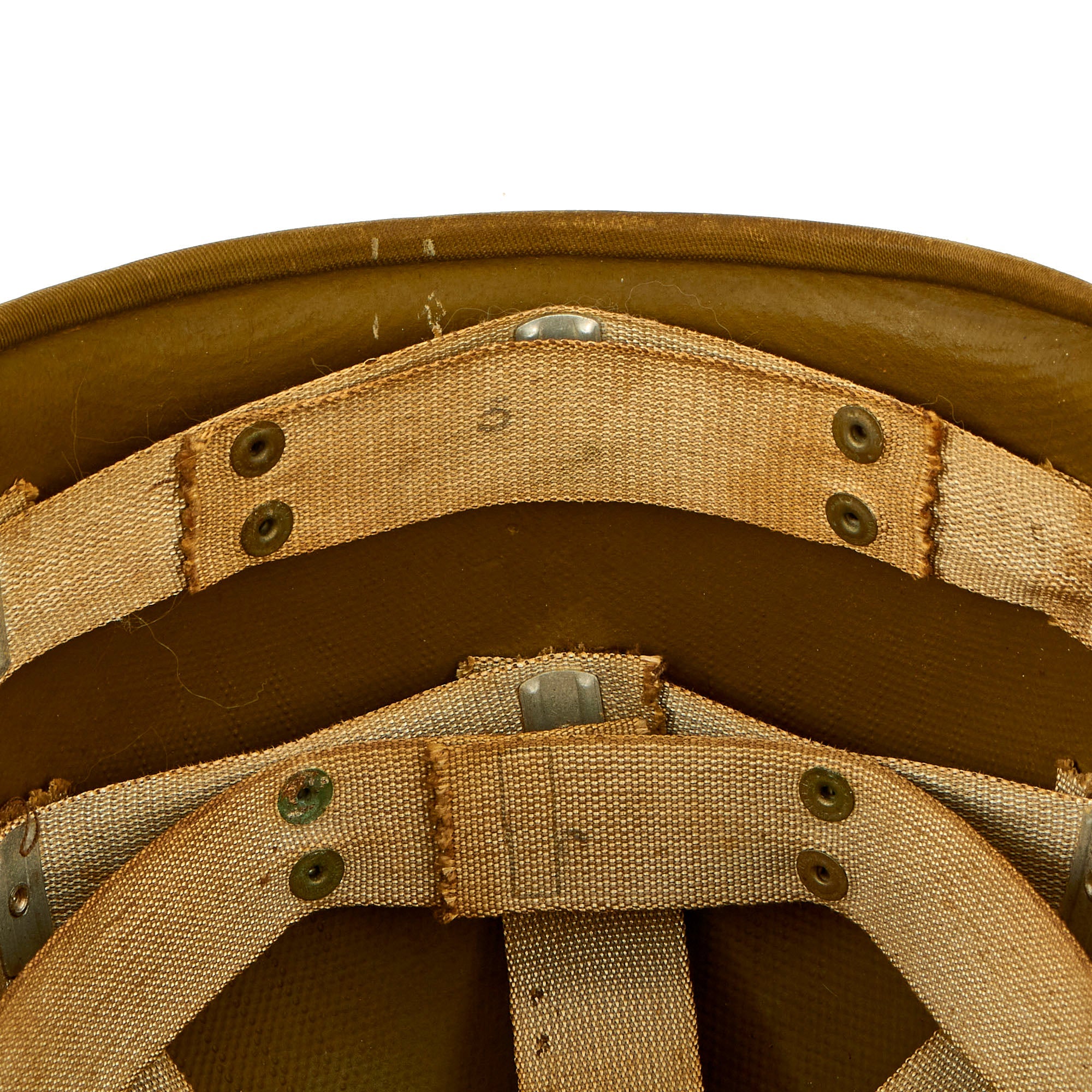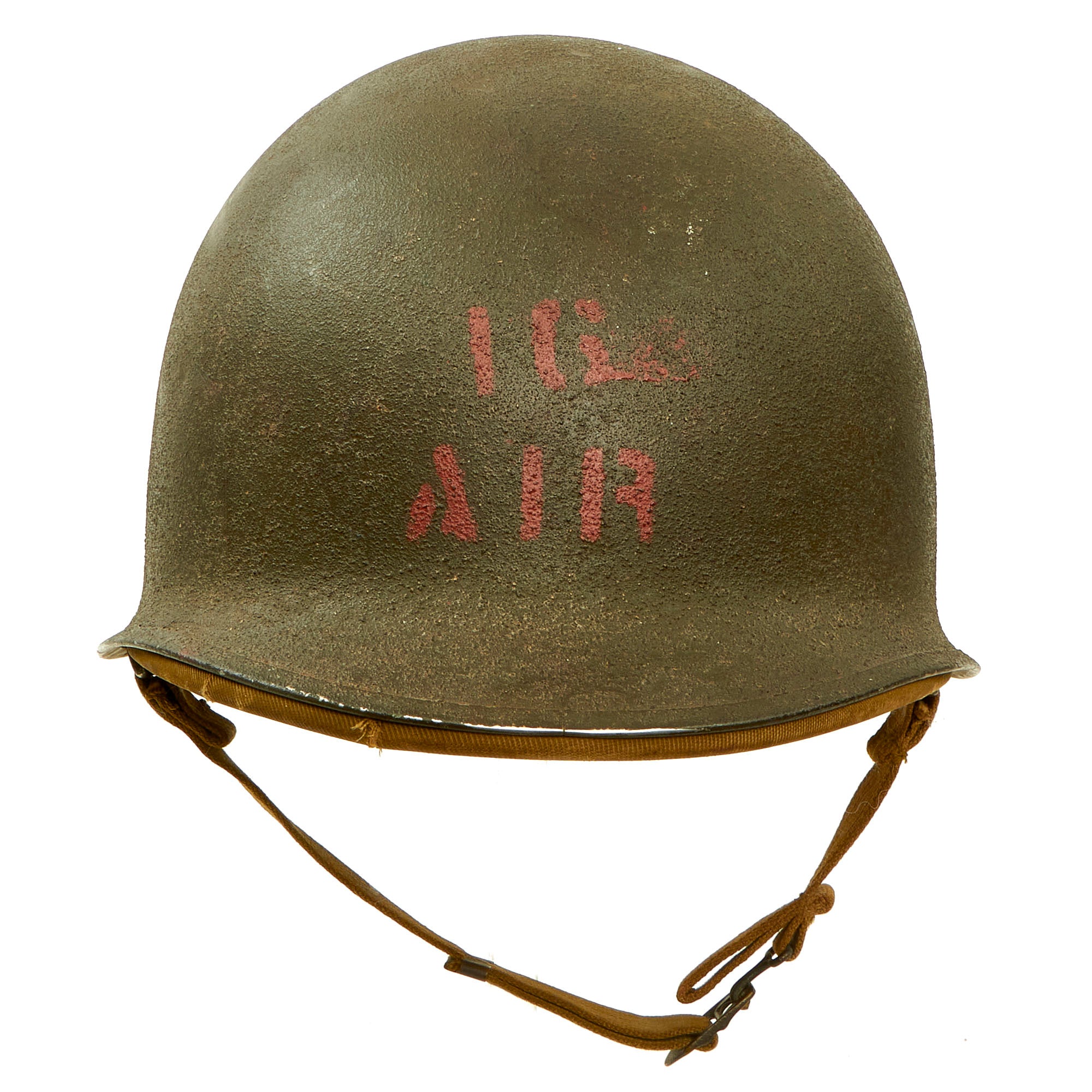 The U.S. WWII M-1 helmet was only produced from 1941 to 1945. The first production batch resulted with over 323,510 M-1 helmets before the start of the American involvement in the war. This helmet is heat-lot stamped 55B, a very low number which indicates the approximate manufacture date of February 1942, two months after the U.S. entered into WWII.