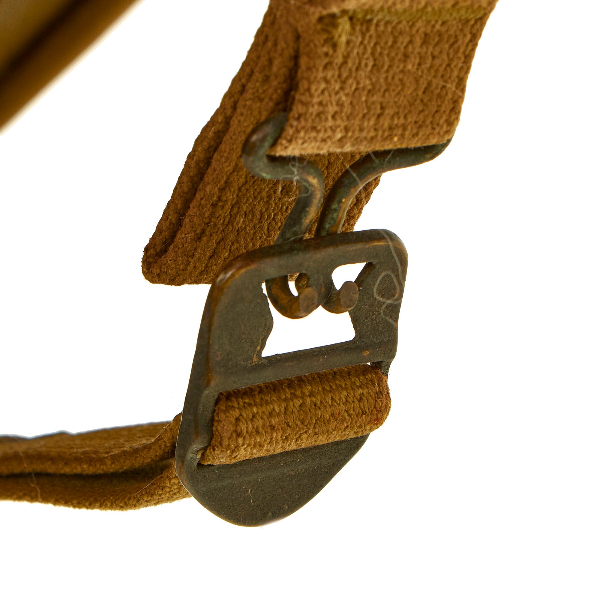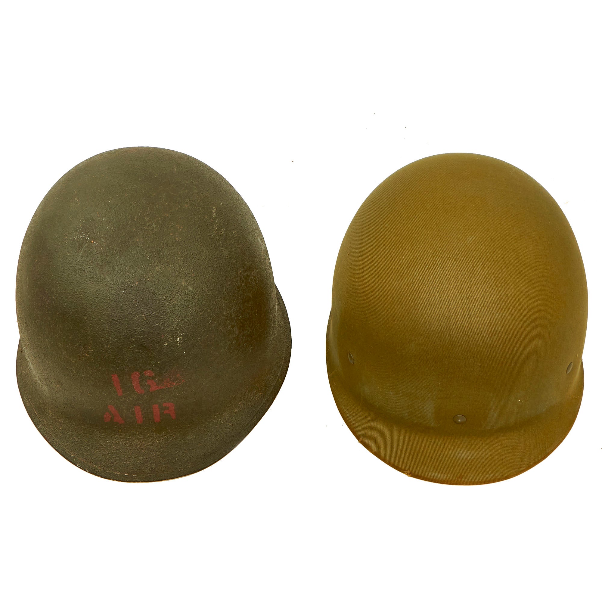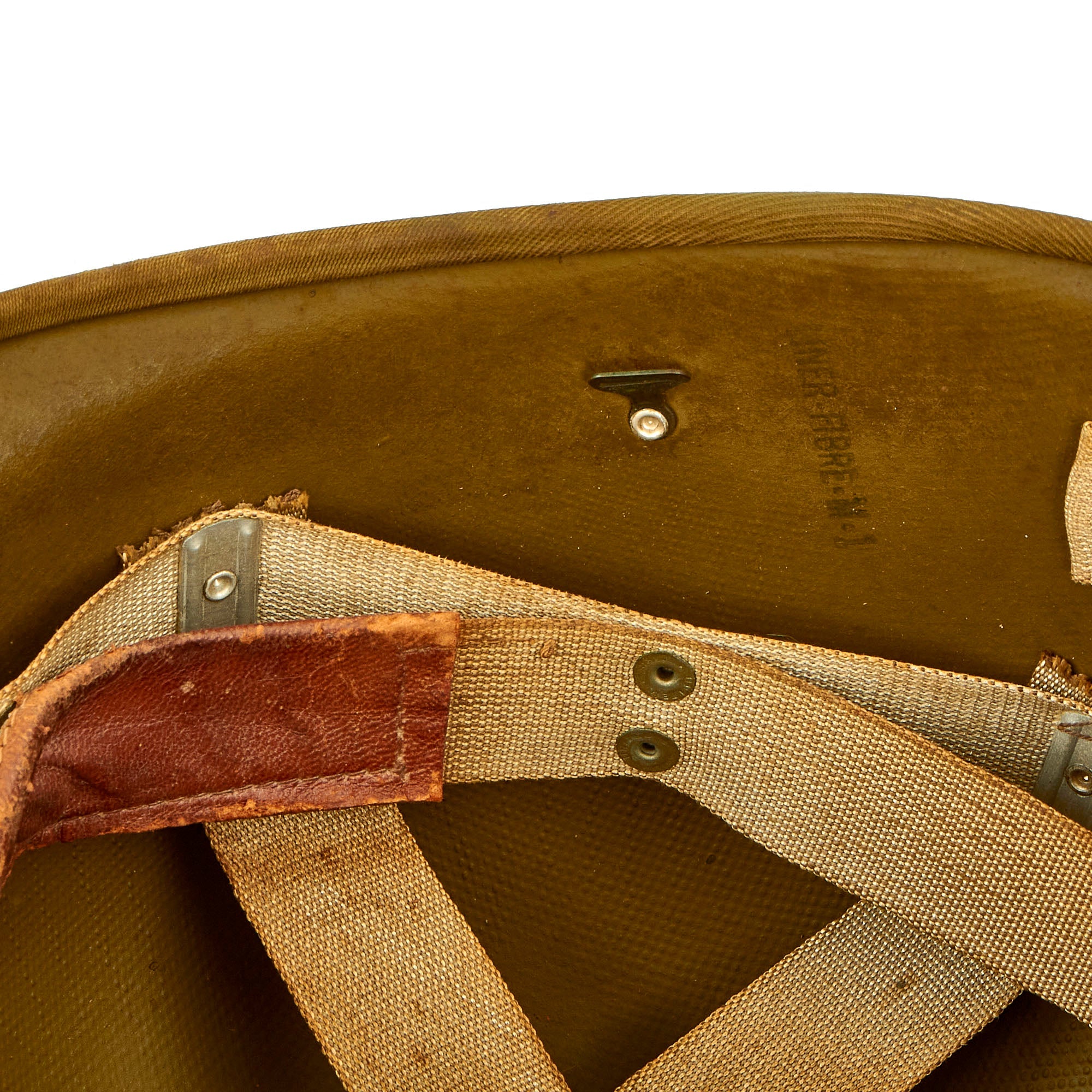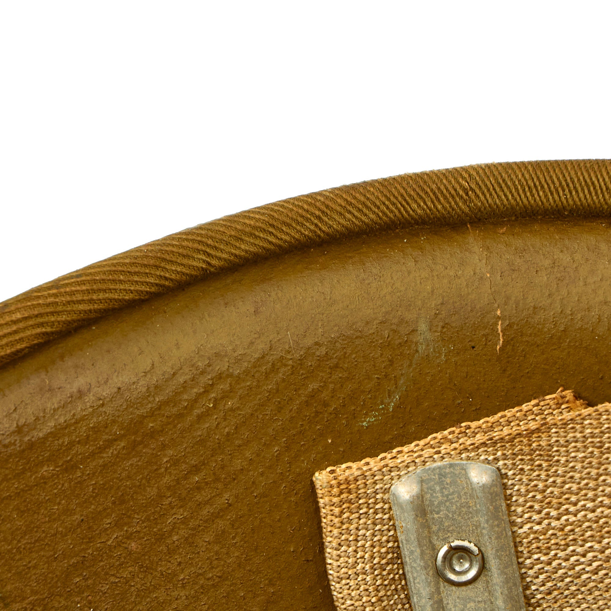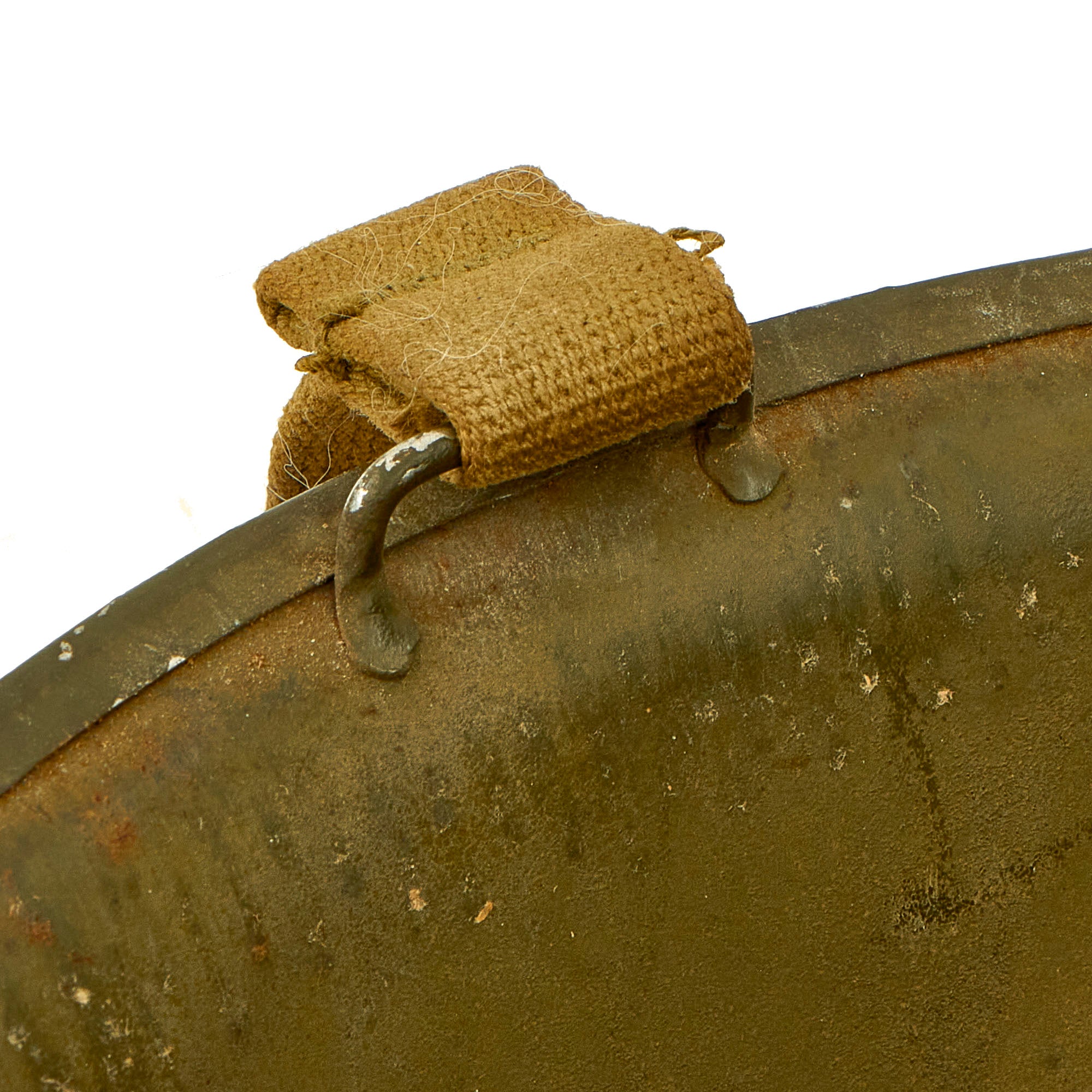 The U.S. WWII M-1 helmet was only produced from 1941 to 1945. The first production batch resulted with over 323,510 M-1 helmets before the start of the American involvement in the war. This helmet is heat-lot stamped 55B, a very low number which indicates the approximate manufacture date of February 1942, two months after the U.S. entered into WWII.