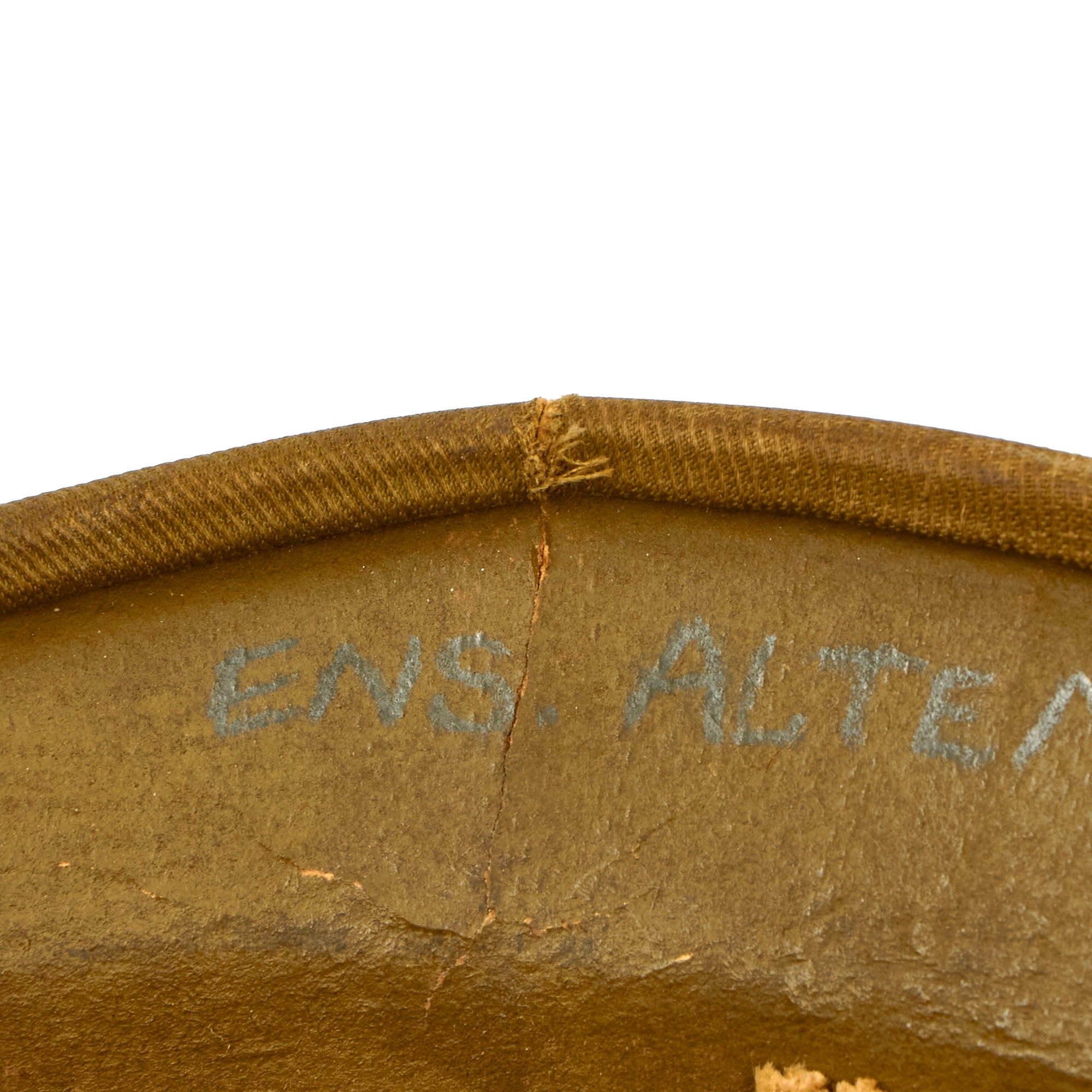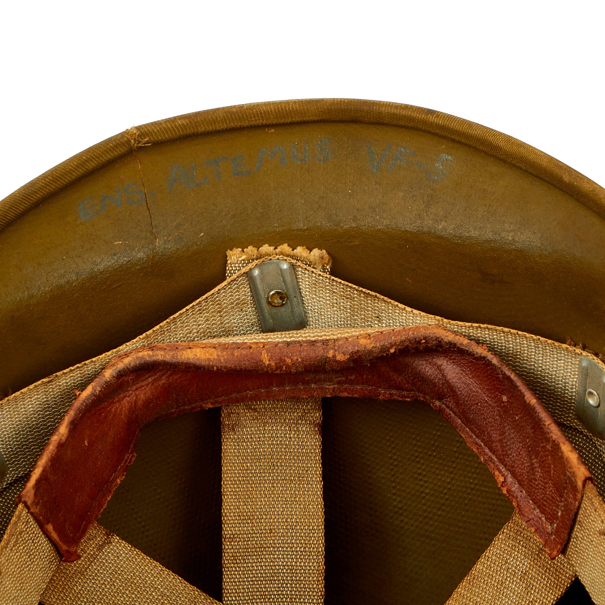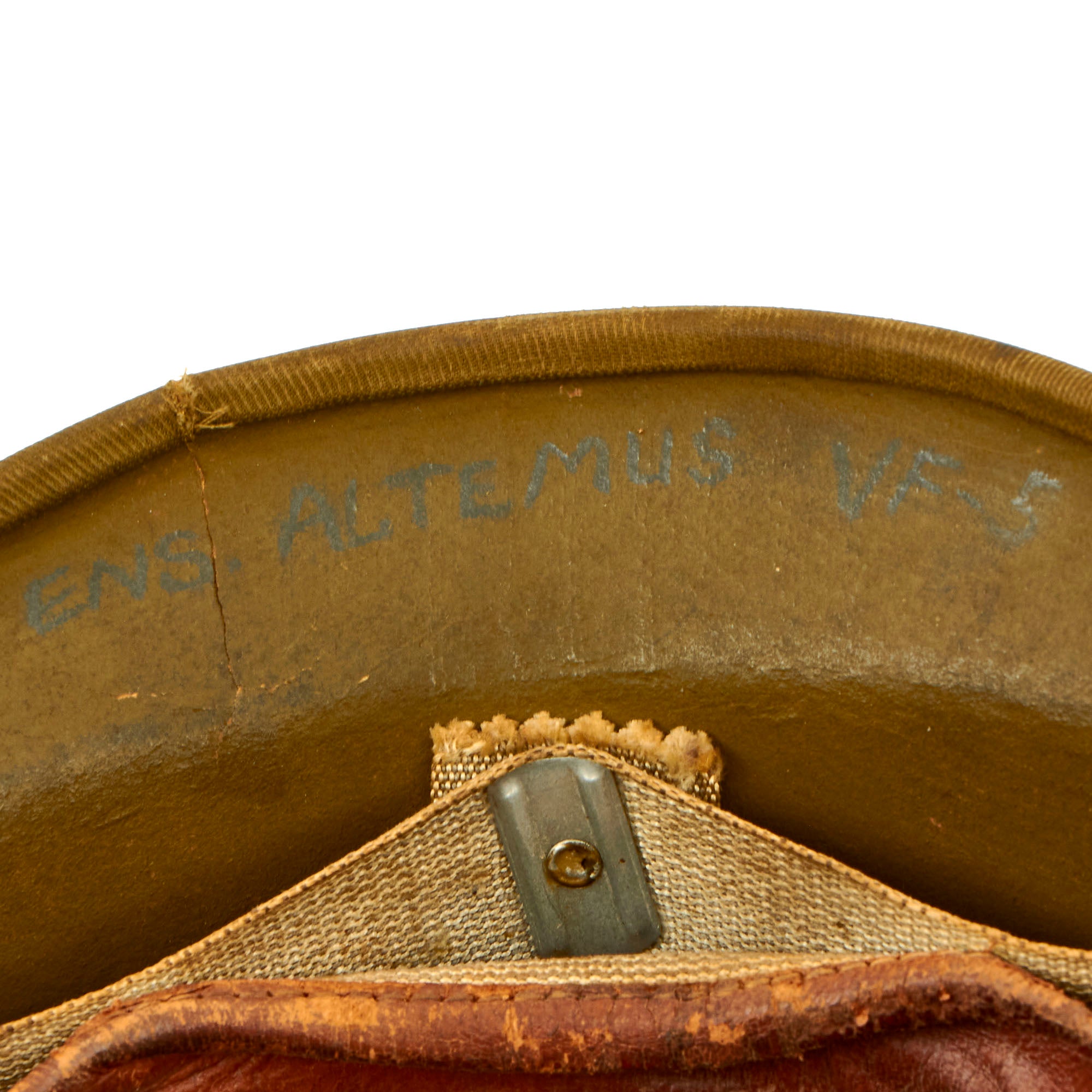 Original Item: Only One Available. Now this was an incredible discovery. The helmet itself is extremely nice and is named on the inside lip of the paper liner ENS. ALTEMUS VF-5. What happened next was really surprising, we were able to identify the pilot! Ensign John P. Altemus was a pilot with the VF-5 Screaming Eagles during the Pacific Campaign of WWII. He is mentioned in the book “The First Team and the Guadalcanal Campaign, Naval Fighter Combat from August to November 1942” on page 233. The excerpt states that; “Several VF-3 pilots, such as 26-year-olds Lieutenant Junior Grade John P. “Johnny” Altemus and Francis R. “Cash” Register, were combat veterans fresh from the bloody air war over Guadalcanal. Both men had six confirmed aerial kills.”