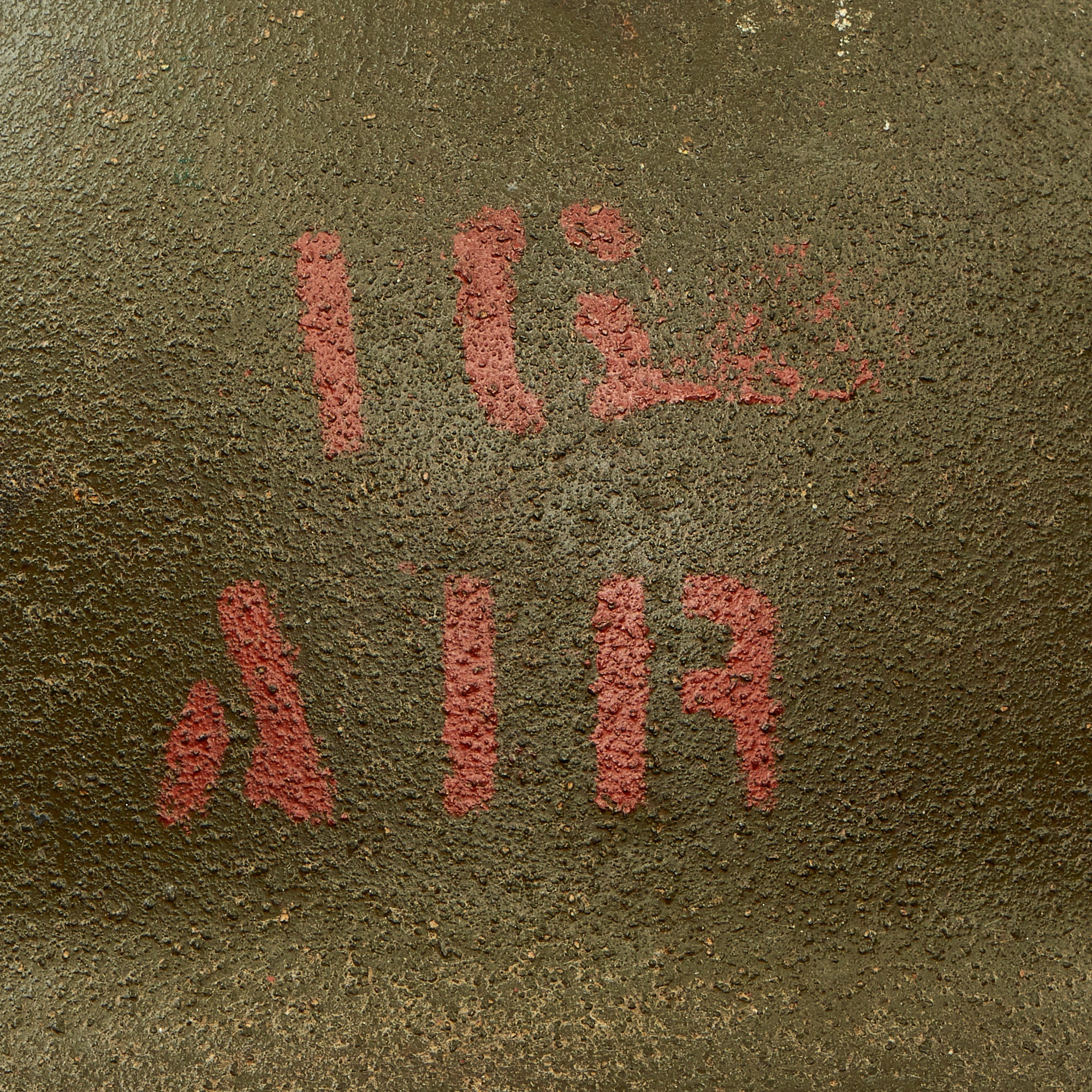 Condition of the shell is quite nice, with only a few scratches, and the paint retained very well. There is also still a lot of paint on the Stainless Steel rim, which was prone to wear. The shell does have a few stress cracks, common due to the "high dome" design of the M1. The front of the helmet has a faint marking that reads as 16? / AIR. The marking above “AIR” appears to be incomplete, making it difficult to discern.