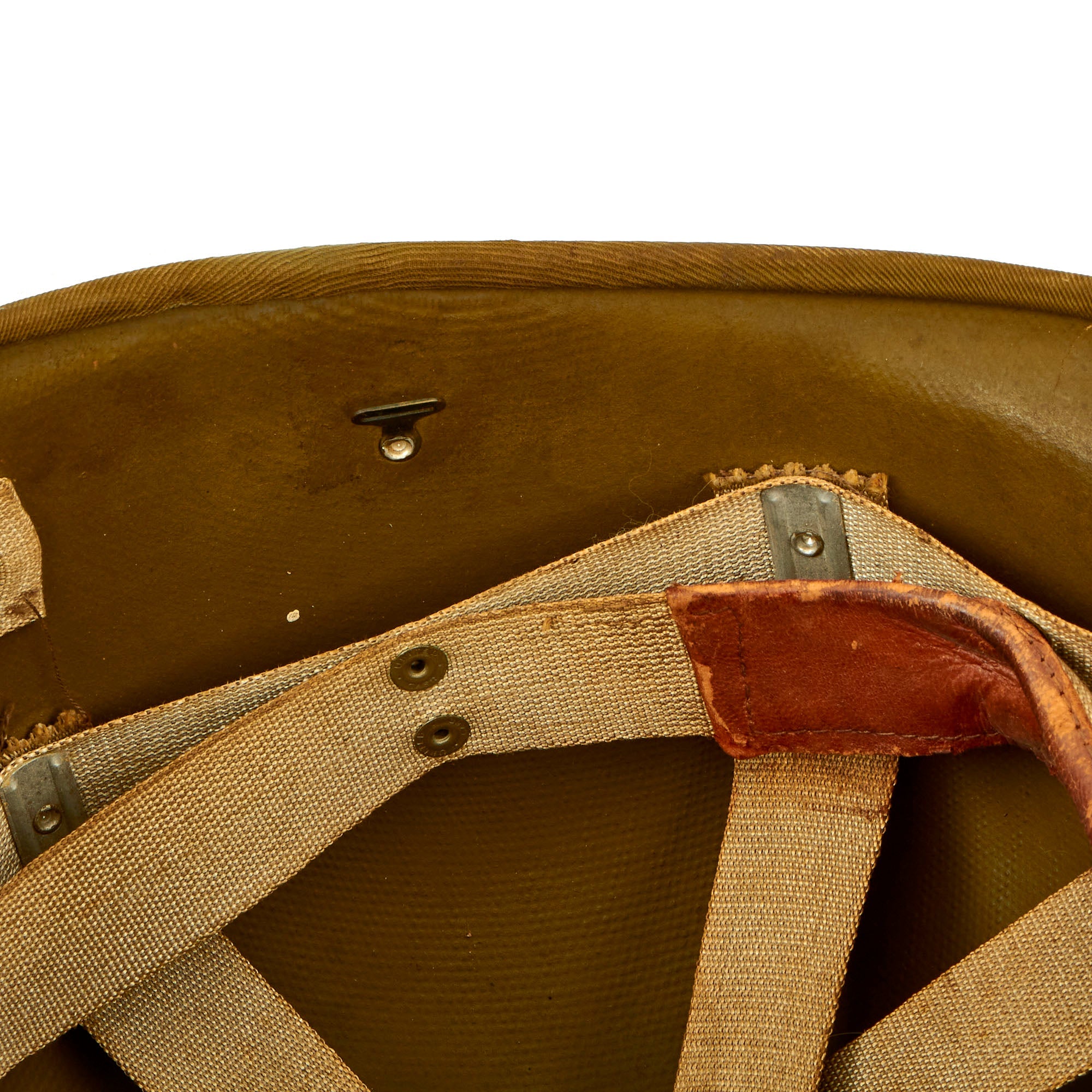 This helmet is a fine example and still retains all of its original WW2 parts and the shell has all original "corked" grain paint with front seam and fixed bails. The chin strap is the correct OD Green #3 with blacked brass hardware.