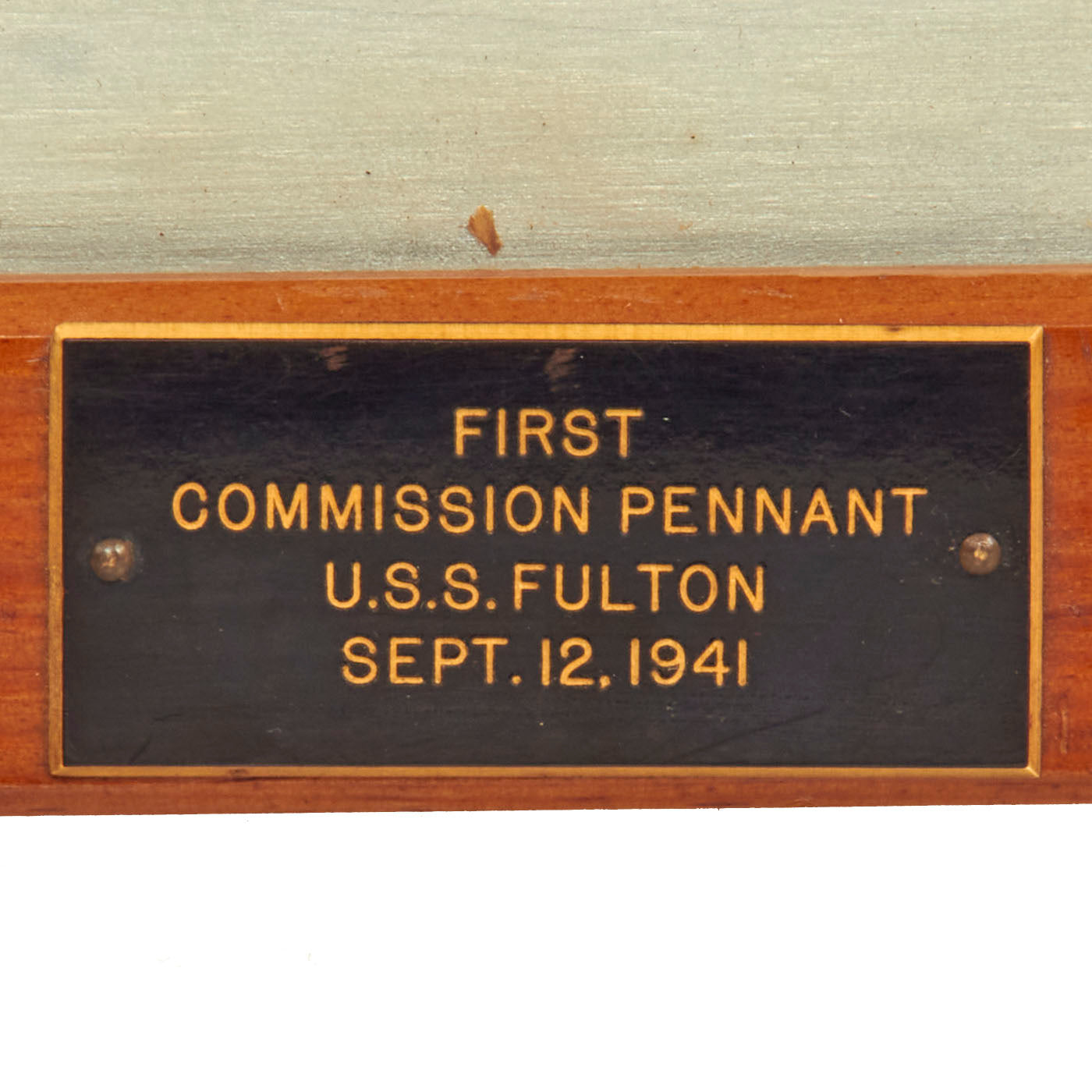 Original Item: One of a Kind. This is the first Commission Pennant from the launching of the U.S.S. Fulton from September 12, 1941. Traditionally, these pennants are flown from the masthead, a tradition that has continued to the present day from hundreds of years ago. This particular pennant came from the Submarine Tender the U.S.S. Fulton, which served in the Pacific Theater during WWII. The pennant comes in a circa 1960s vintage frame with a plaque attached.