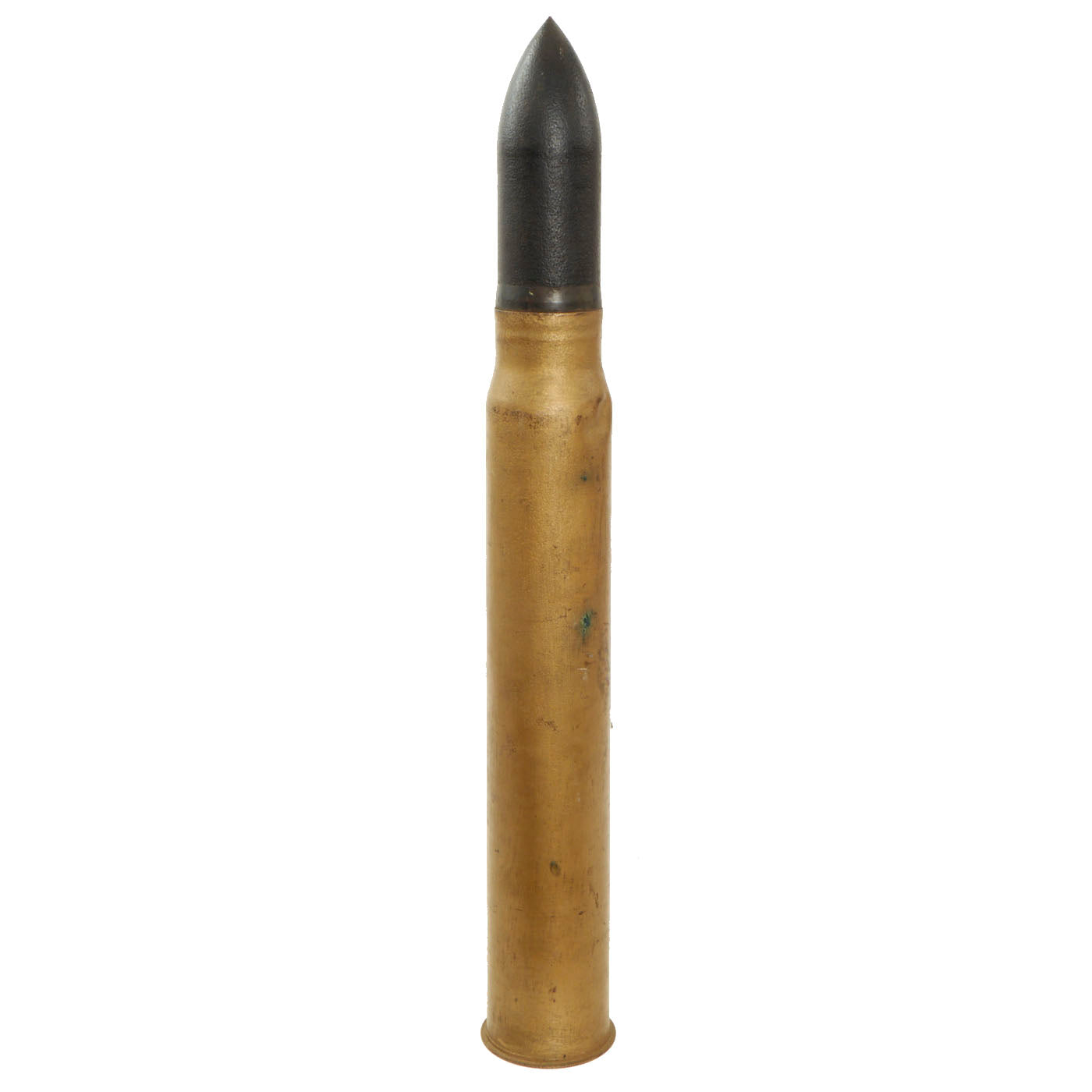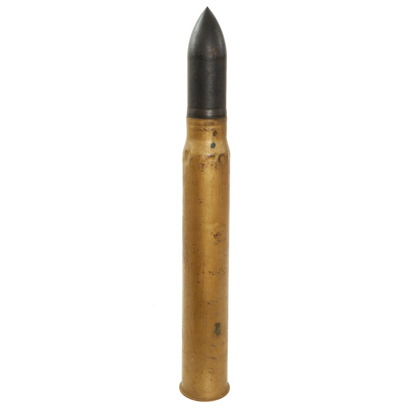 • Original Item: Only One Available. This drill round was designed for the U.S. Navy 3 in. / 50 calibers Dual Purpose Rifled QF Naval gun. This was never a “real” round and was made only for practice purposes. It is completely inert, and cannot be converted to any type of explosive device. The shell weighs 20.2 lbs (9.2kg) and measures 32 inches in overall length.