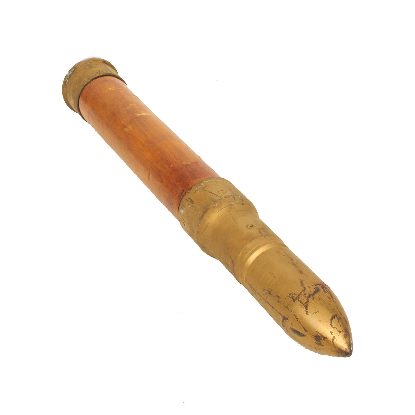 The round is in very good condition and is weighted to match a live shell for accurate training handling purposes. The base plate is brass, and unfortunately has quite a bit of oxidation around the edges, which have made the original markings impossible to see. The wood condition is very good, with a lovely dark matured color, and this example also features a solid Steel warhead, with no fuse. The warhead has been painted gold, while the fitting below it has also been painted gold to match the base.