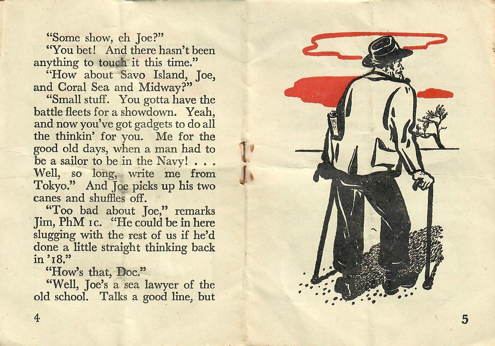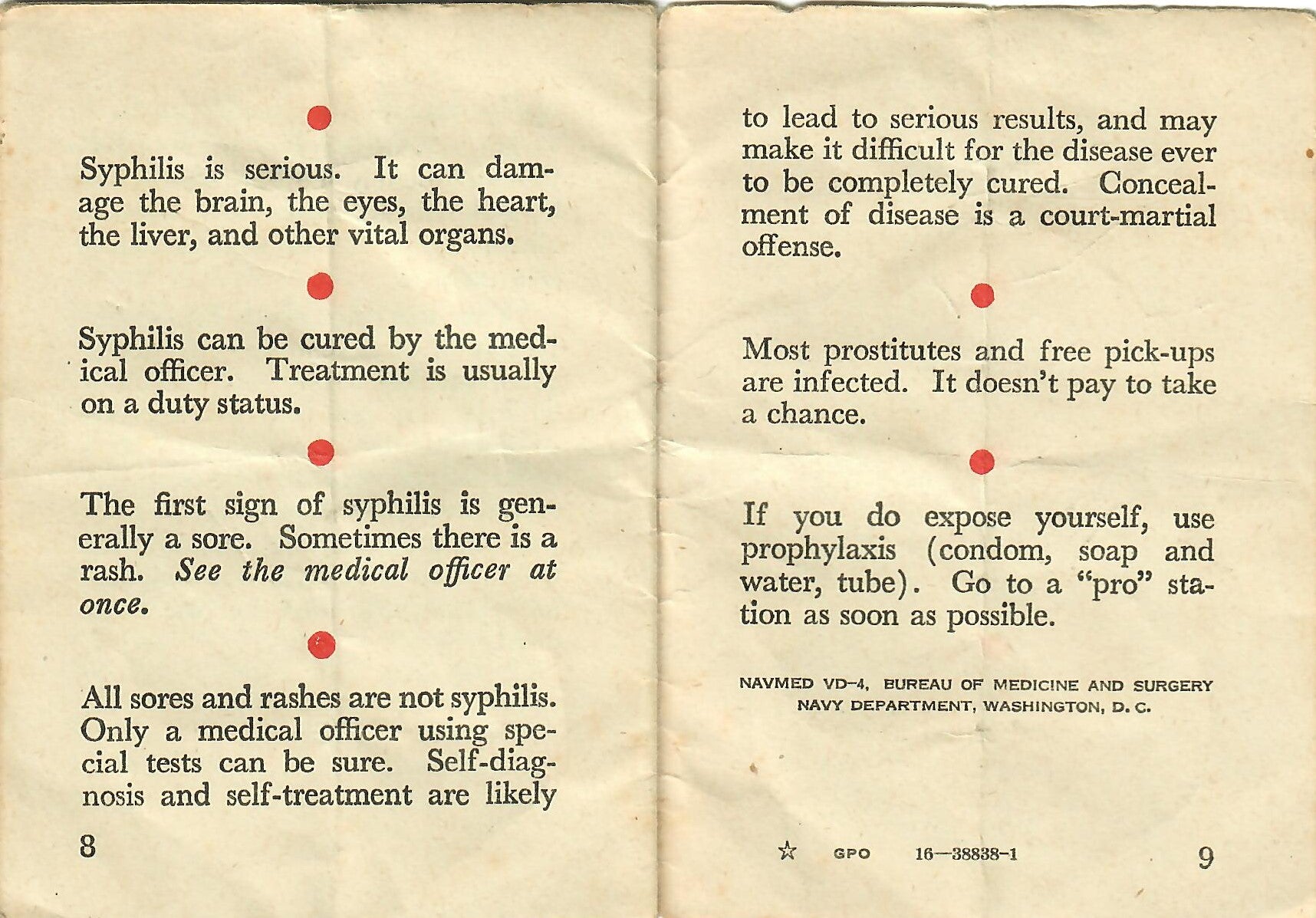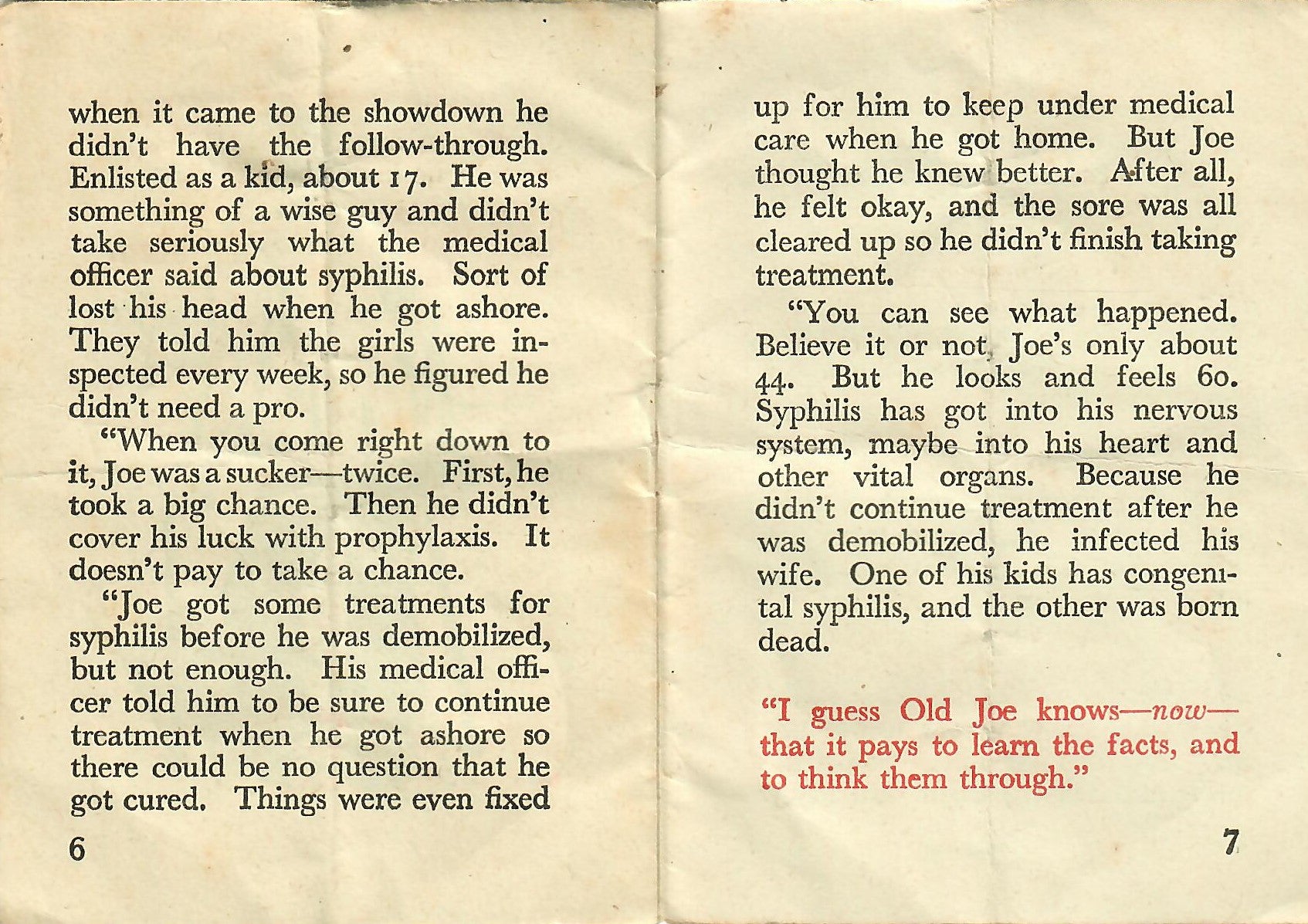 “The Story of Old Joe”. This U.S. Navy published booklet contains the tale of a WWI Navy Veteran who had just a little too much fun while on shore leave and subsequently contracted syphilis. Joe, sadly, did not used his issued Prophylaxis, nor did he follow his medical orderlies advise to continue treatment. Now, Joe, at the ripe age of 44 appears to be 60 years of age. He has given his family syphilis, and his world as he knows it is falling apart. The booklet is marked “NAVMED VD-4, BUREAU OF MEDICINE AND SURGERY/ NAVY DEPARTMENT, WASHINGTON, D.C.
