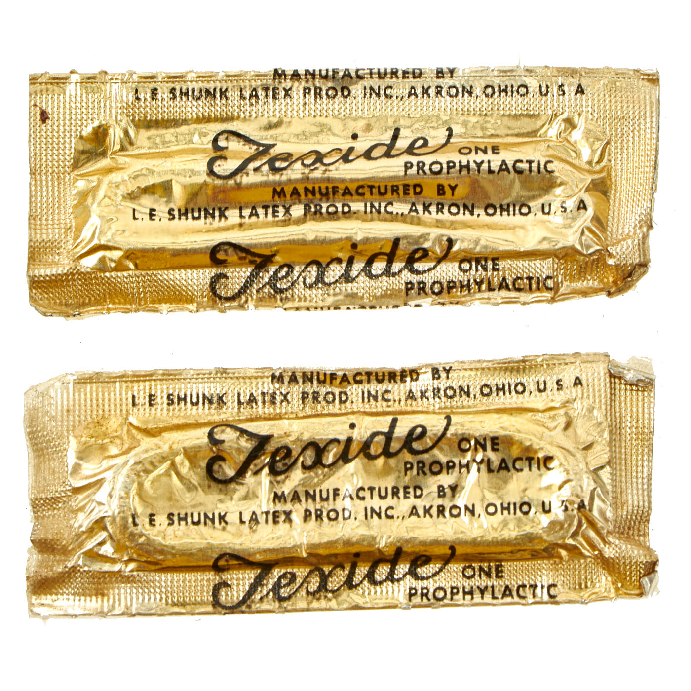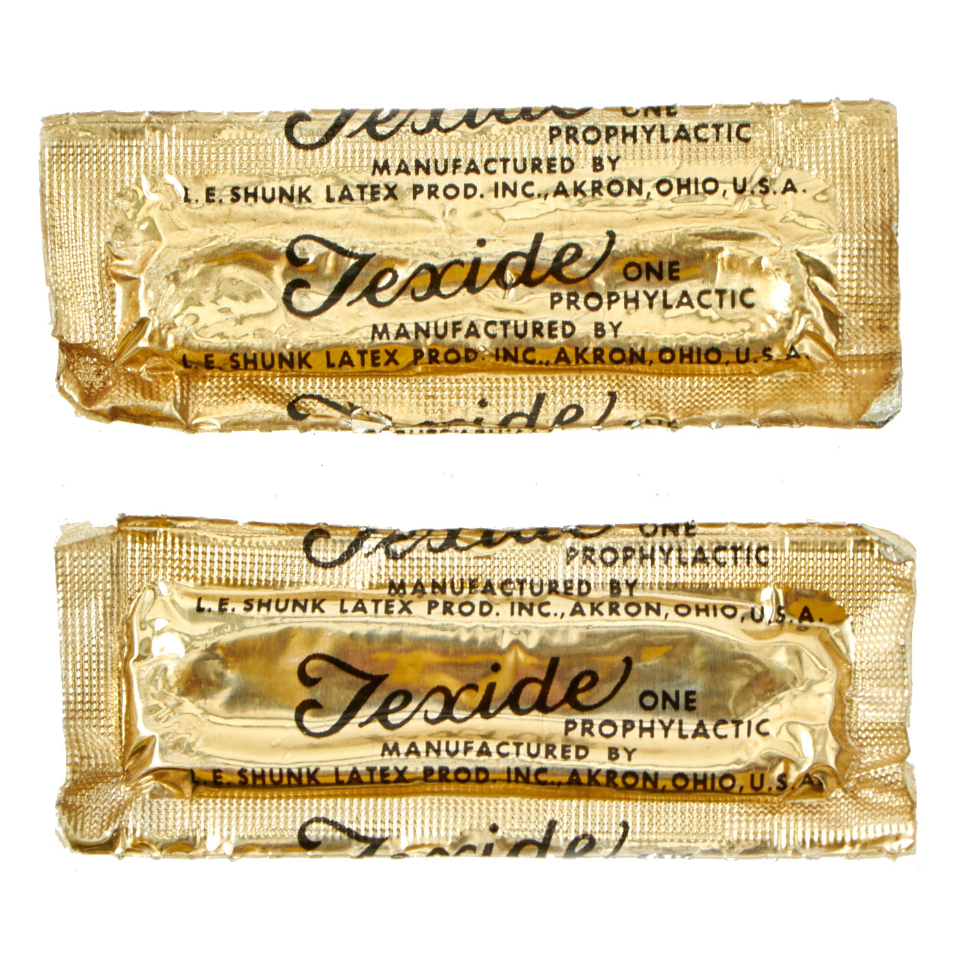 Two “Texide” Brand (Prophylactics) Condoms, each sealed in their original foil/cellophane wrappers. Manufactured by the L.E. Shunk Latex Products Company of Akron, Ohio.