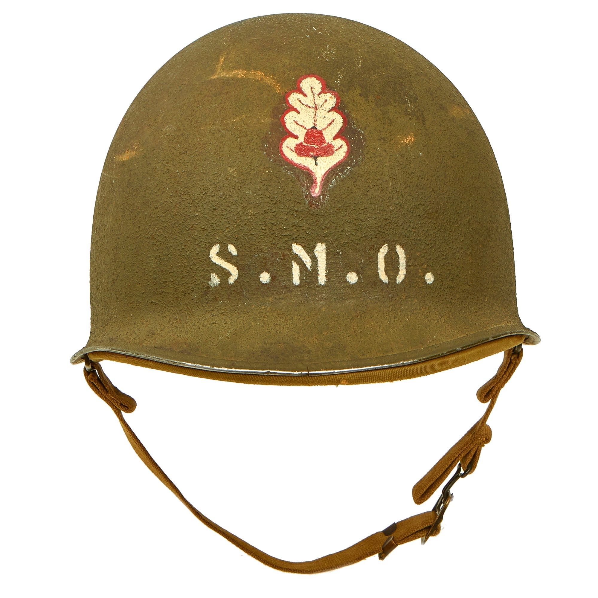 Condition of the shell is quite nice, with only a few scratches, and the paint retained very well. There is also still a lot of paint on the Stainless Steel rim, which was prone to wear. The shell does have a few stress cracks, common due to the "high dome" design of the M1. The front of the helmet has the Oak Leaf and Acorn insignia of the US Navy Medical Corps above the initials S.M.O. for senior medical officer.